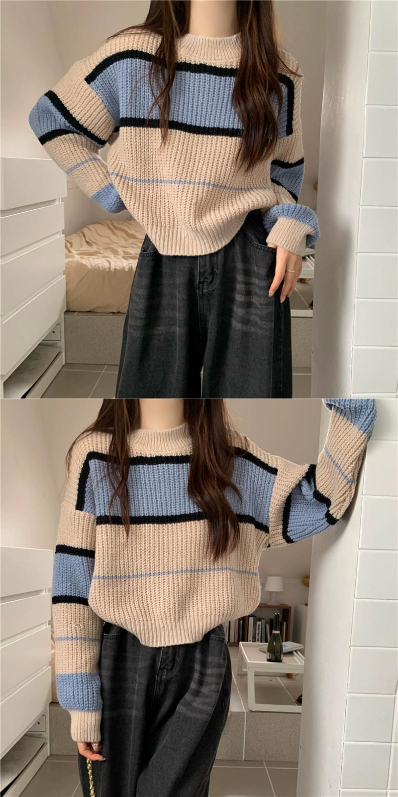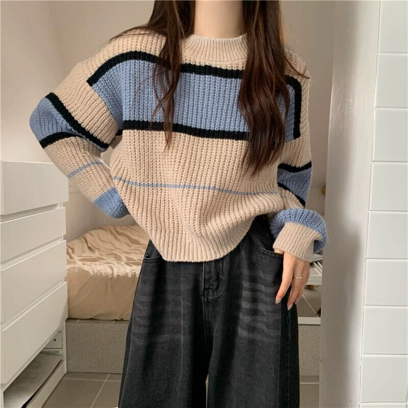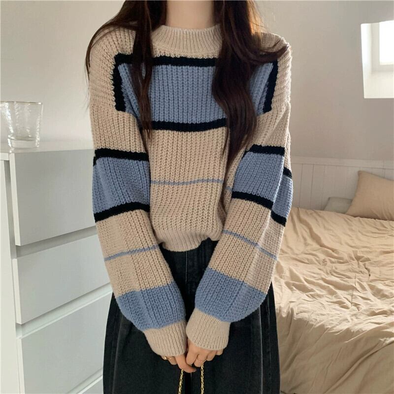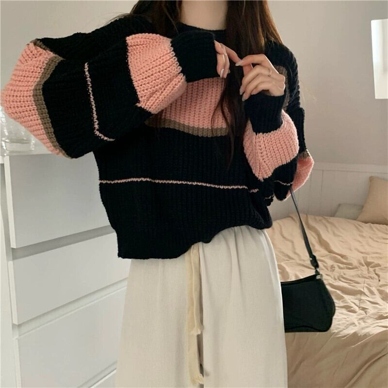 コントラストカラーのストライプの太いラインのセーターの女性の秋と冬 2023 新しいレトロなルーズアウターウェア怠惰なスタイルのプルオーバーニットトップ オータム 秋物 ウィンター 冬物 7460067389751190 | framboise21