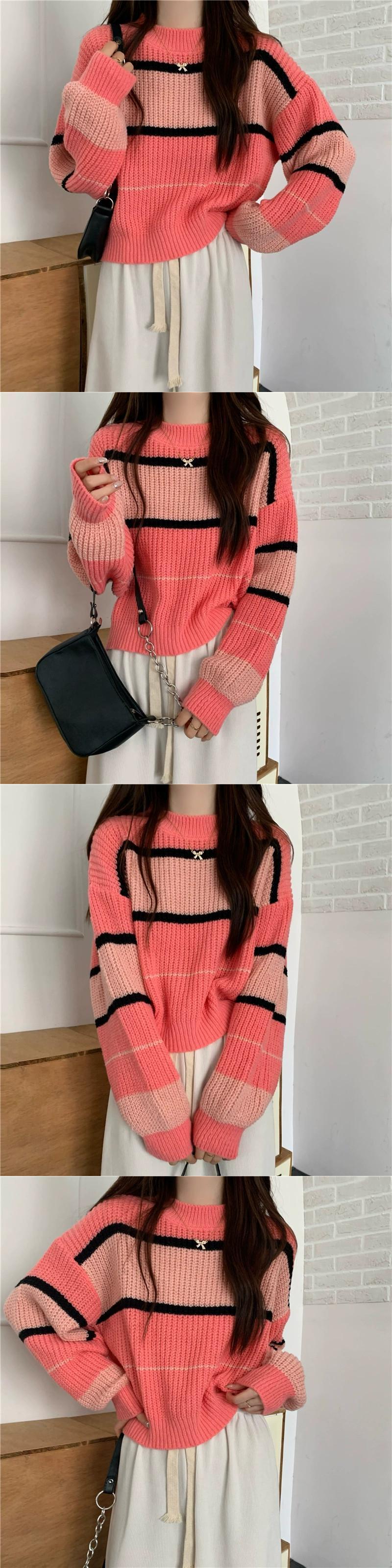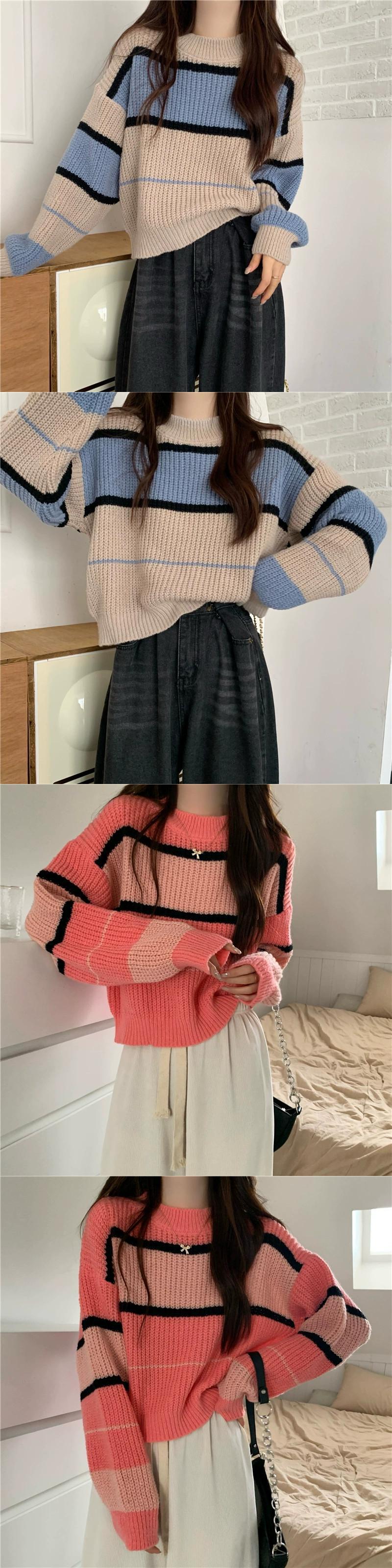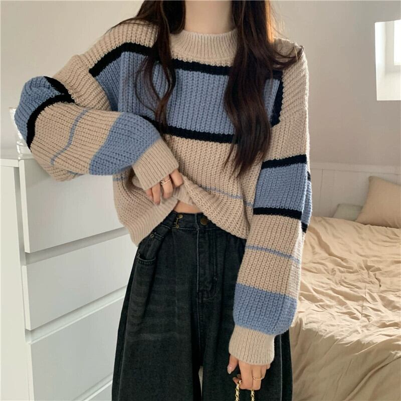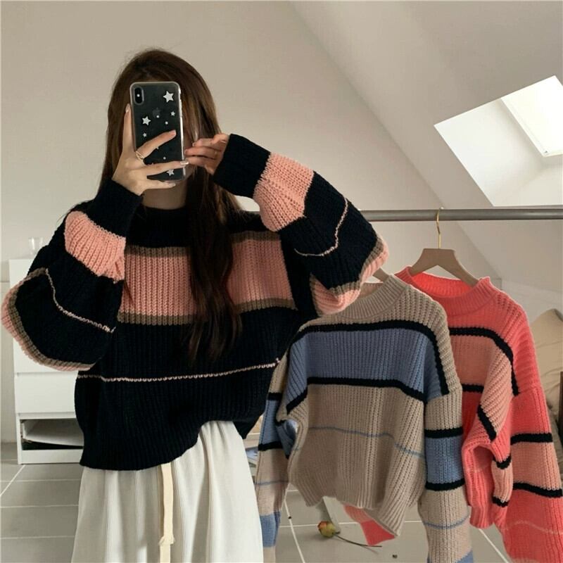 コントラストカラーのストライプの太いラインのセーターの女性の秋と冬 2023 新しいレトロなルーズアウターウェア怠惰なスタイルのプルオーバーニットトップ オータム 秋物 ウィンター 冬物 7460067389751190 | framboise21