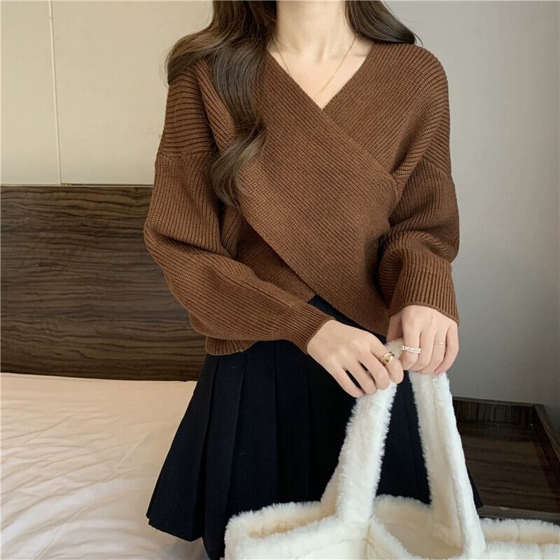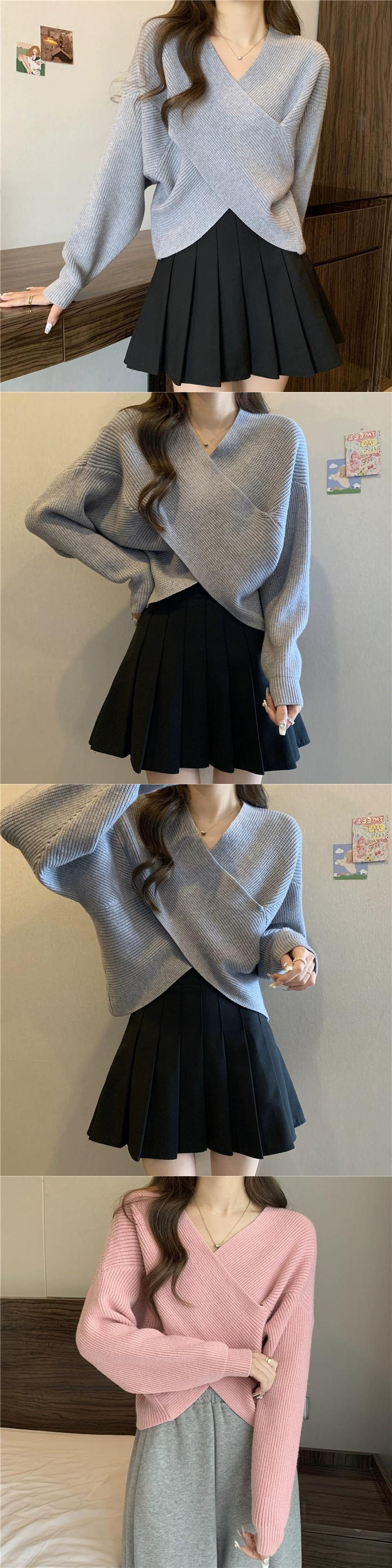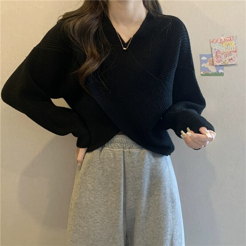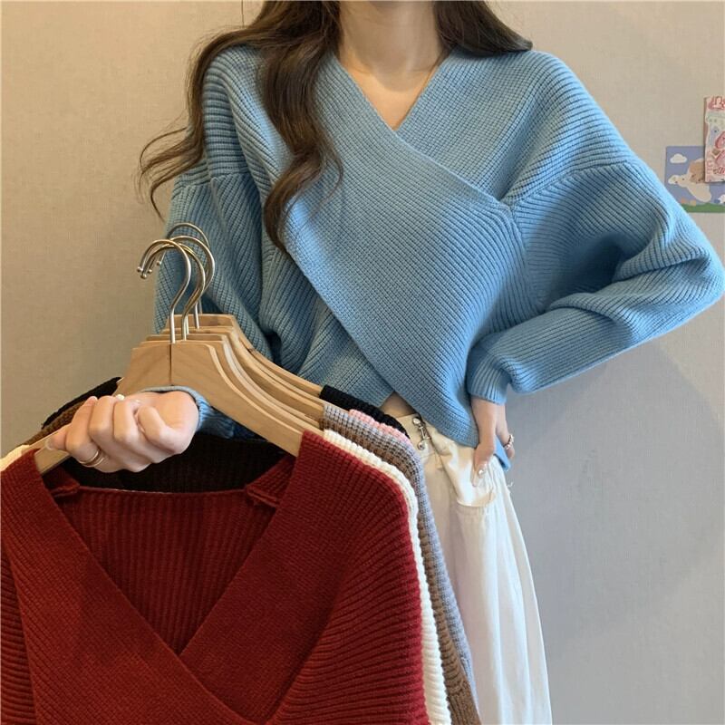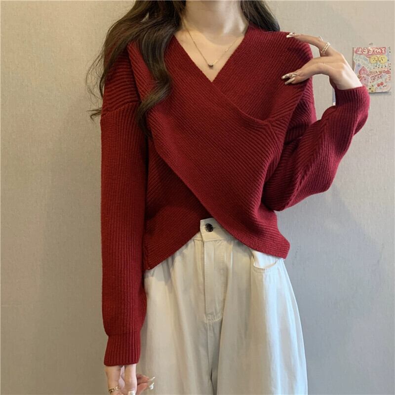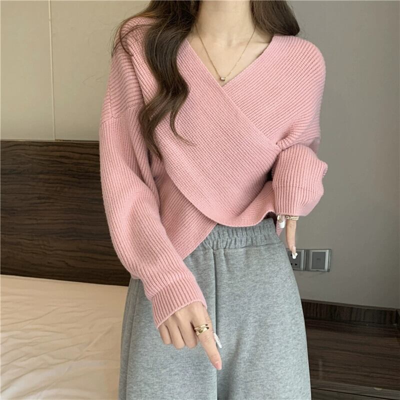 秋と冬の不規則な短いピンクのセーターの女性、スタイリッシュでルーズなアウターウェアプルオーバークロスVネックセーター ショート オータム 秋物 ウィンター 冬物 7460038044479006 | framboise21