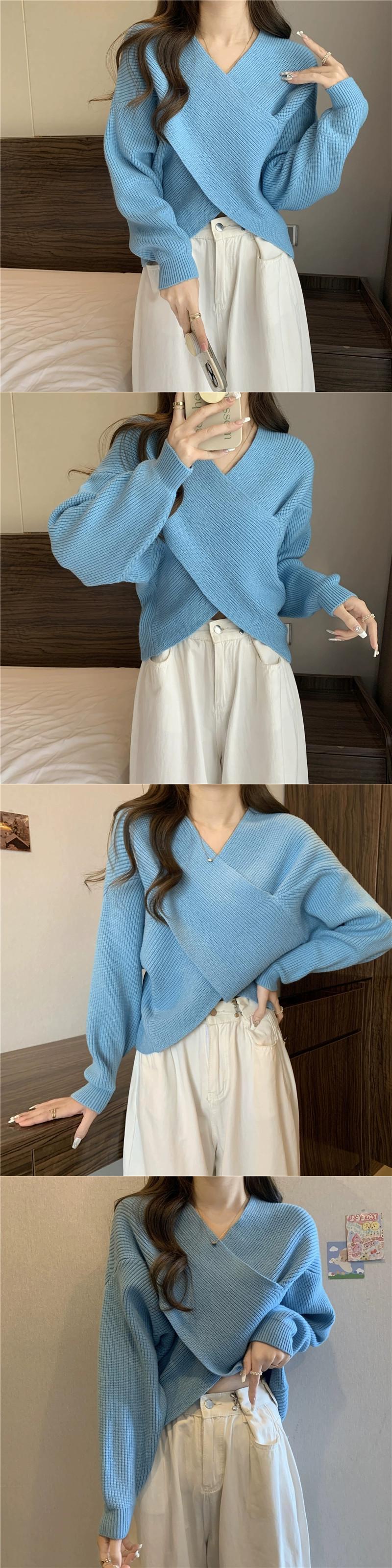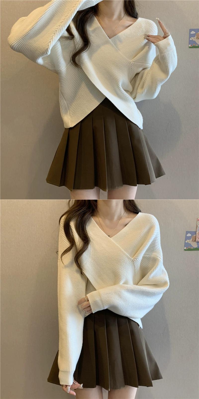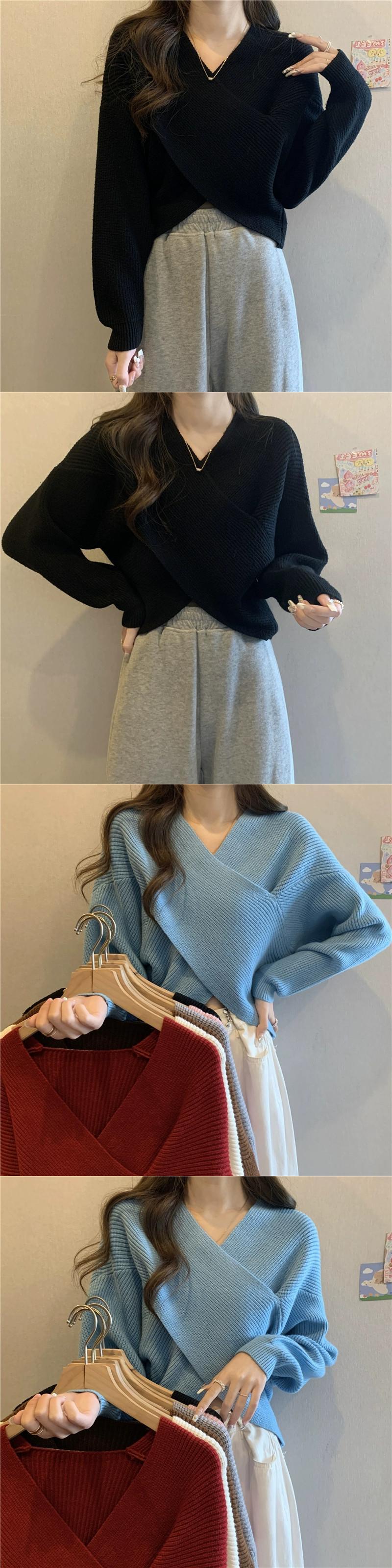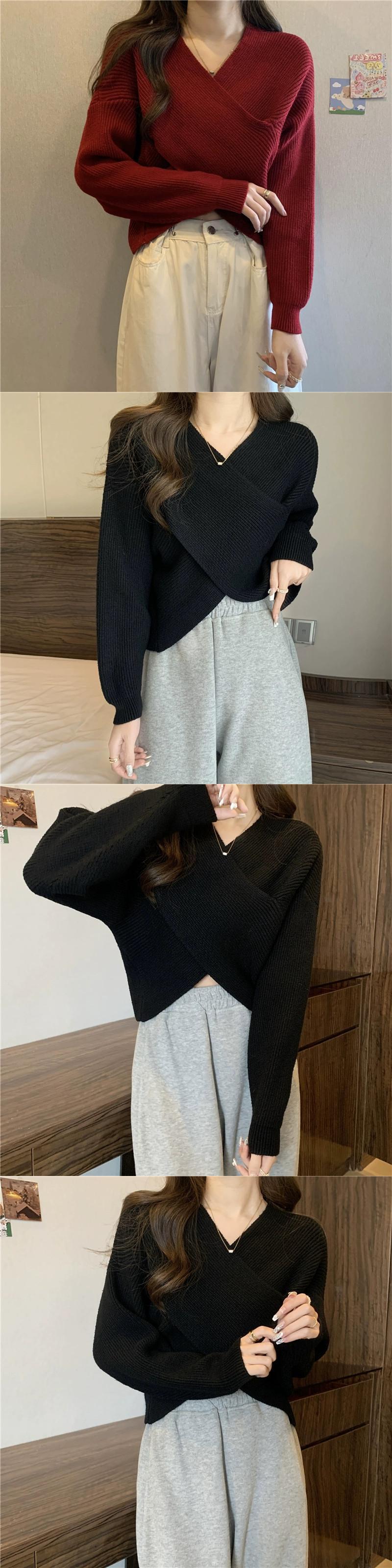 秋と冬の不規則な短いピンクのセーターの女性、スタイリッシュでルーズなアウターウェアプルオーバークロスVネックセーター ショート オータム 秋物 ウィンター 冬物 7460038044479006 | framboise21
