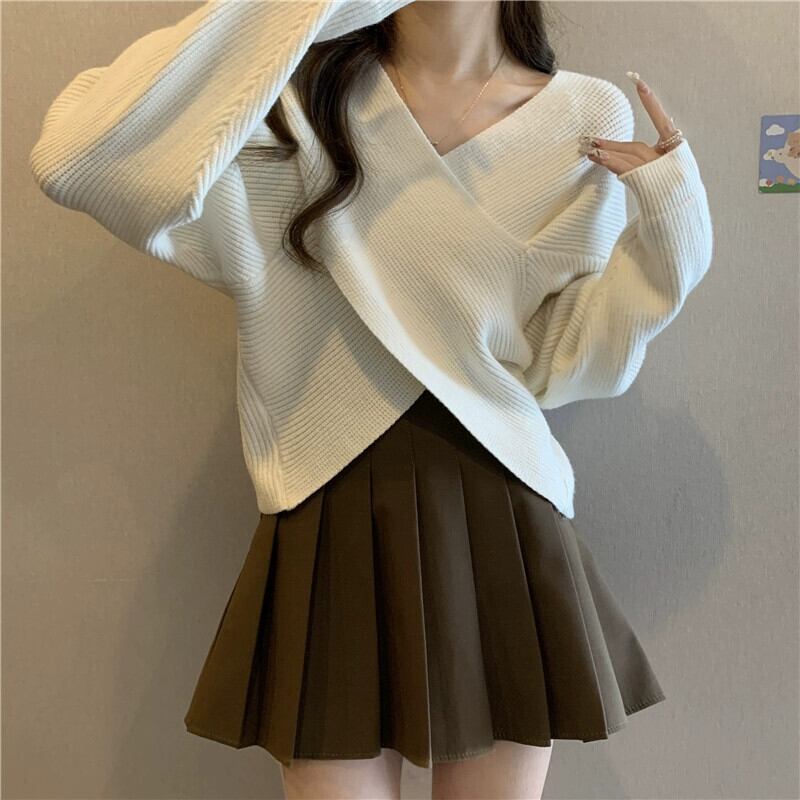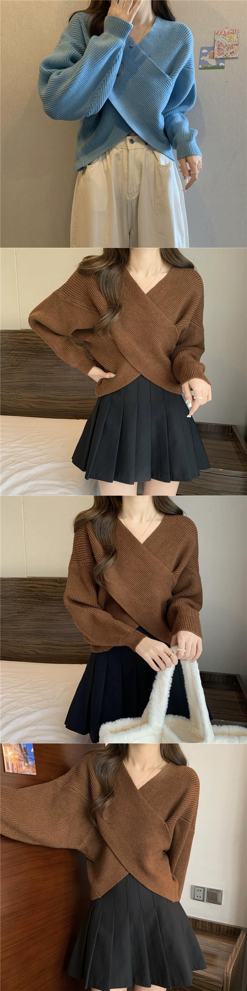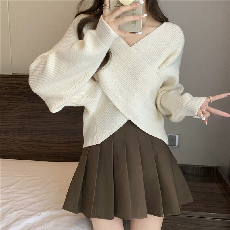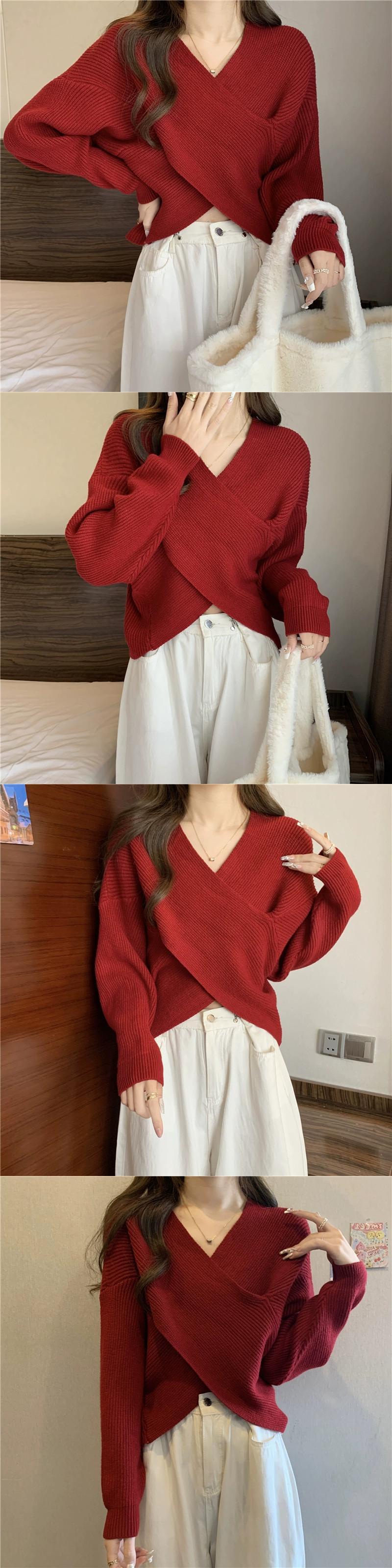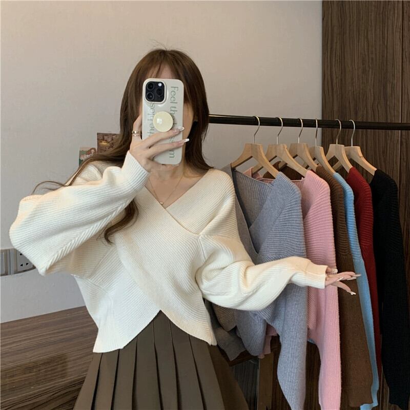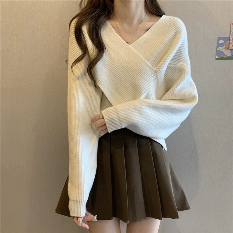 不規則なショートクロス V ネックセーターレディース、ゆったりとしたアウターウェア、Eign スタイル、万能プルオーバー長袖セーター秋と冬 ロング オータム 秋物 ウィンター 冬物 Vネック 7460024125665512 | framboise21