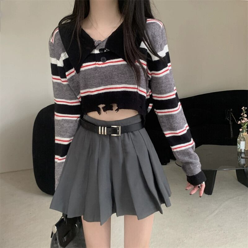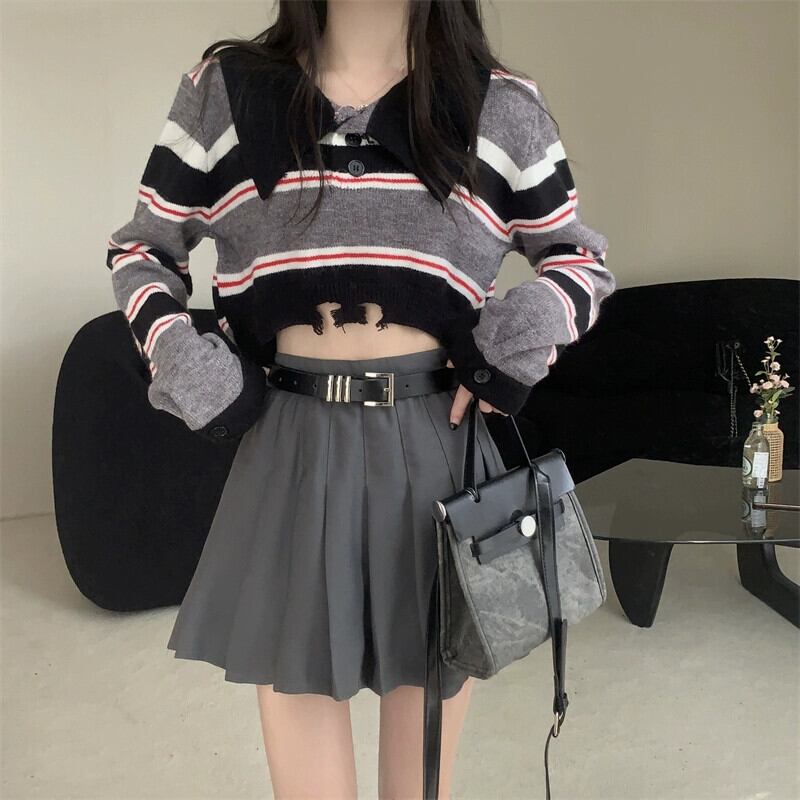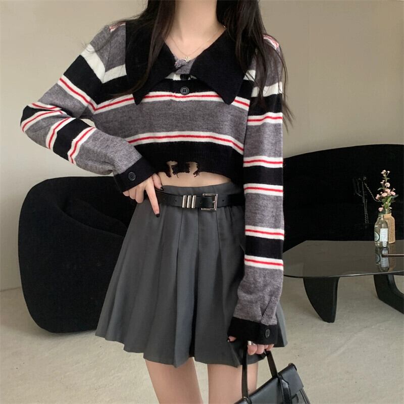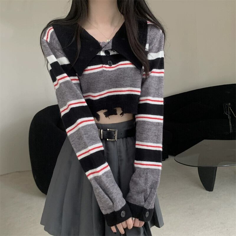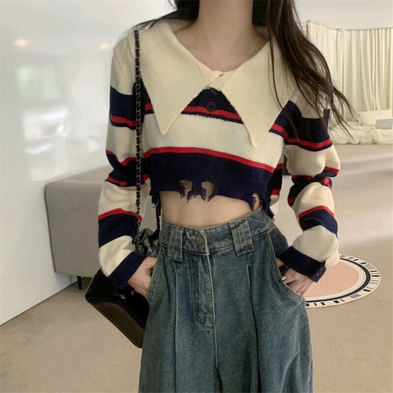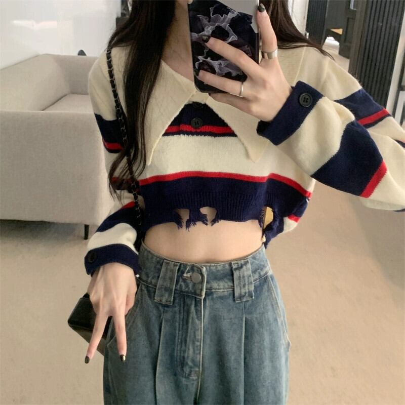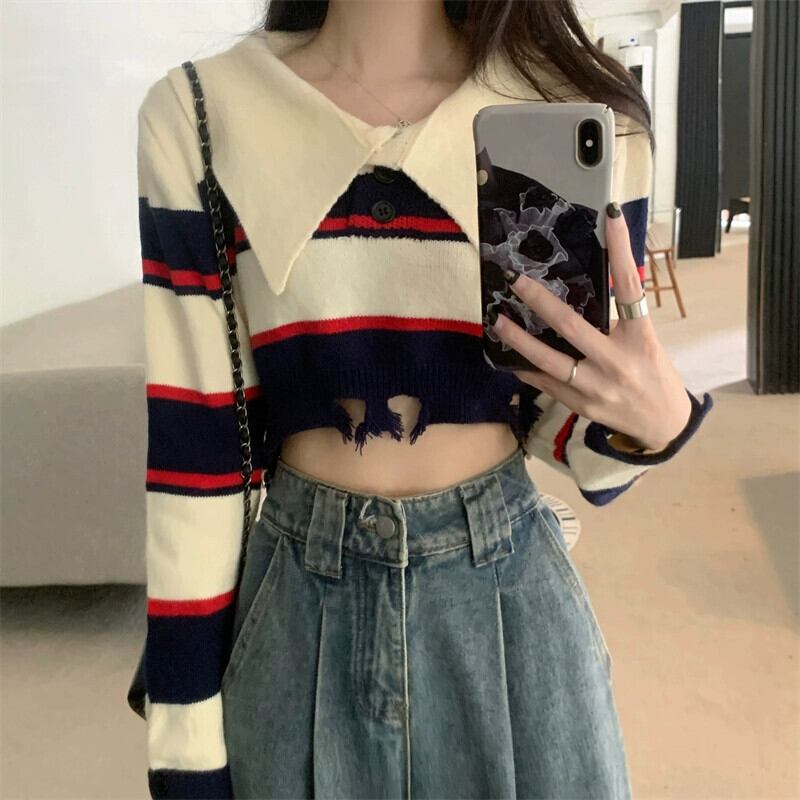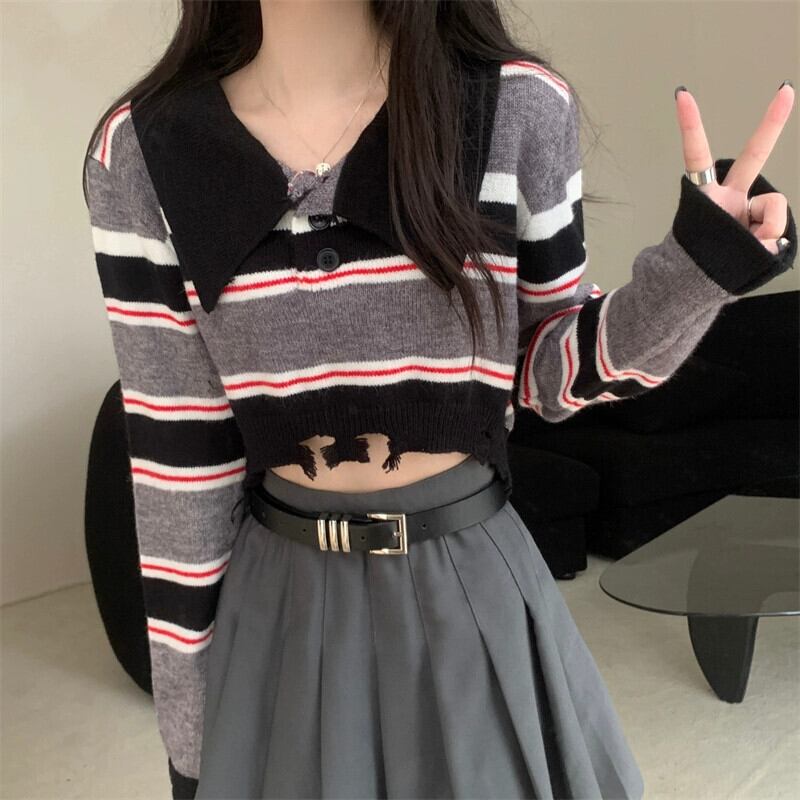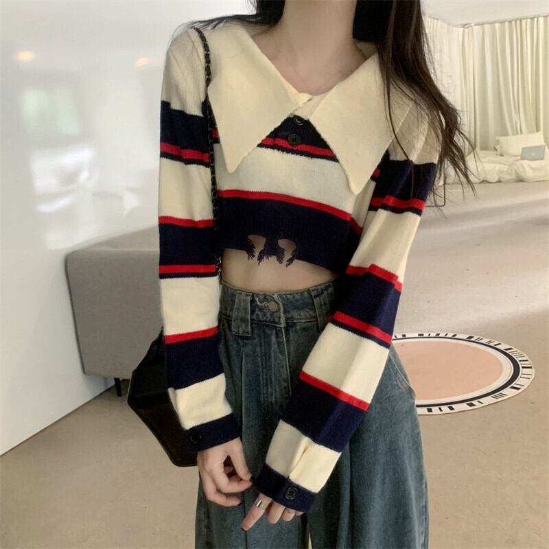 アメリカンレトロストライプショートポロカラーセーターレディース秋冬、ルーズアウター長袖セータープチネクタイ ロング オータム 秋物 ウィンター 冬物 7460027957583572 | framboise21