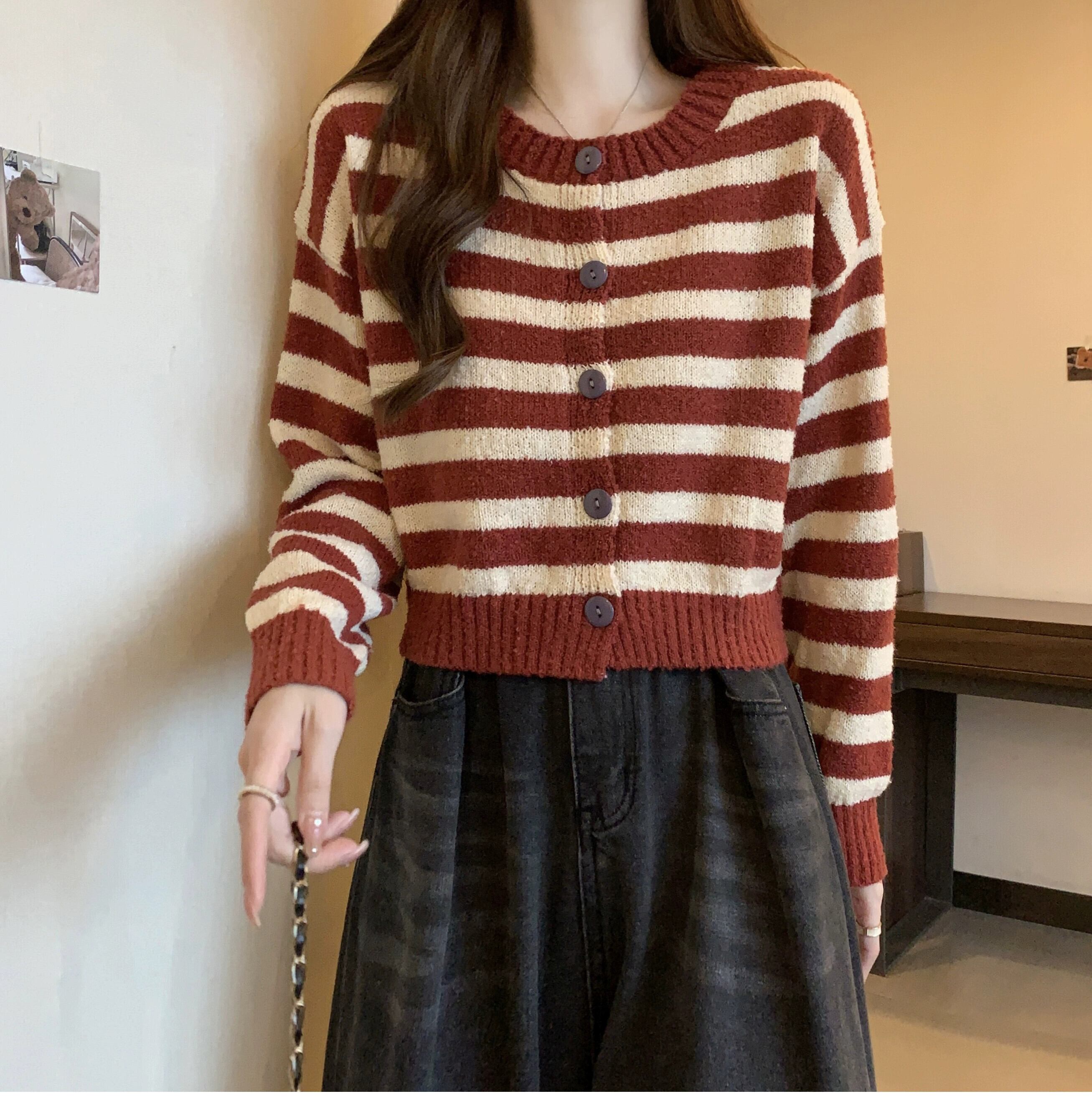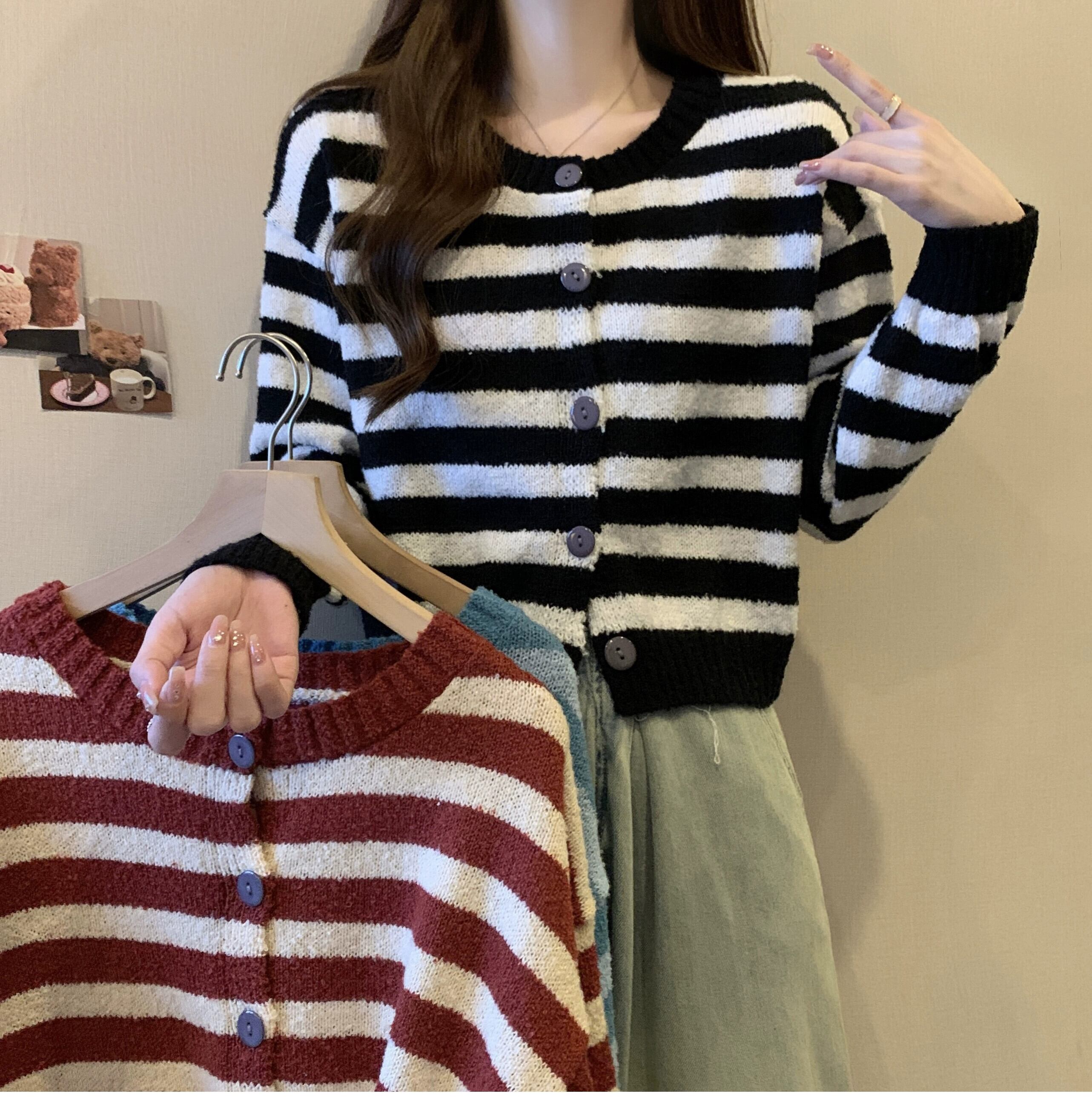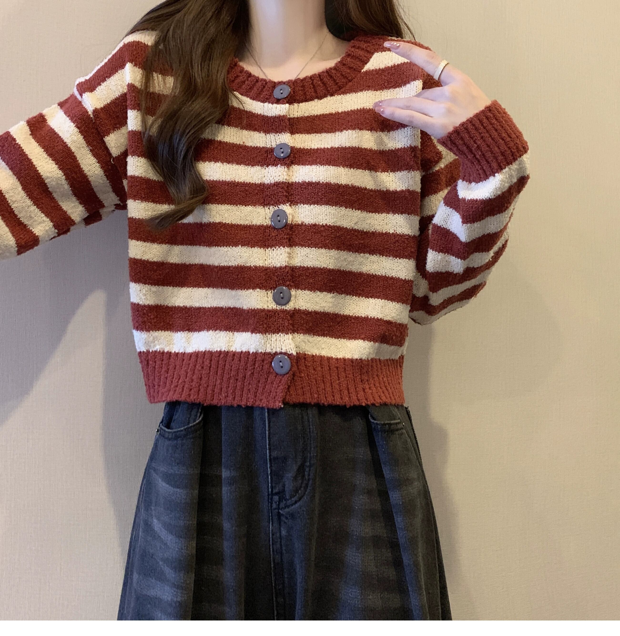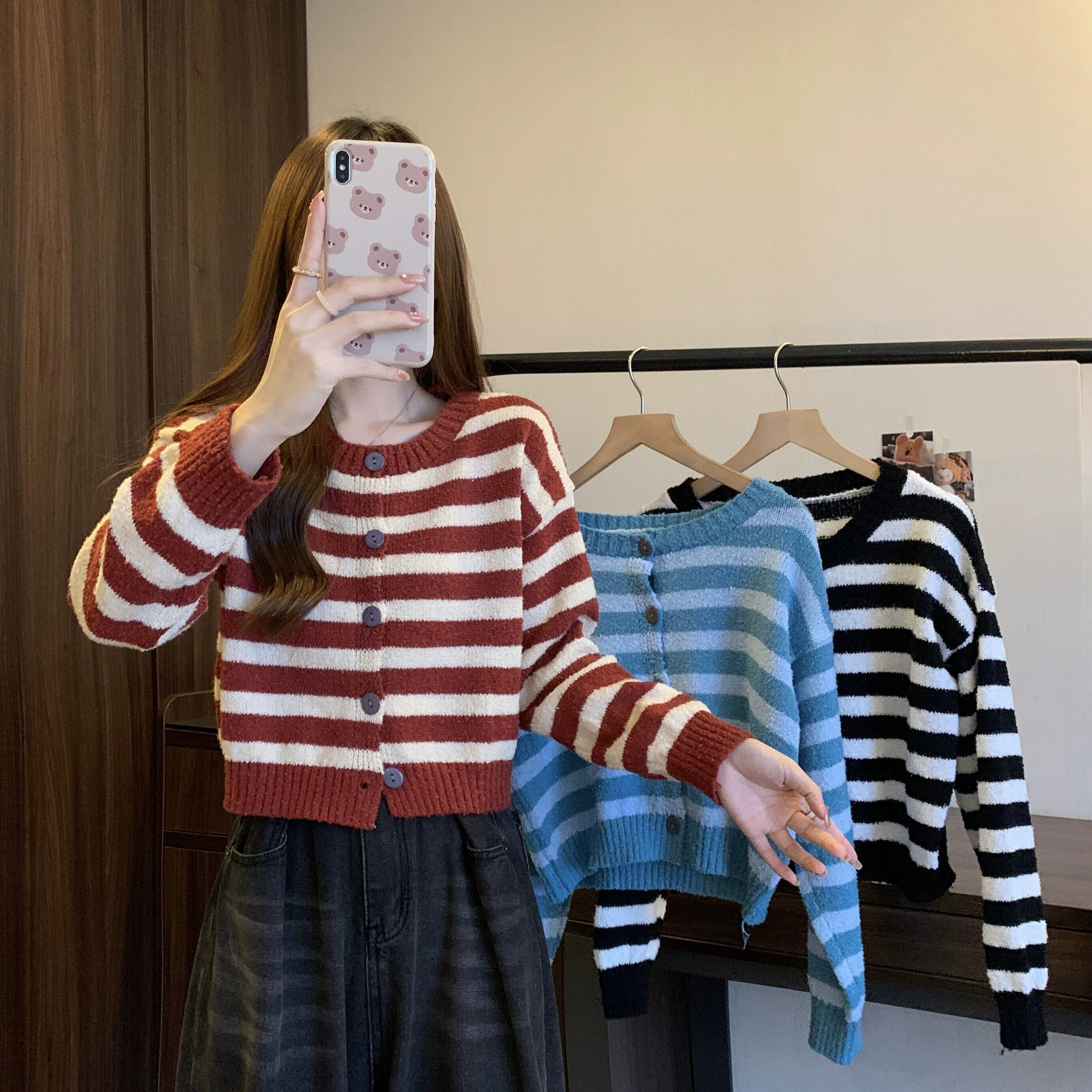 レトロなストライプのショートソフトワックスセータージャケットレディース、秋と冬のルーズなアウターウェア、怠惰なスタイル、多用途の長袖ニットカーディガン ロング オータム 秋物 ウィンター 冬物 7460020626687431 | framboise21
