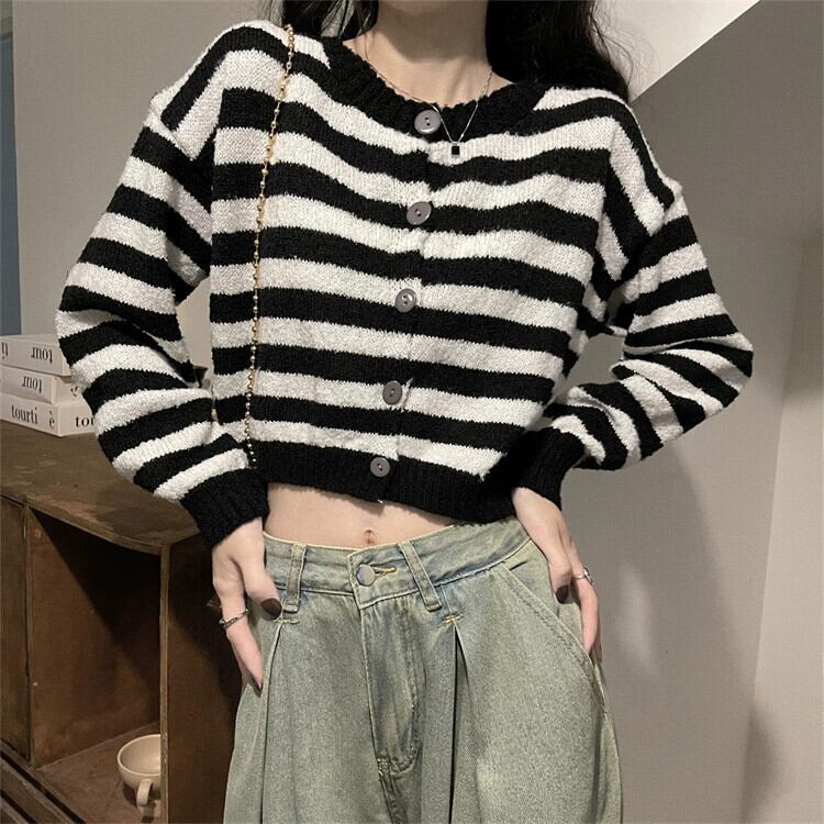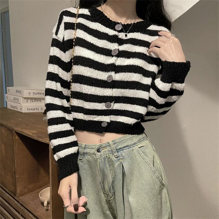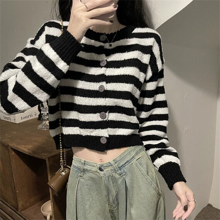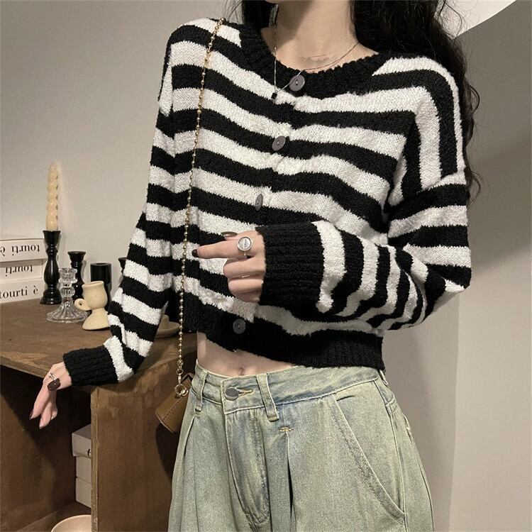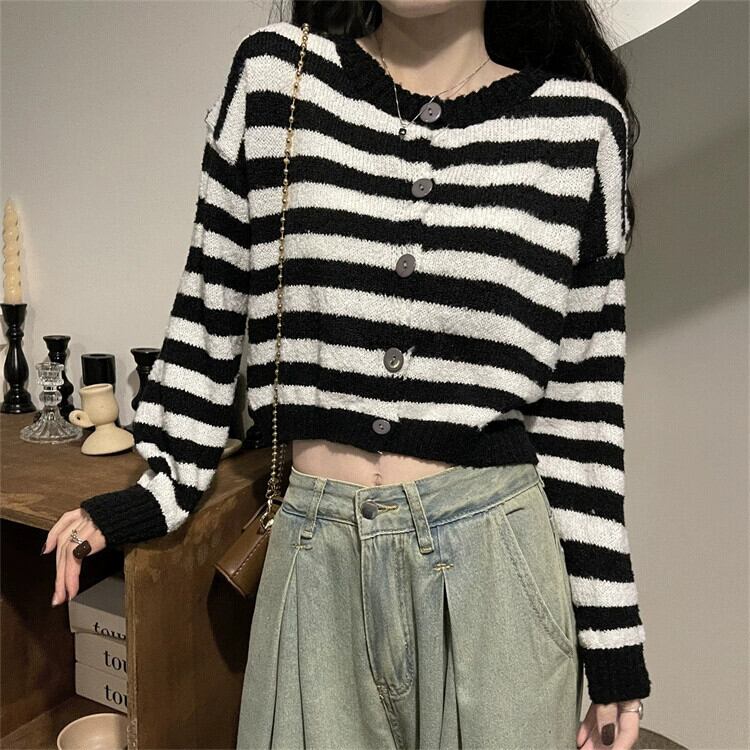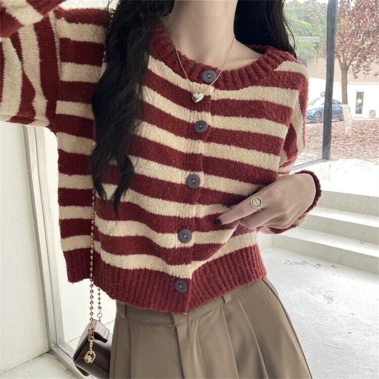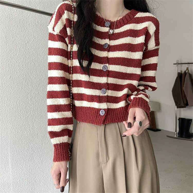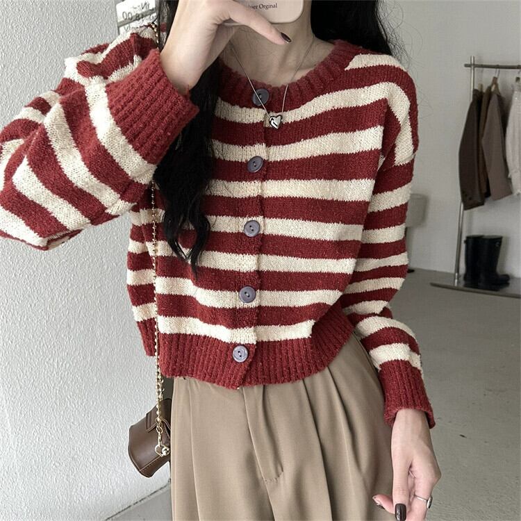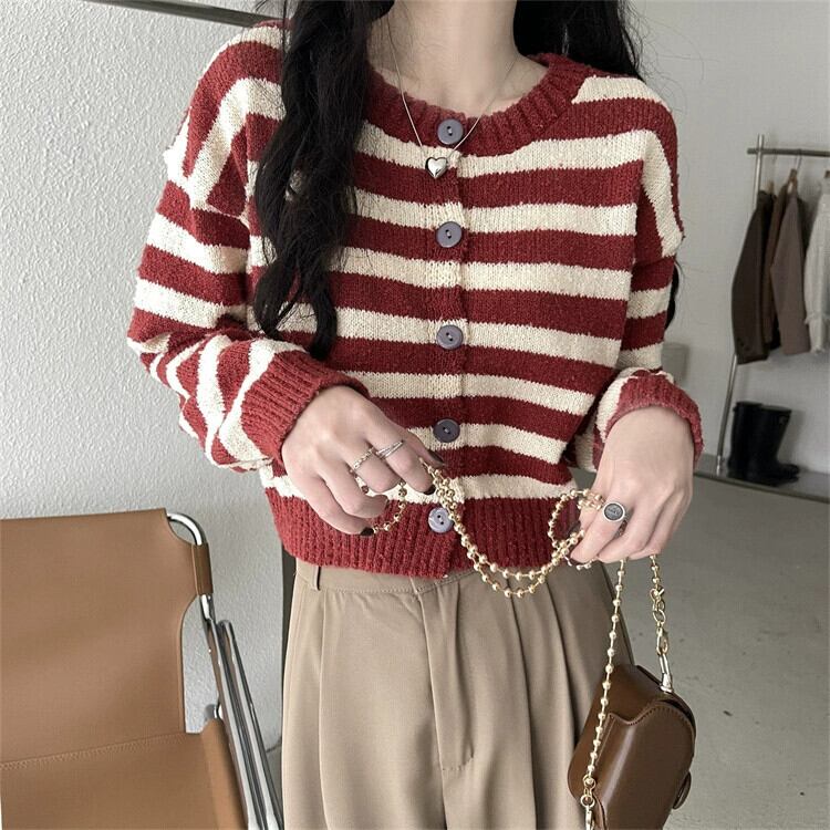 - ウエストショートストライプセータージャケットレディース、秋と冬のルーズアウターウェア、レトロスリミング、多用途の長袖ニットカーディガン ロング オータム 秋物 ウィンター 冬物 7460085342826313 | framboise21