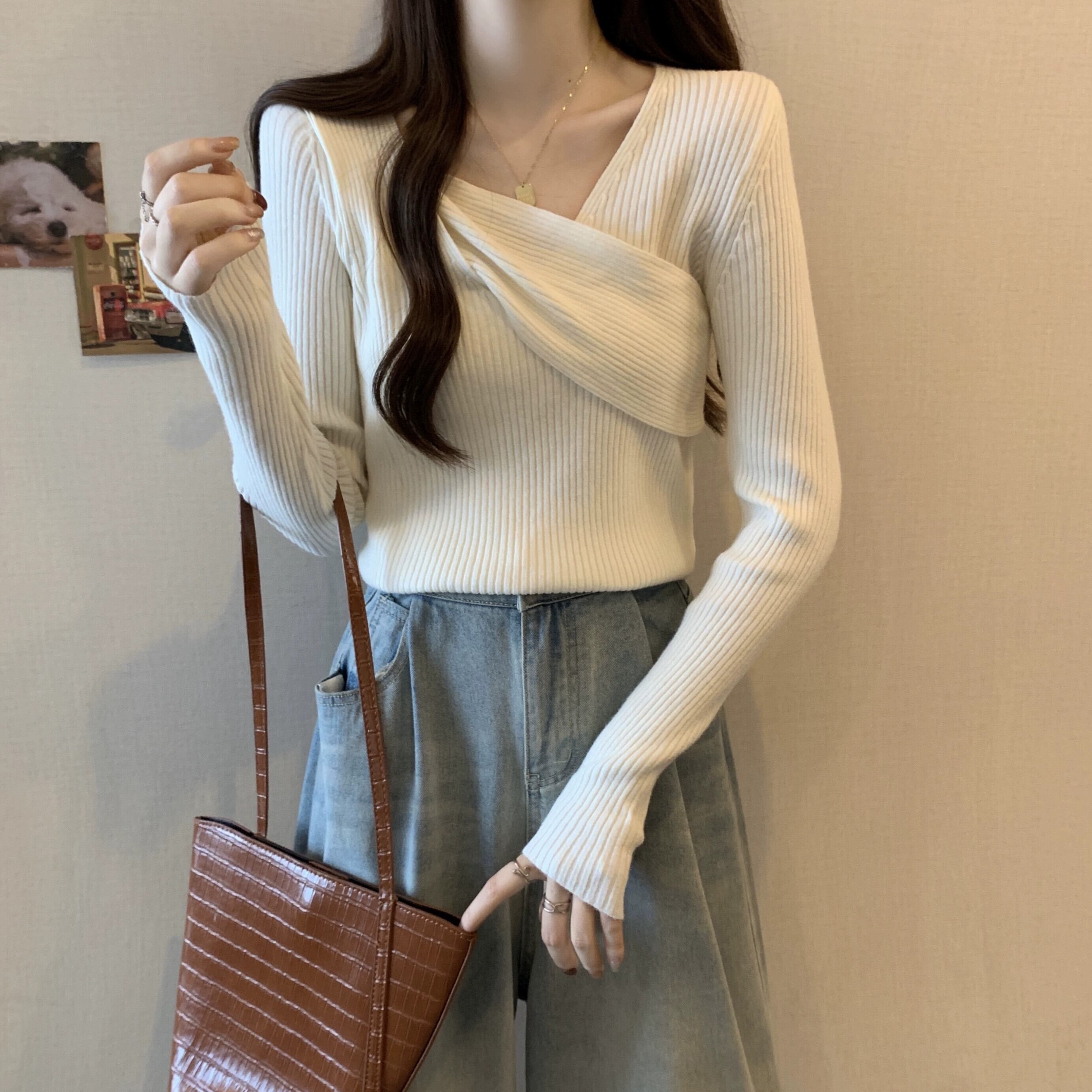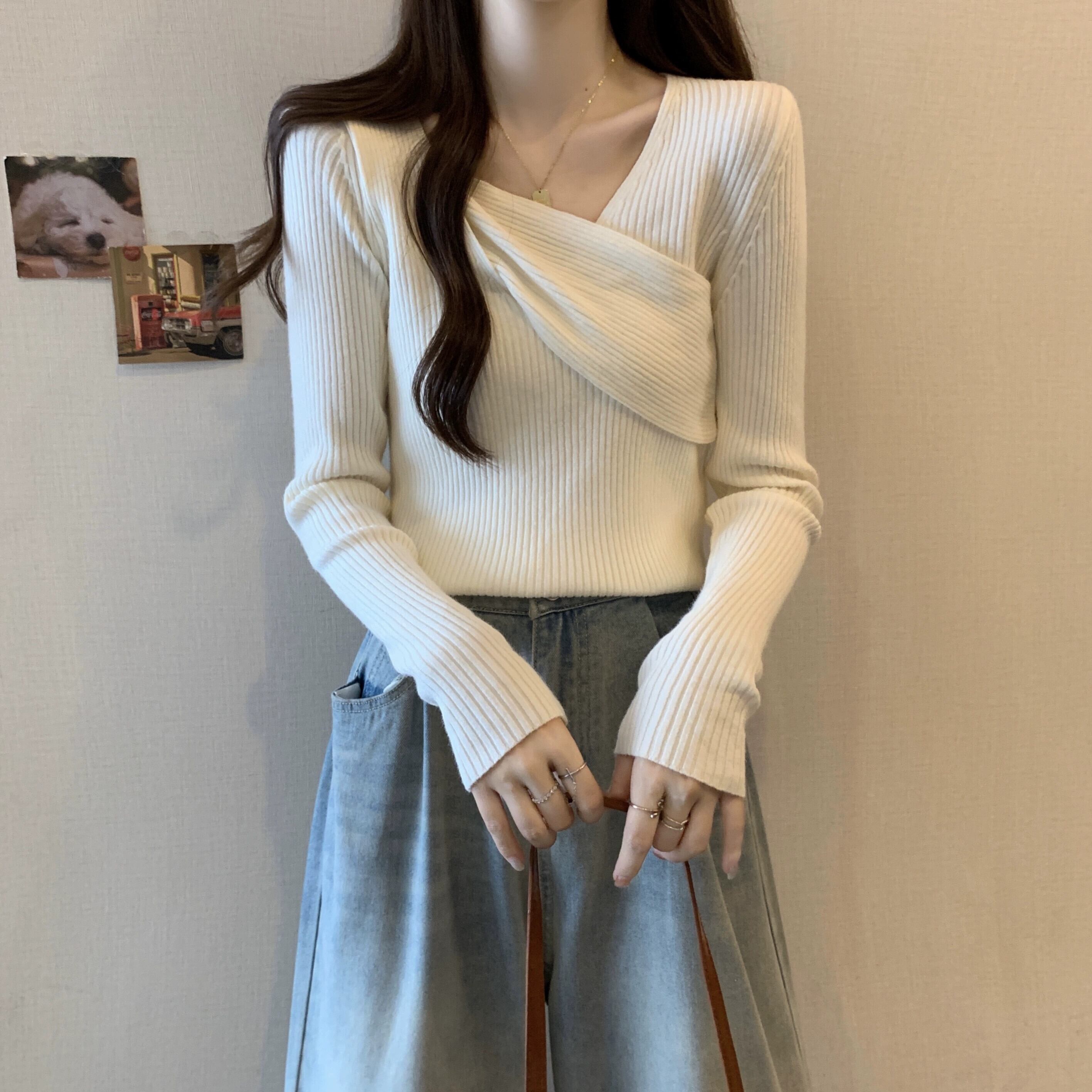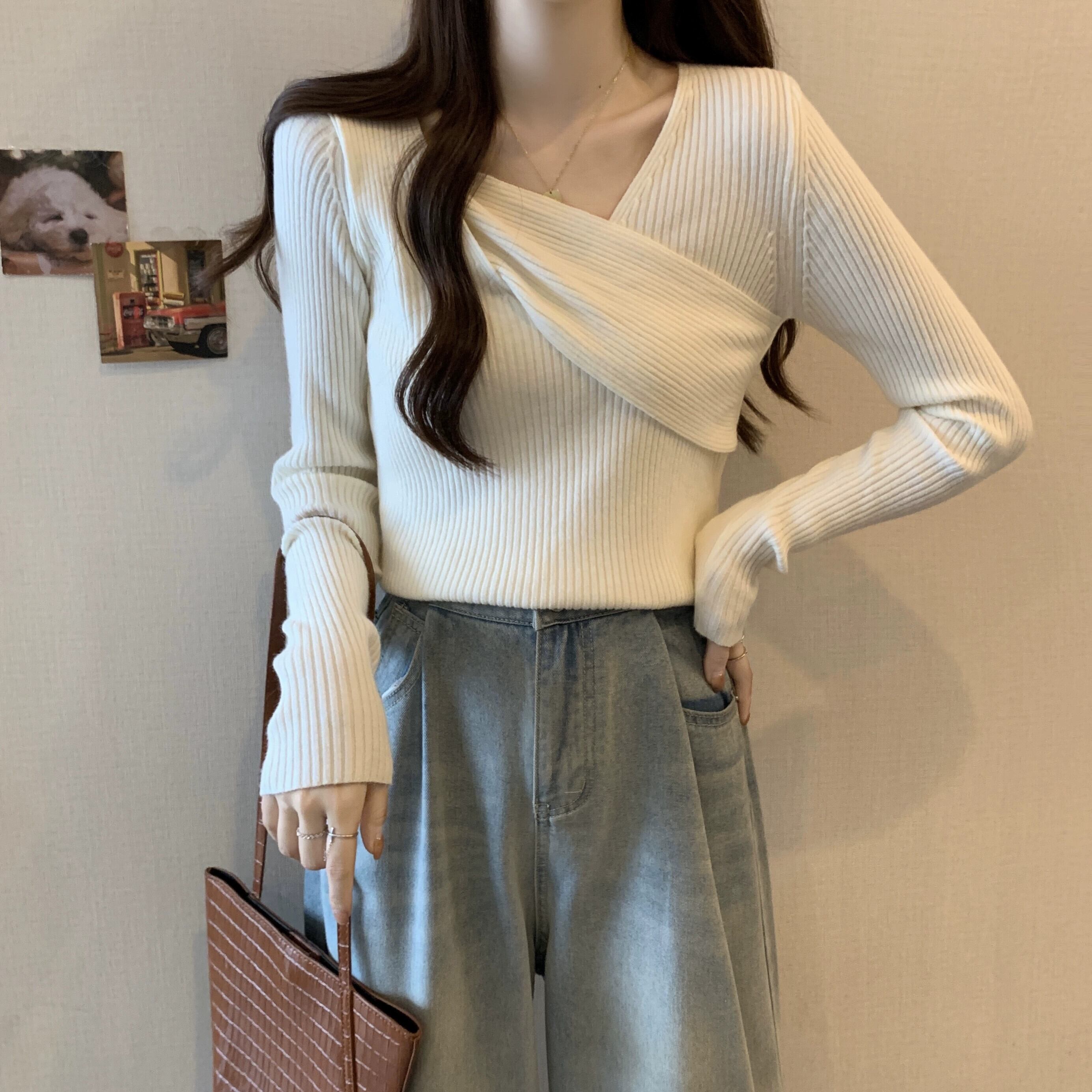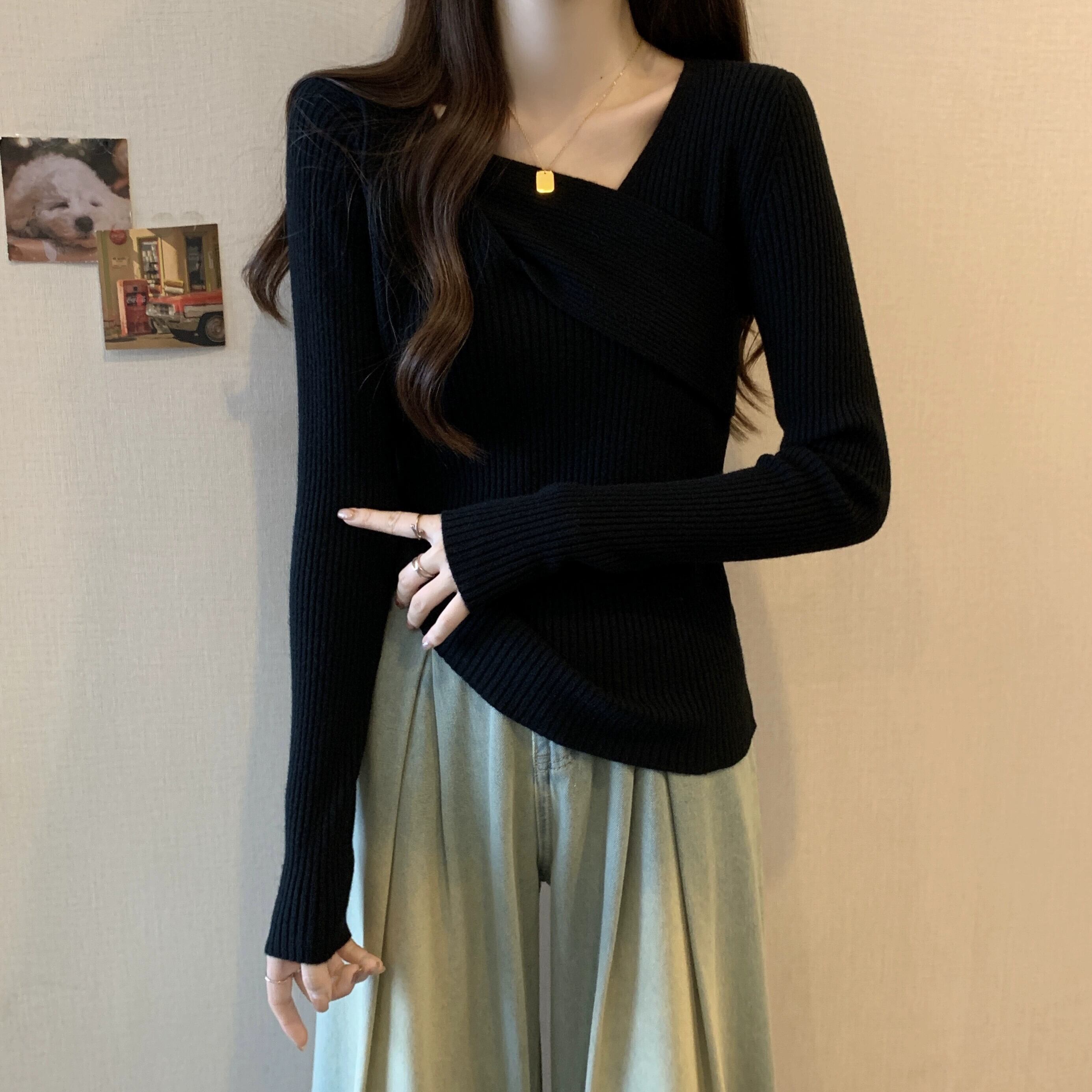 白いニットボトムシャツ 2023 新しいレディース秋冬ファッショナブルでスタイリッシュなスリムフィットインナースラントカラー長袖セーター ロング ホワイト オータム 秋物 ウィンター 冬物 7460080864376087 | framboise21