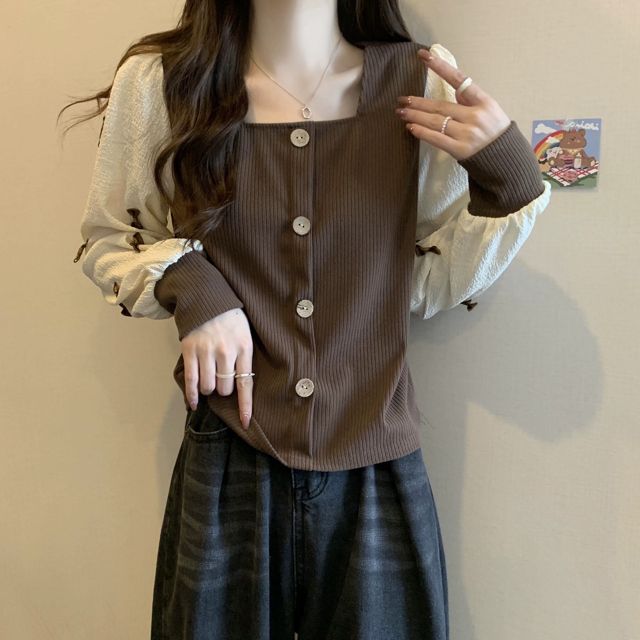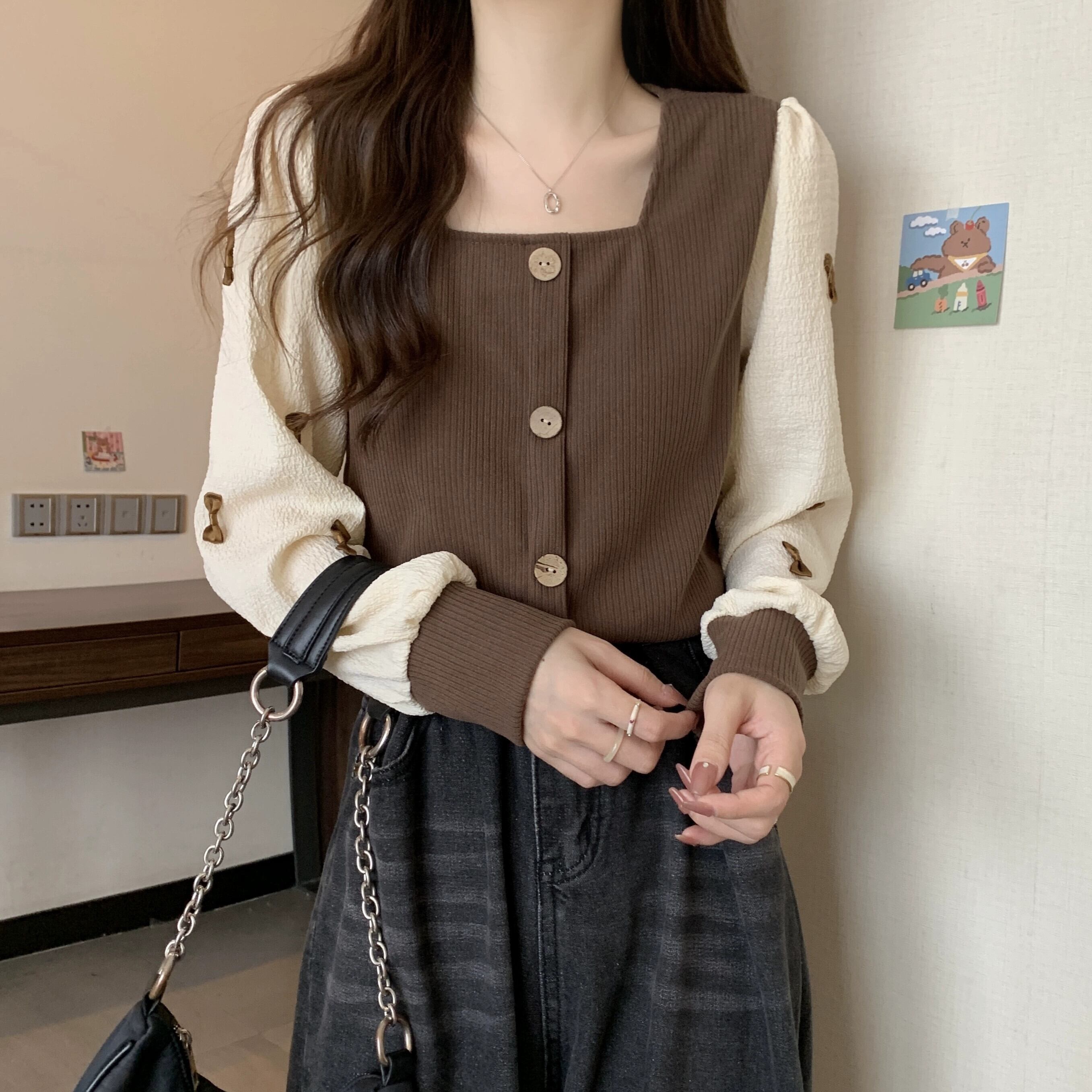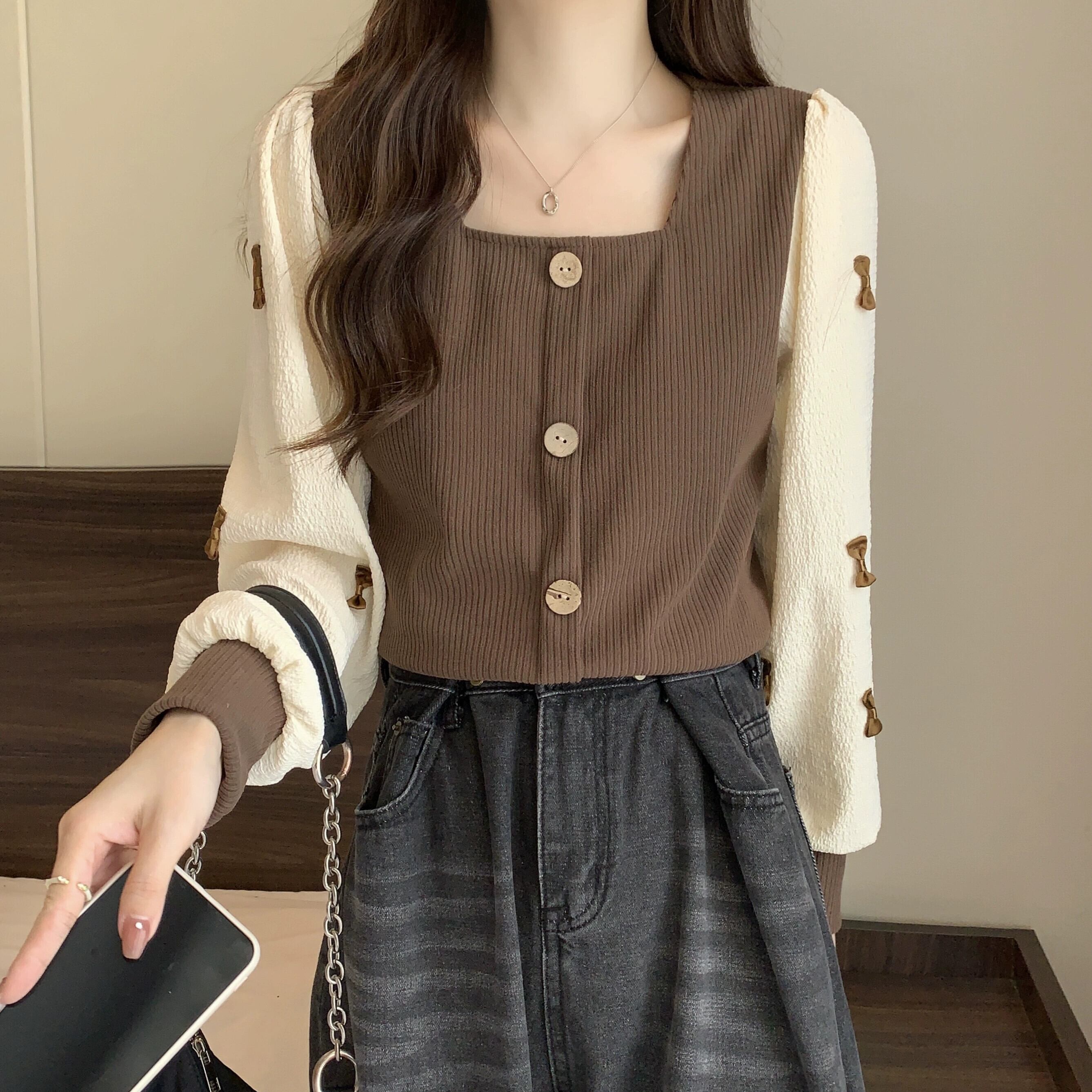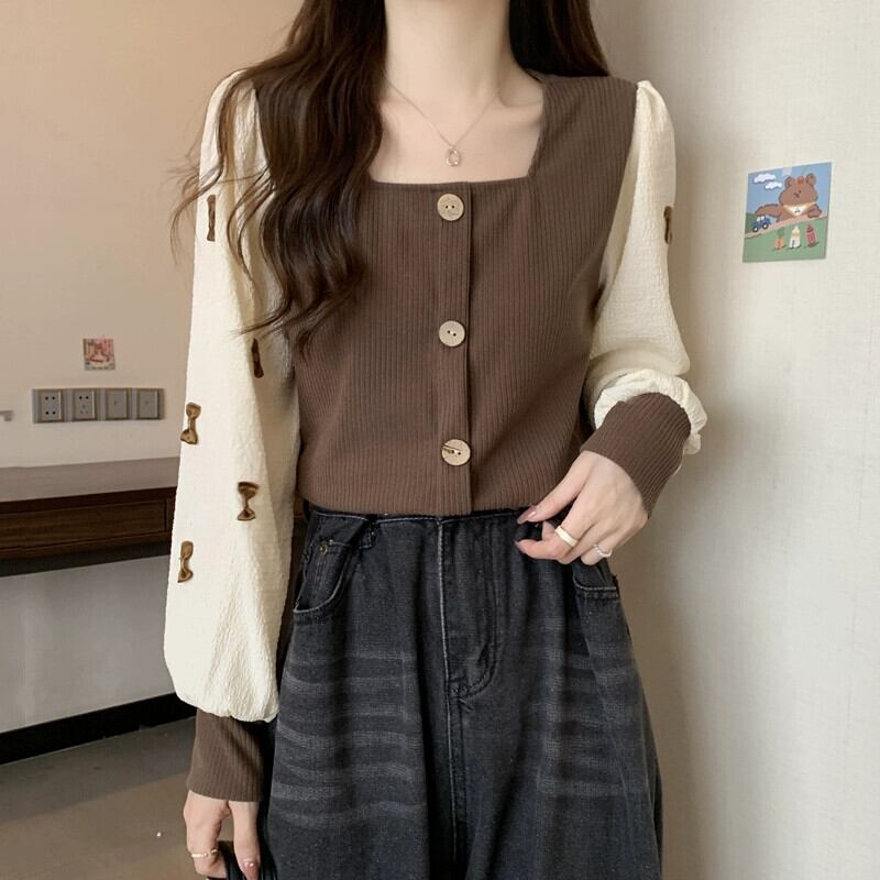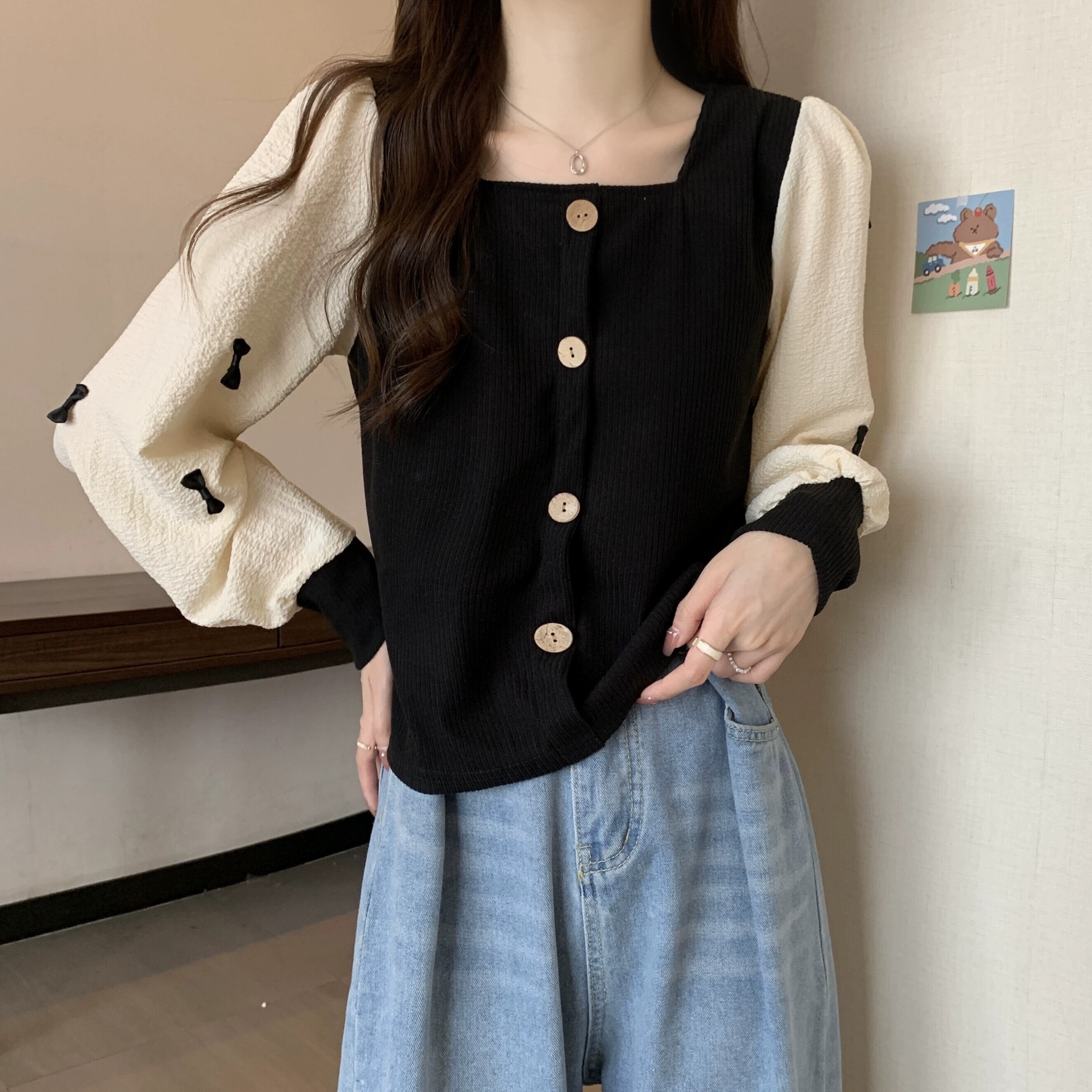 弓スクエアネックスウェットシャツ女性の春と秋 2023 新しいレトロなデザインニッチルーズで多目的な長袖トップ ロング スプリング 春物 オータム 秋物 スクウェア 7460017755451412 | framboise21