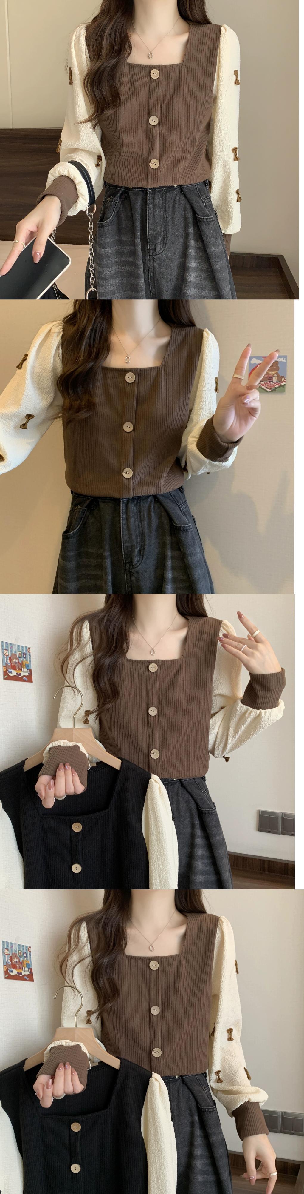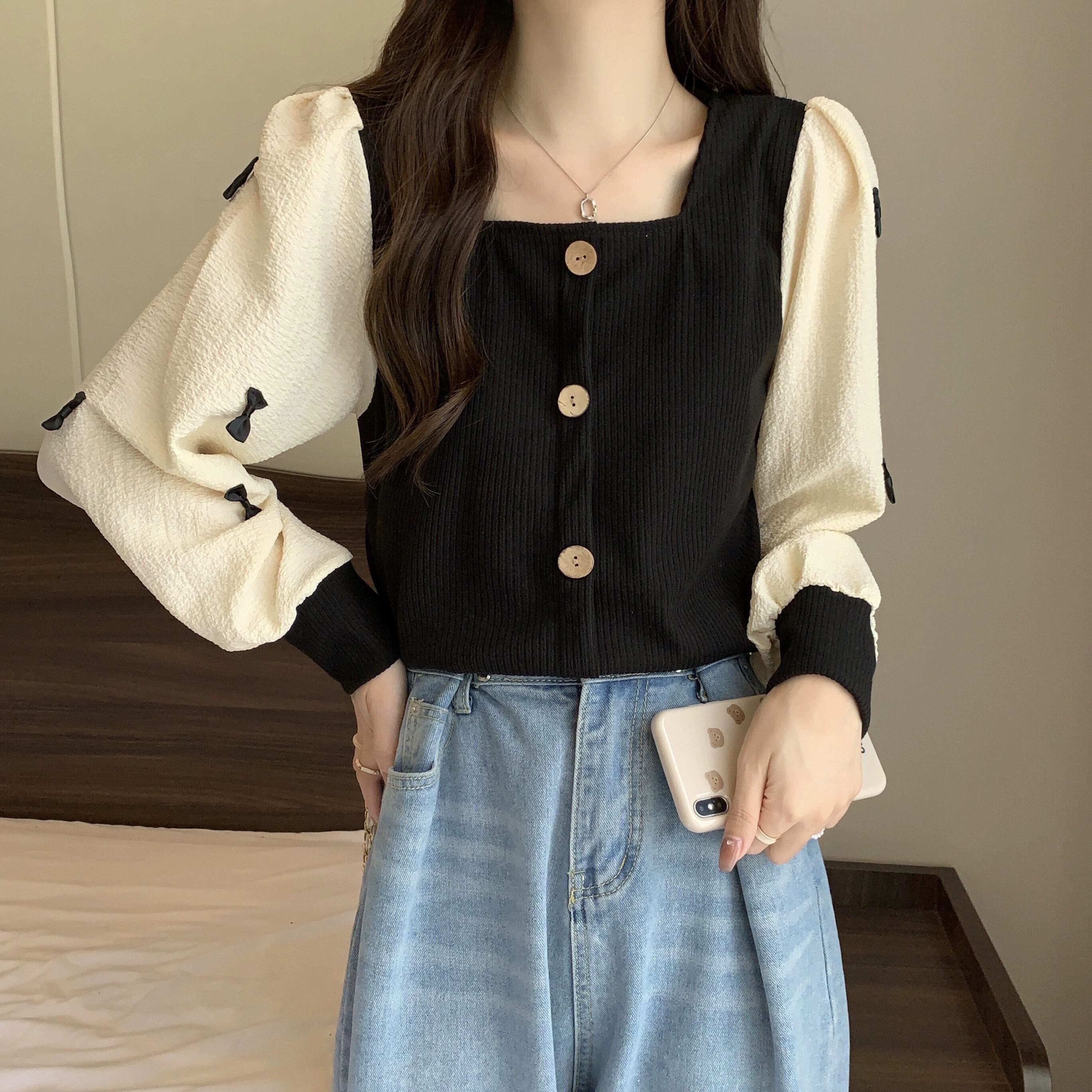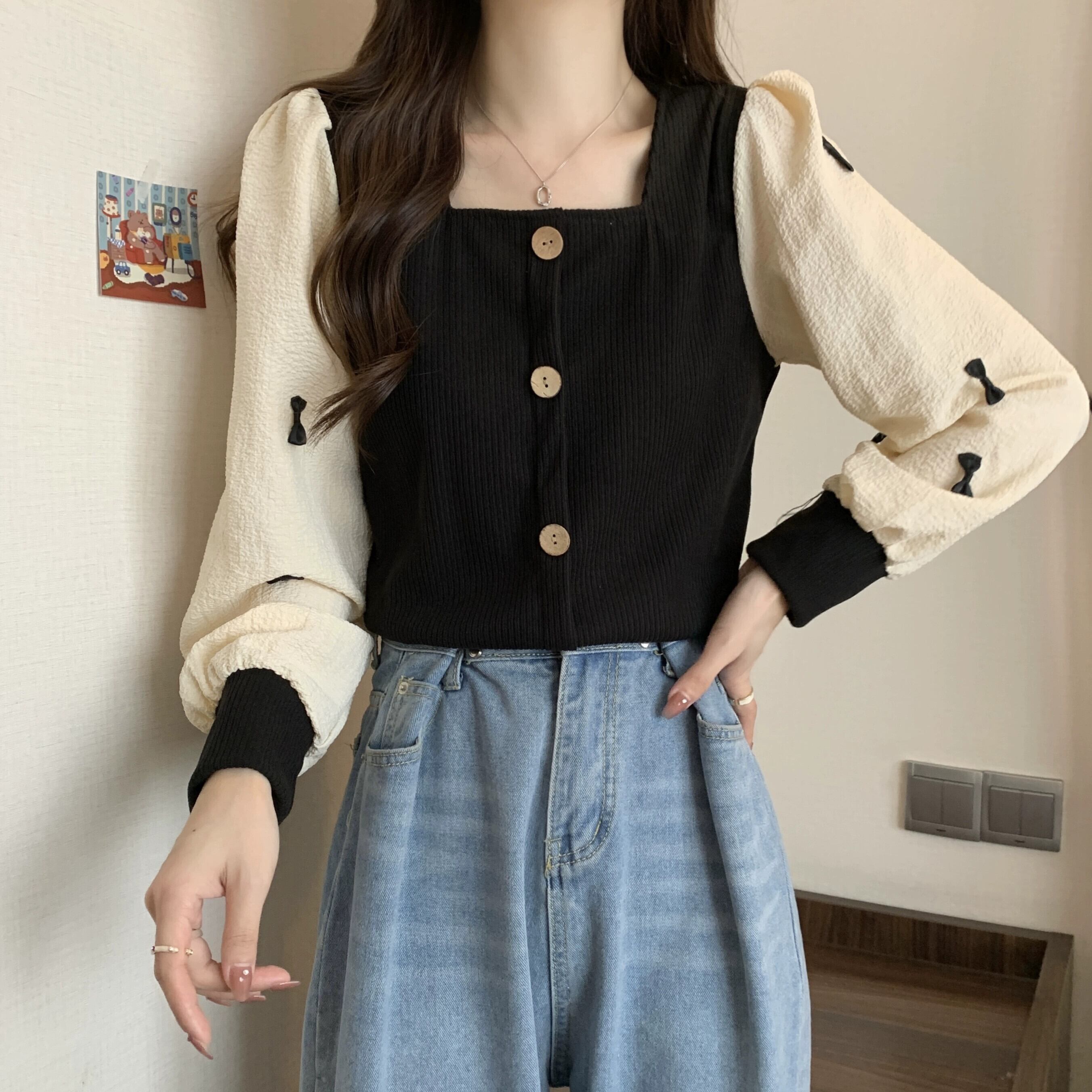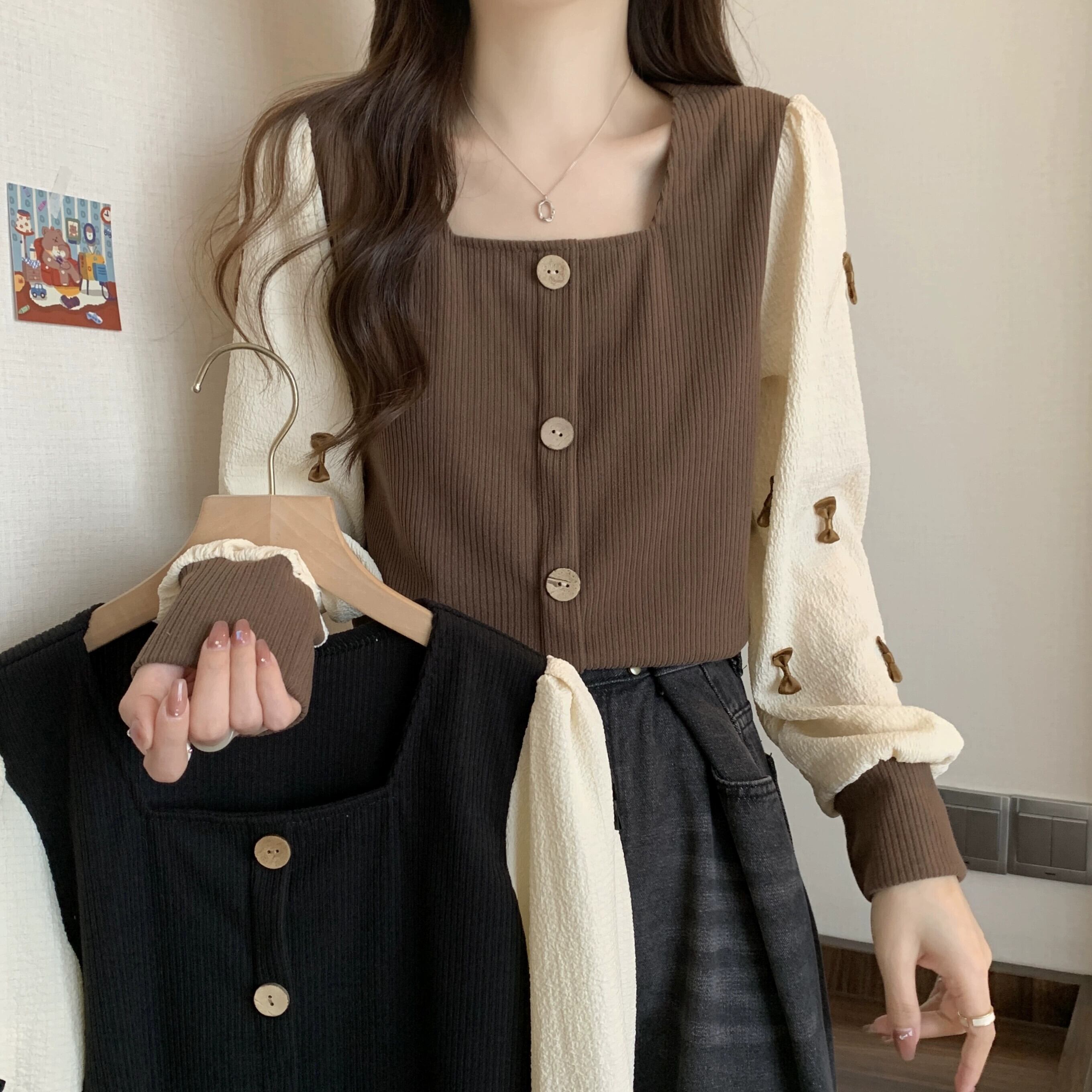 弓スクエアネックスウェットシャツ女性の春と秋 2023 新しいレトロなデザインニッチルーズで多目的な長袖トップ ロング スプリング 春物 オータム 秋物 スクウェア 7460017755451412 | framboise21