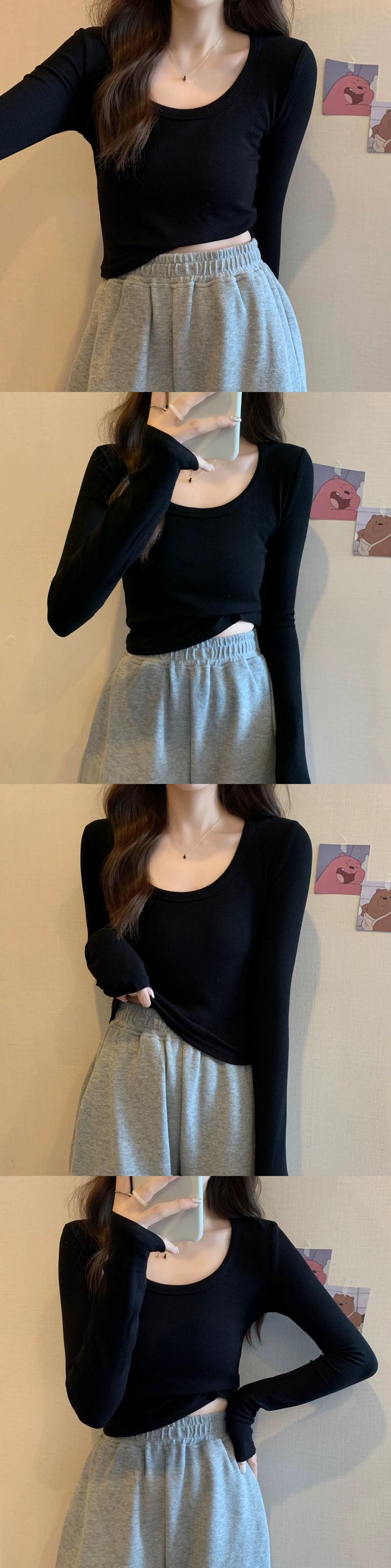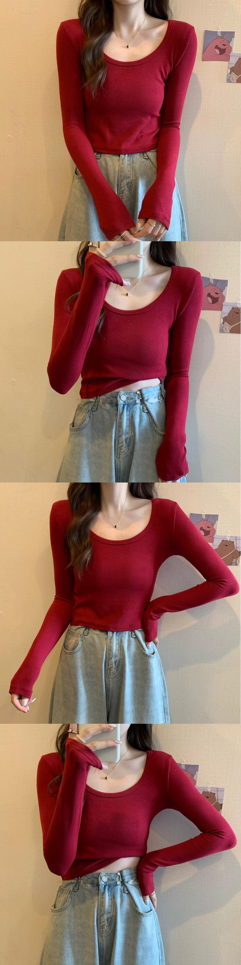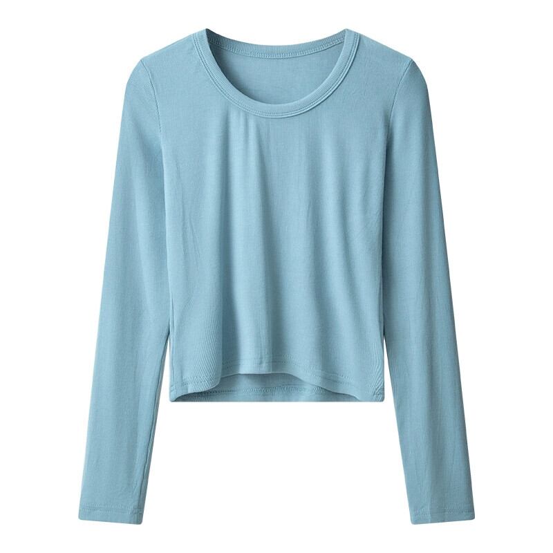 大きな U ネックの鎖骨が露出した長袖 T シャツの女性は、秋と冬のスーツにリブ編みのニット ボトム シャツ ショート トップ小人を着ています。 ロング オータム 秋物 ウィンター 冬物 Tシャツ 746006287522726 | framboise21