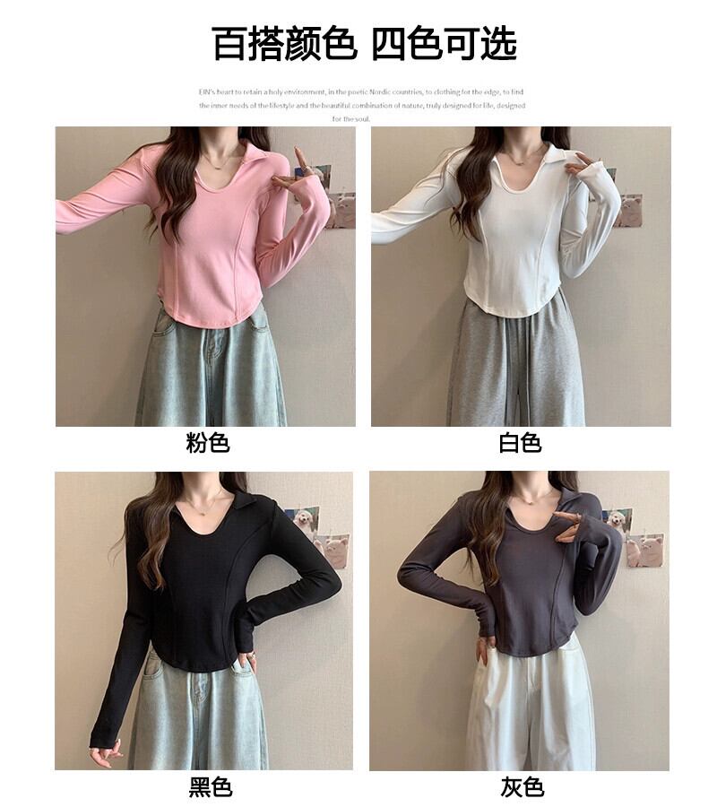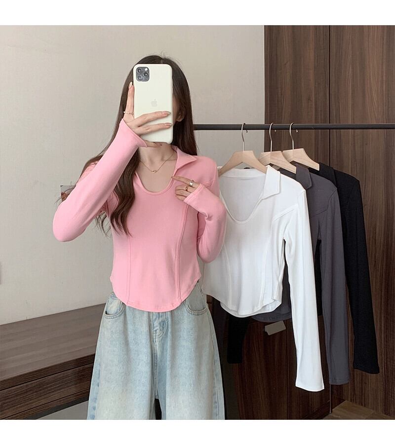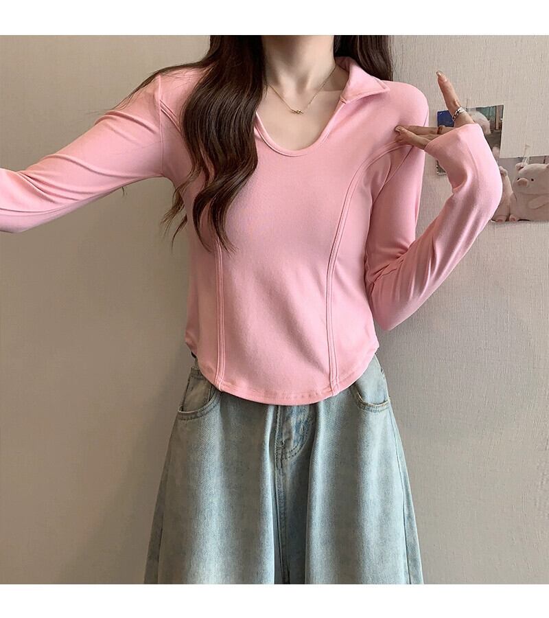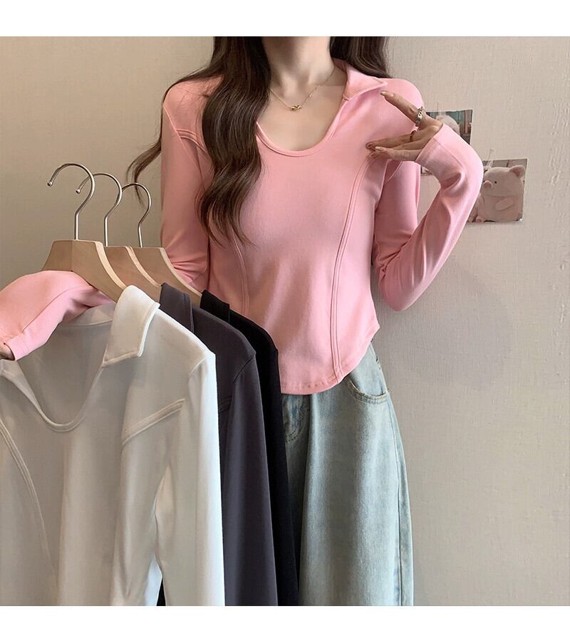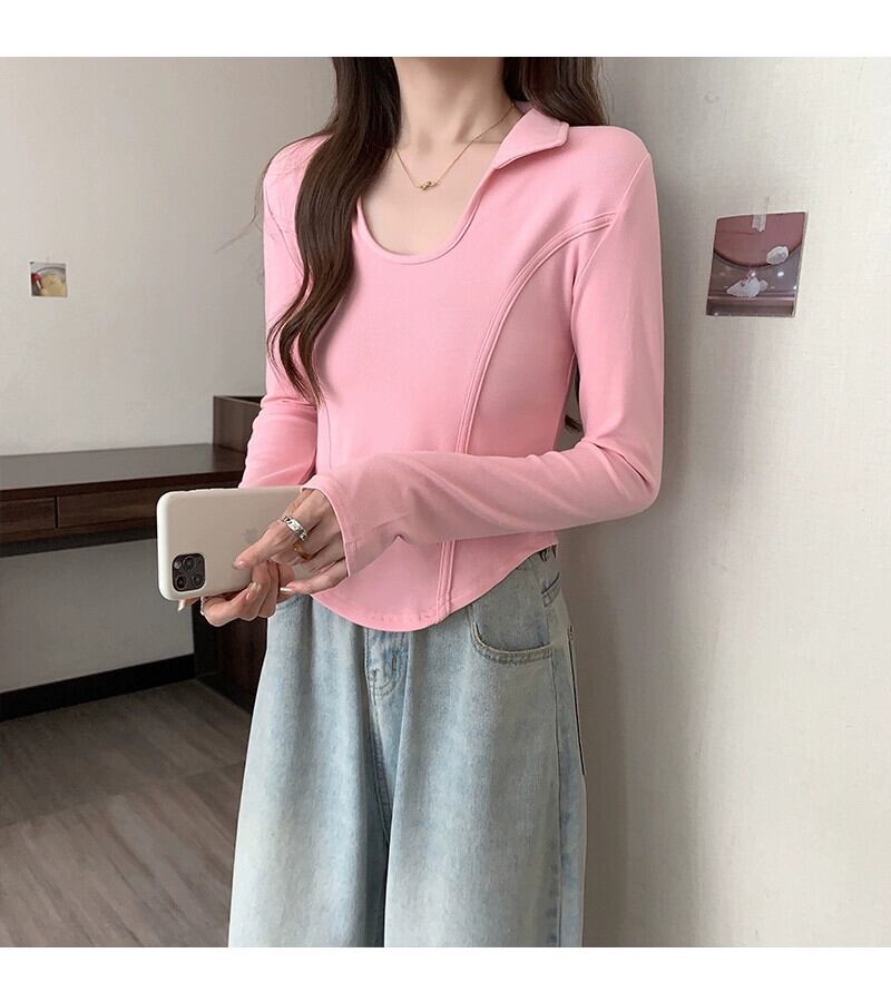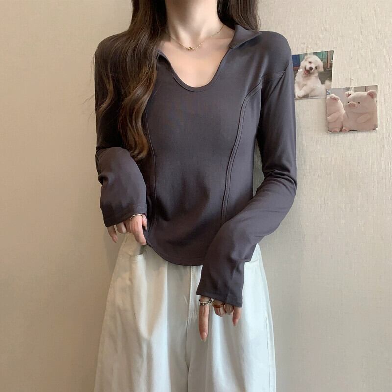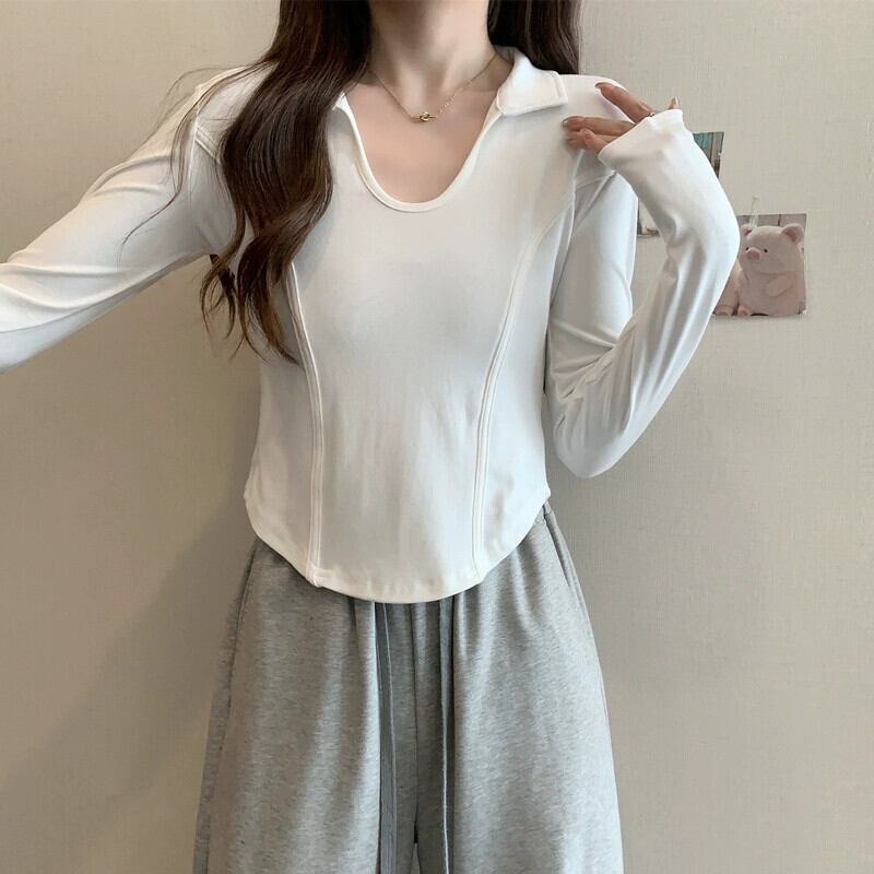 ピュアコットンポロカラー長袖 tシャツ女性の春と秋 2023 新しいファッションと eign スタイル不規則なショートフィッシュボーントップ ロング スプリング 春物 オータム 秋物 7460098289216688 | framboise21