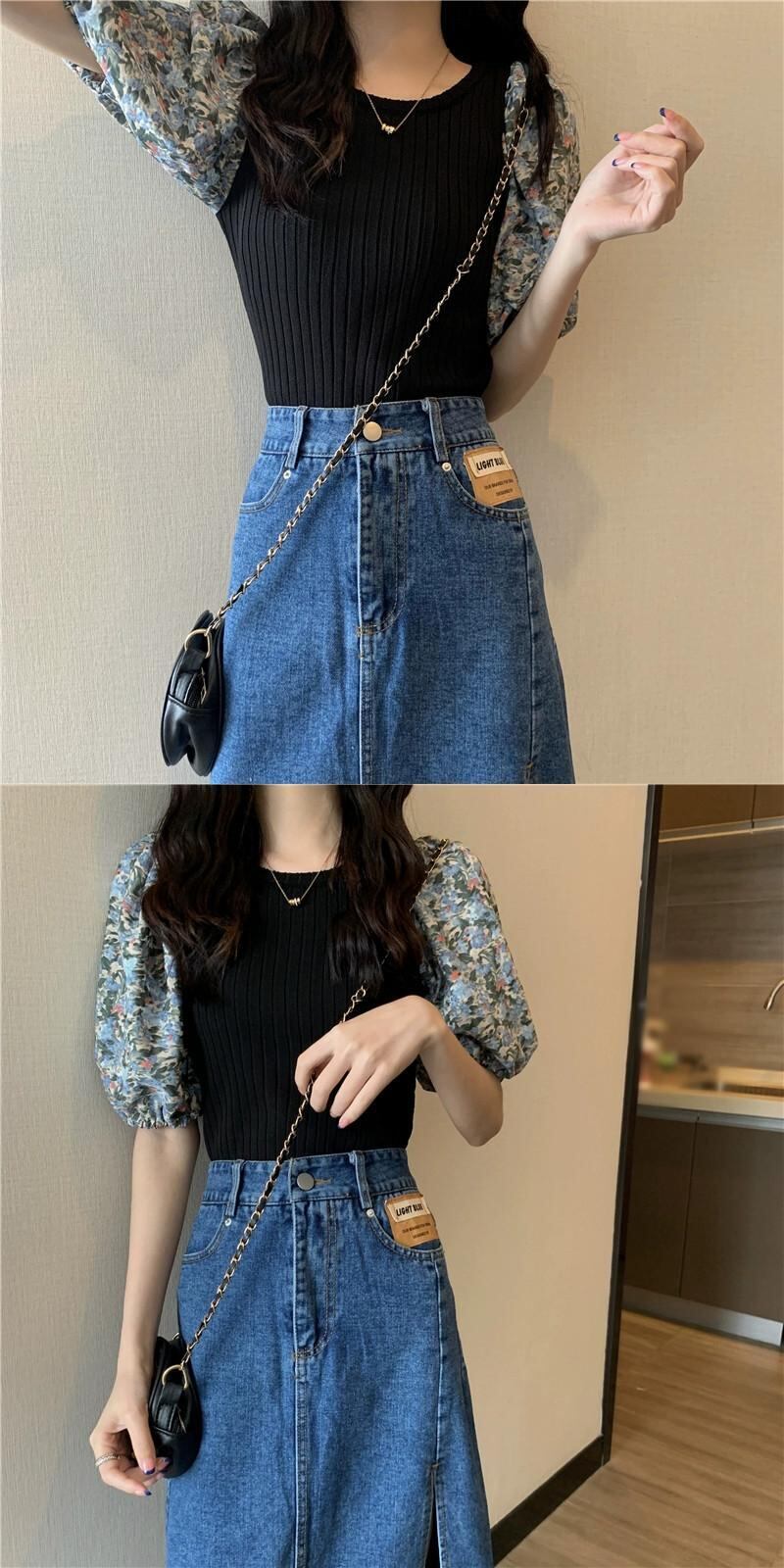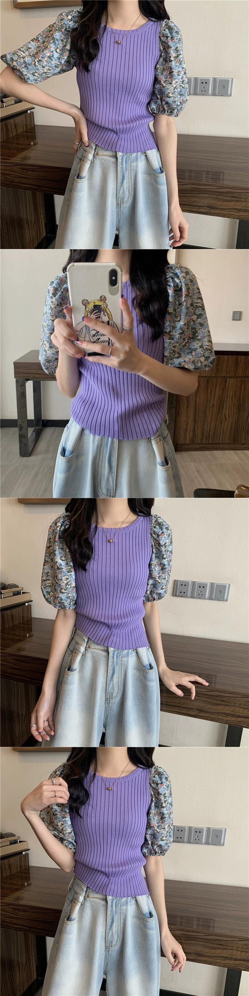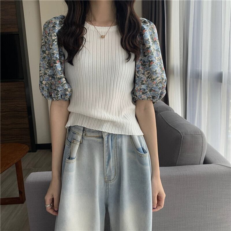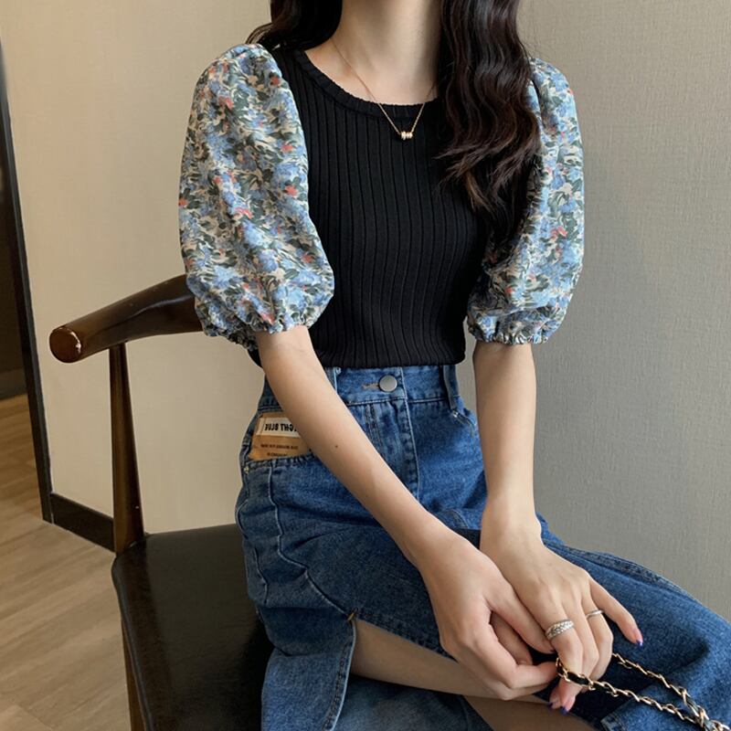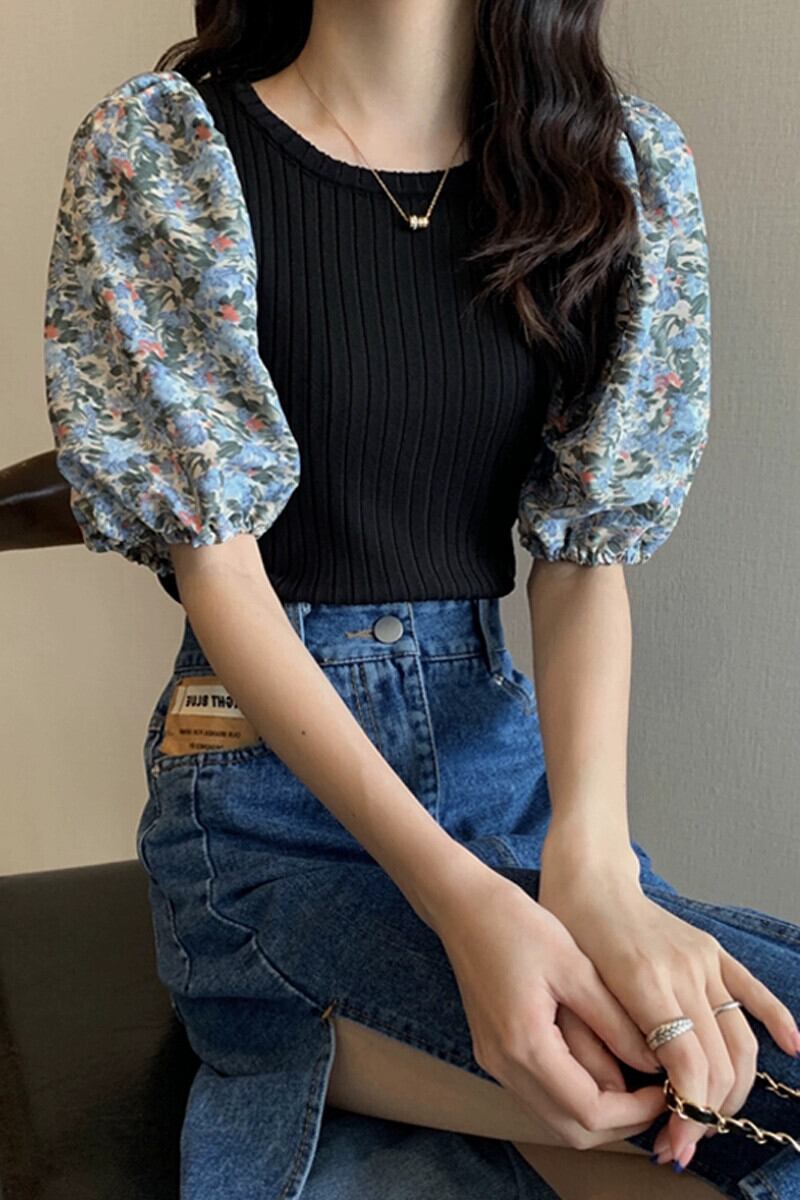 アイスシルクニット半袖Tシャツレディース夏、レトロなデザイン、スリムフィットショートパッチワーク花柄パフスリーブトップブラック サマー 夏物 7460091215411065 | framboise21