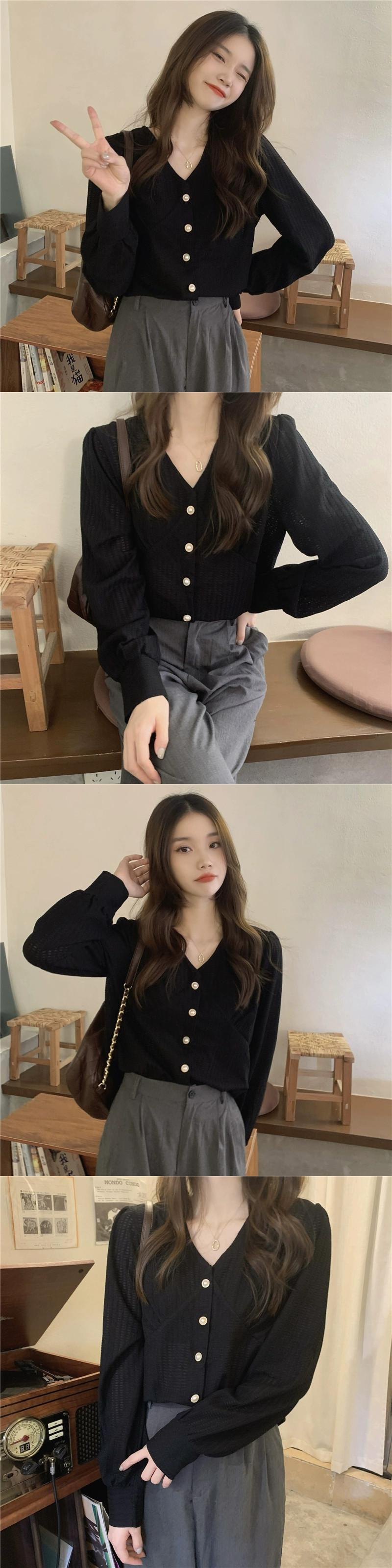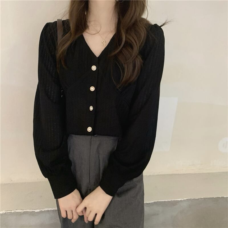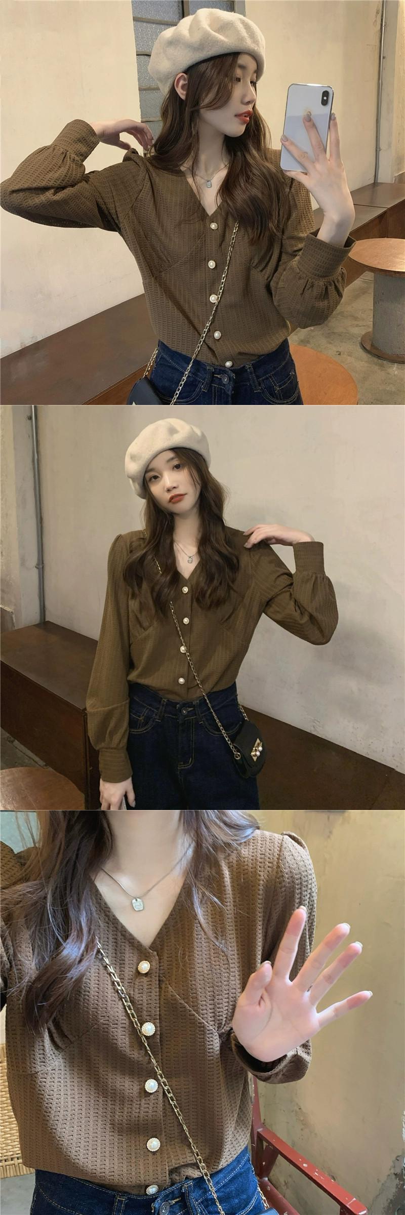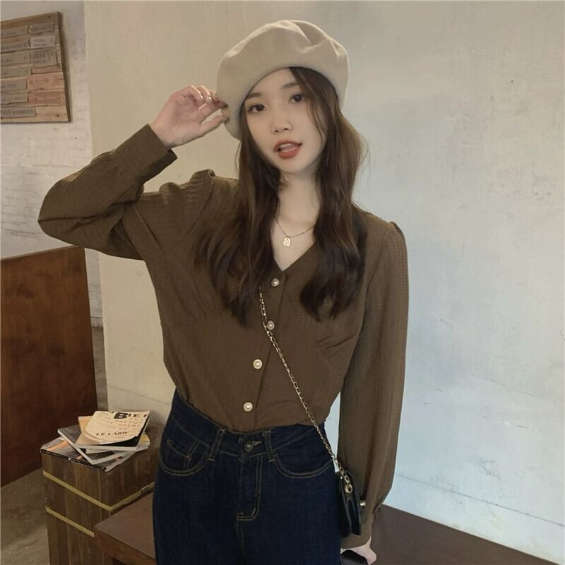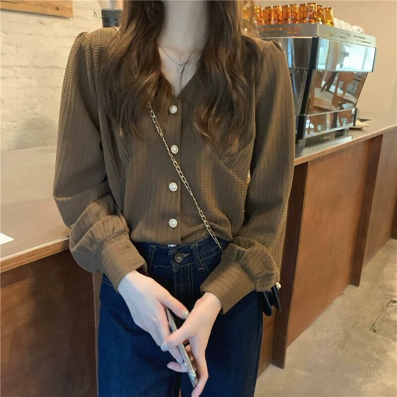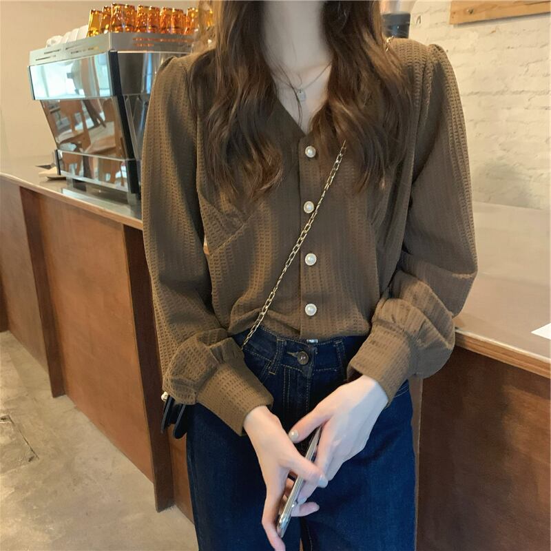 茶色のシャツの女性、春と秋のフランスのレトロなハイエンドデザインのバブル長袖シャツ、人気の西洋スタイルのVネックシャツ ロング スプリング 春物 オータム 秋物 7460071471010229 | framboise21