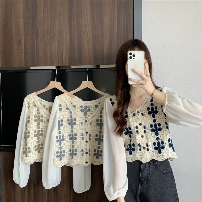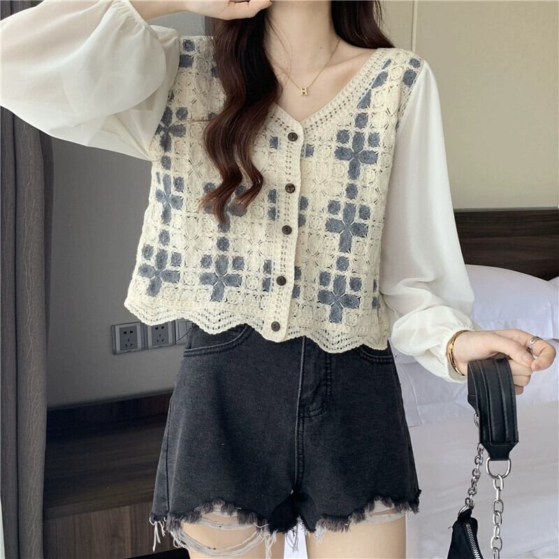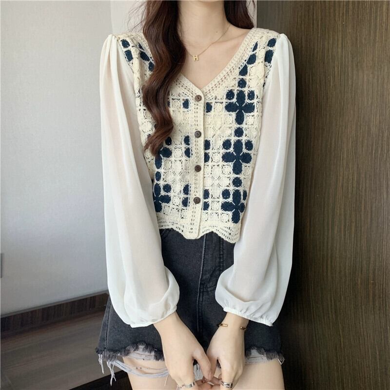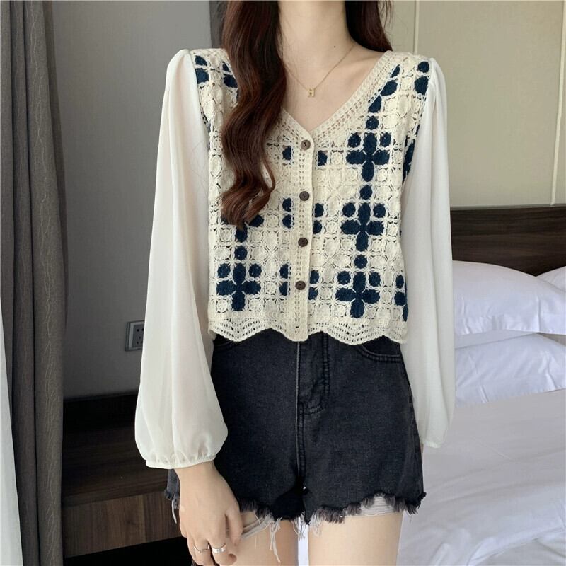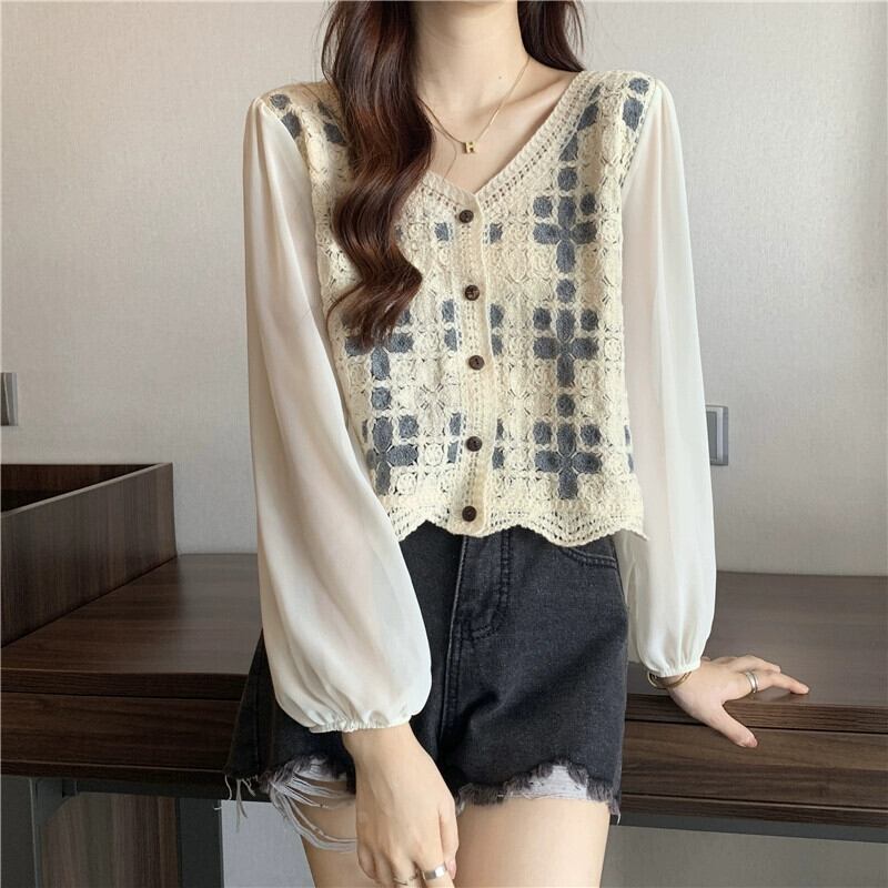 フレンチレトロパフ長袖シャツレディース、春秋デザイン、プチショートシャツ、カーディガン、Vネックトップ ロング スプリング 春物 オータム 秋物 746009863253551 | framboise21
