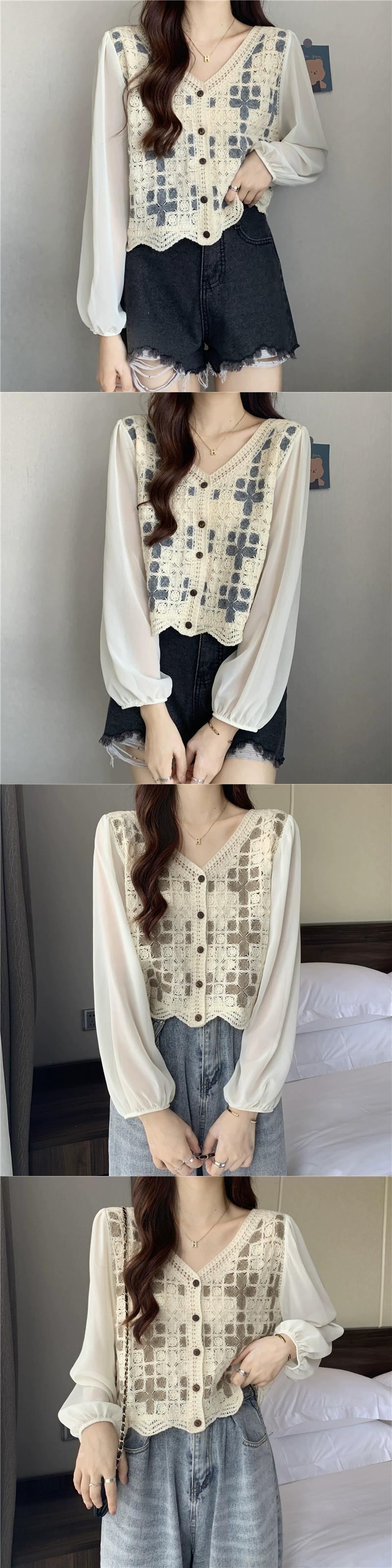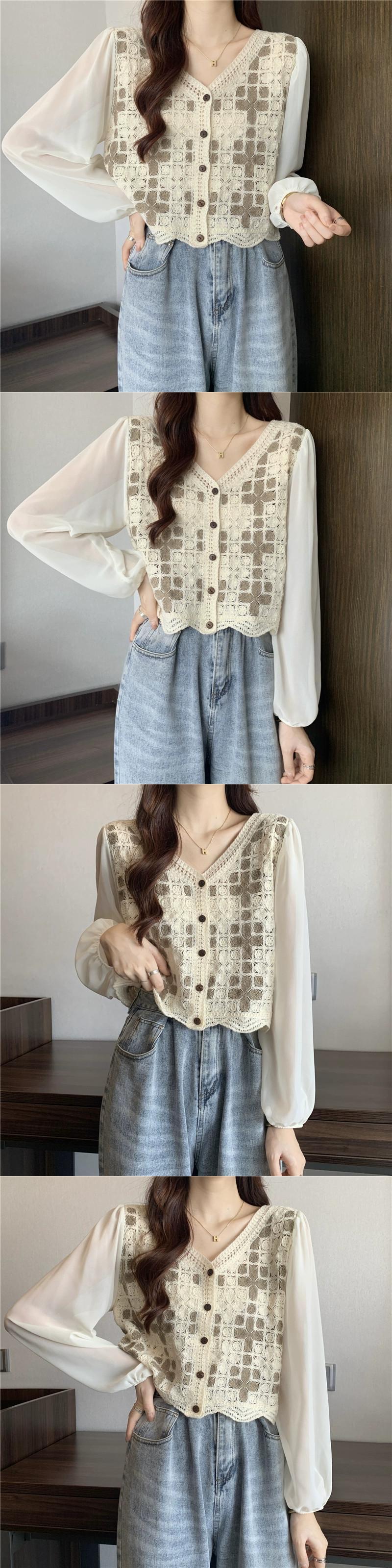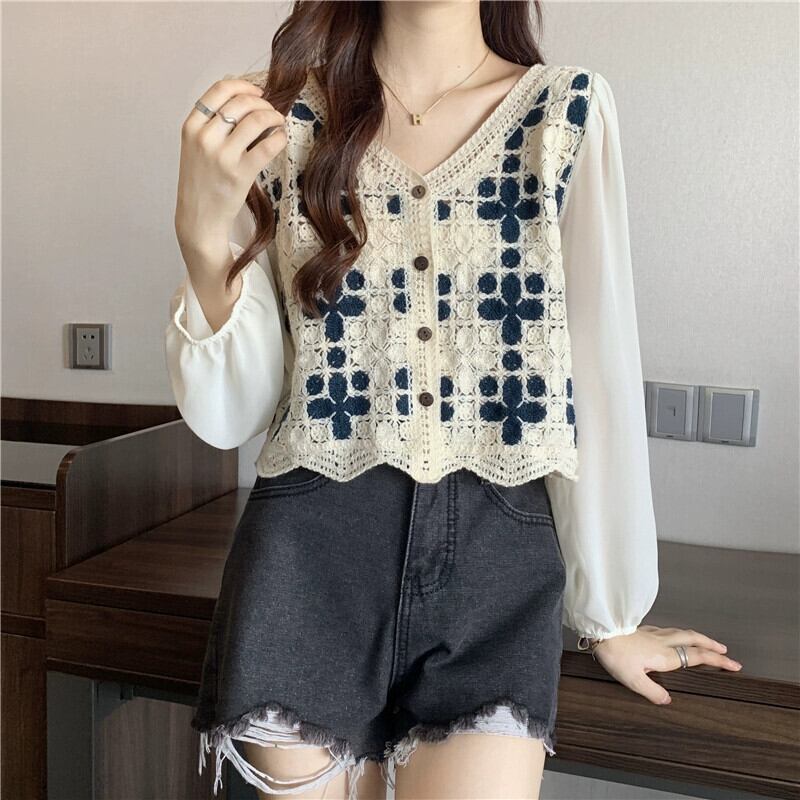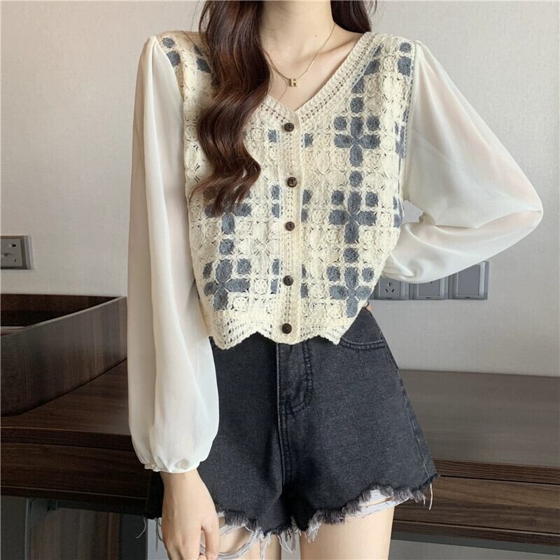 フレンチレトロパフ長袖シャツレディース、春秋デザイン、プチショートシャツ、カーディガン、Vネックトップ ロング スプリング 春物 オータム 秋物 746009863253551 | framboise21