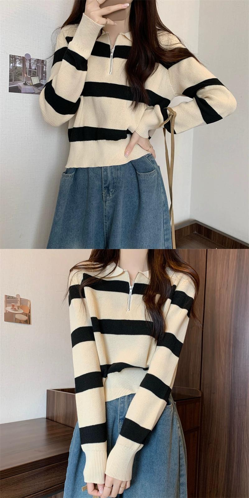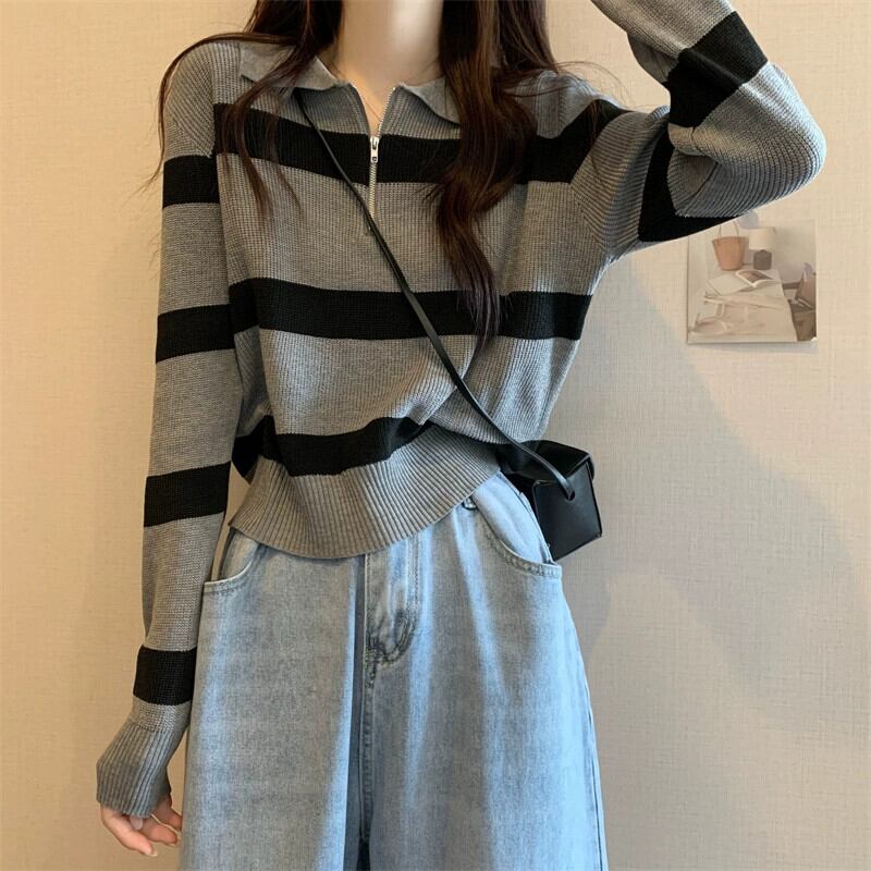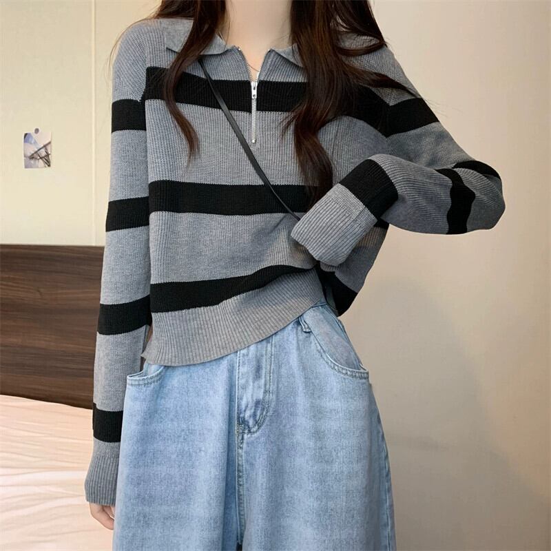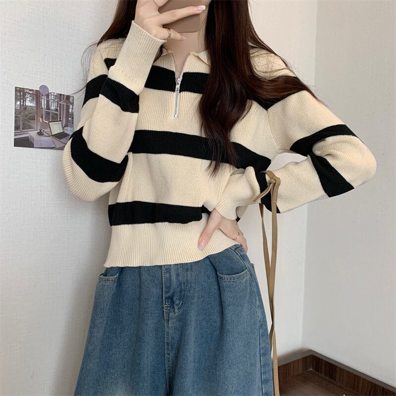 プルオーバーショートストライプセーター女性秋と冬 2023 新しいルーズアウターウェア痩身ハーフジップポロカラーセーター オータム 秋物 ウィンター 冬物 7460090478175956 | framboise21