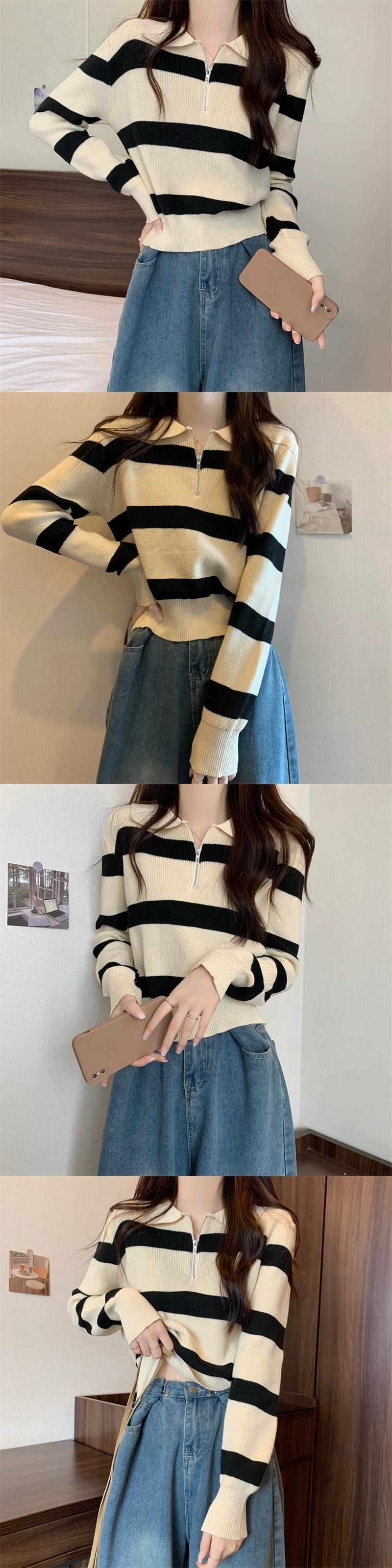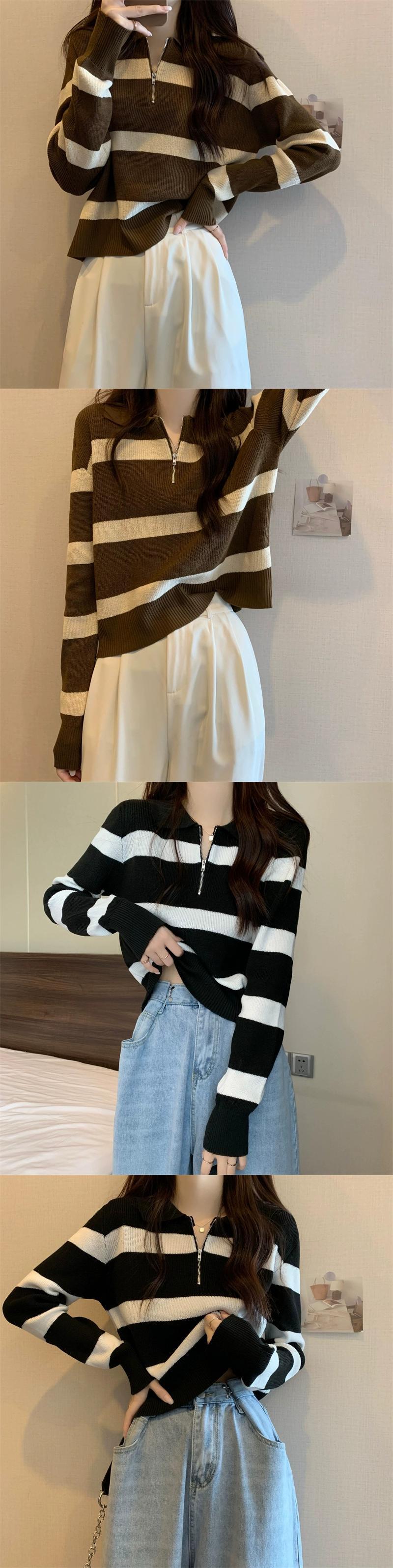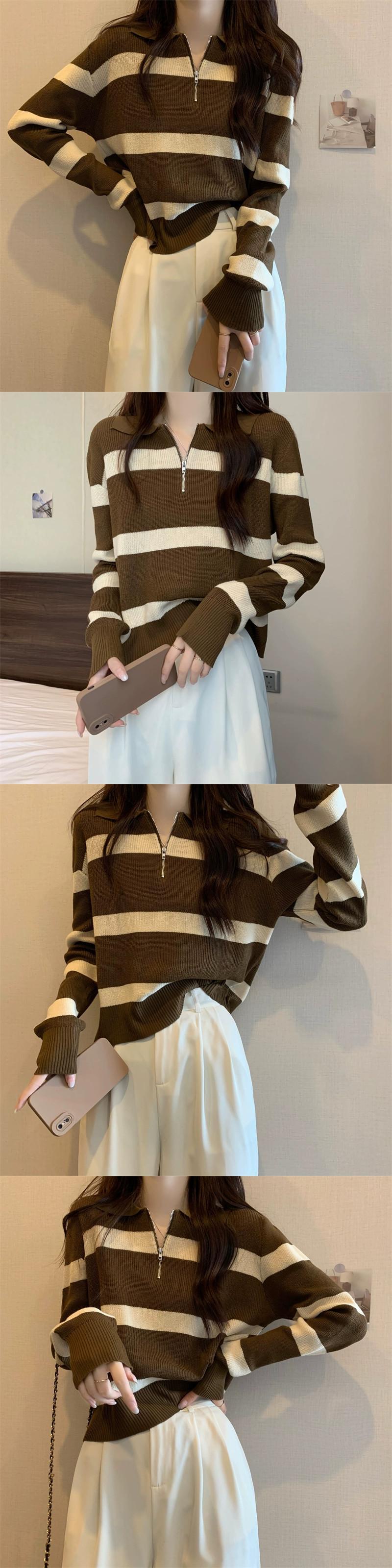 プルオーバーショートストライプセーター女性秋と冬 2023 新しいルーズアウターウェア痩身ハーフジップポロカラーセーター オータム 秋物 ウィンター 冬物 7460090478175956 | framboise21