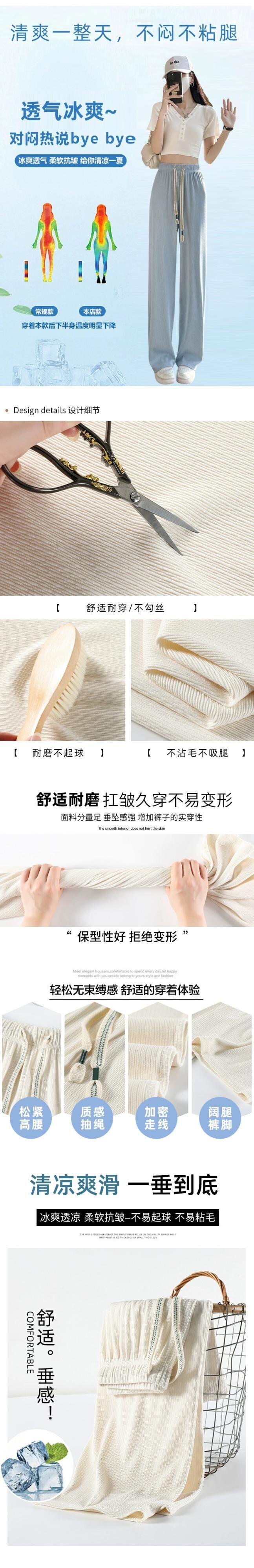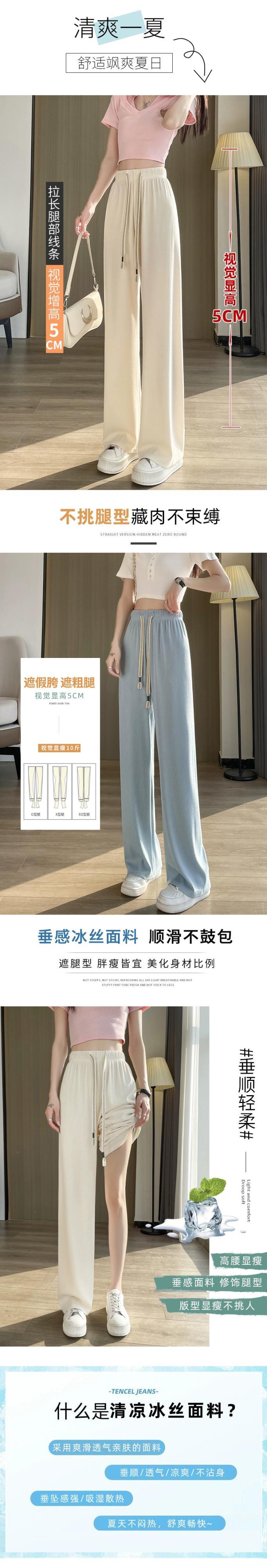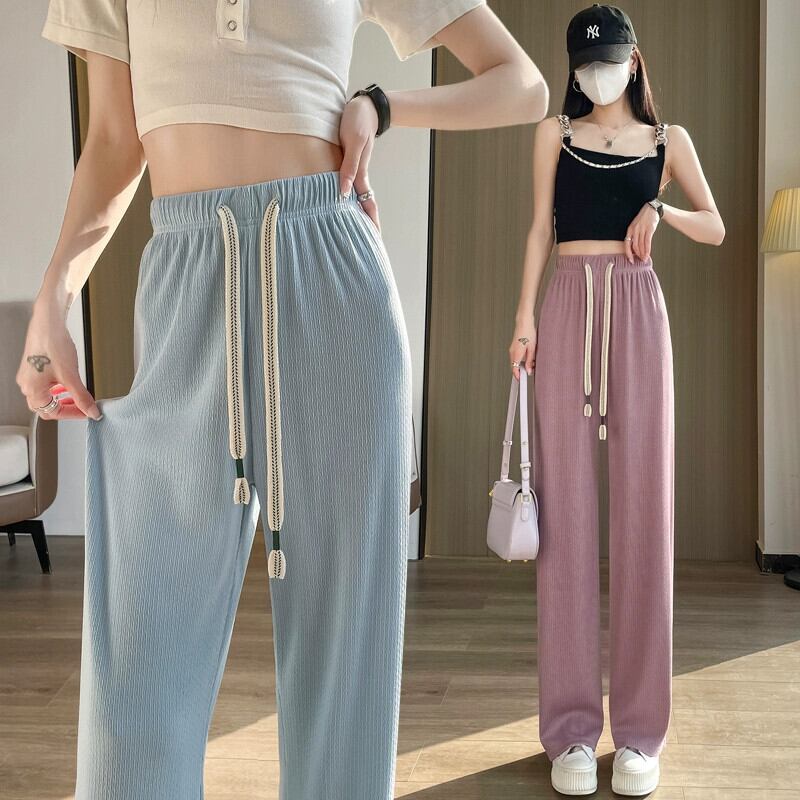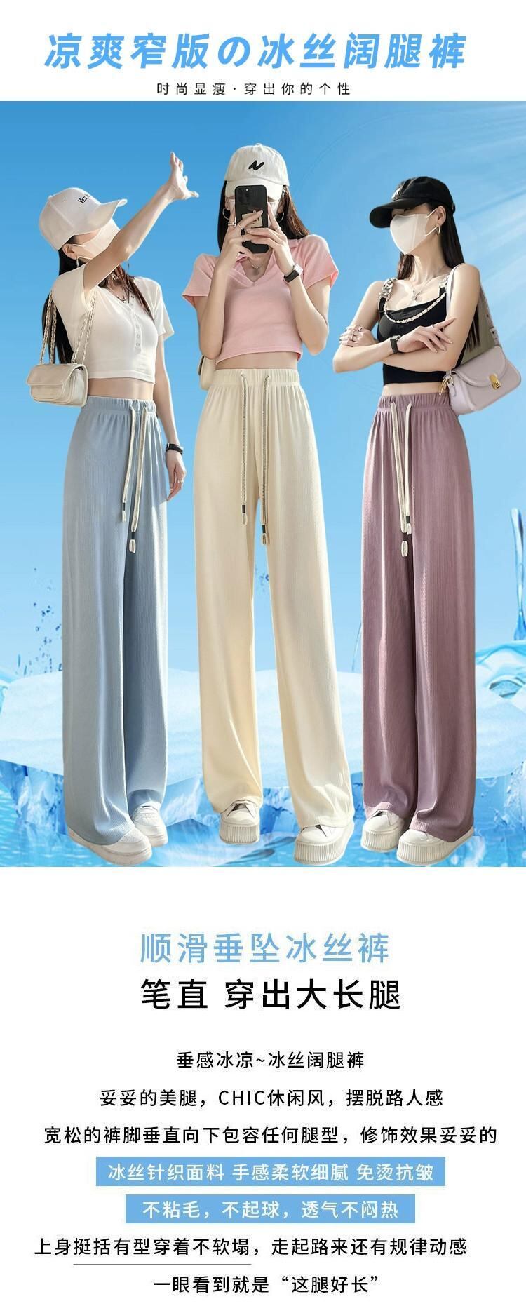 夏のアイスシルクワイドレッグパンツレディース、ルーズ、スリム、ハイウエスト、薄いパンツ、ストレートレッグドレープ、狭いカジュアルフロアモップパンツ サマー 夏物 7460055313007544 | framboise21
