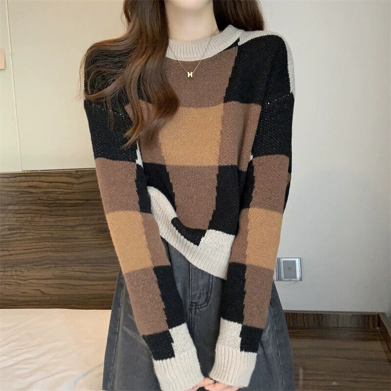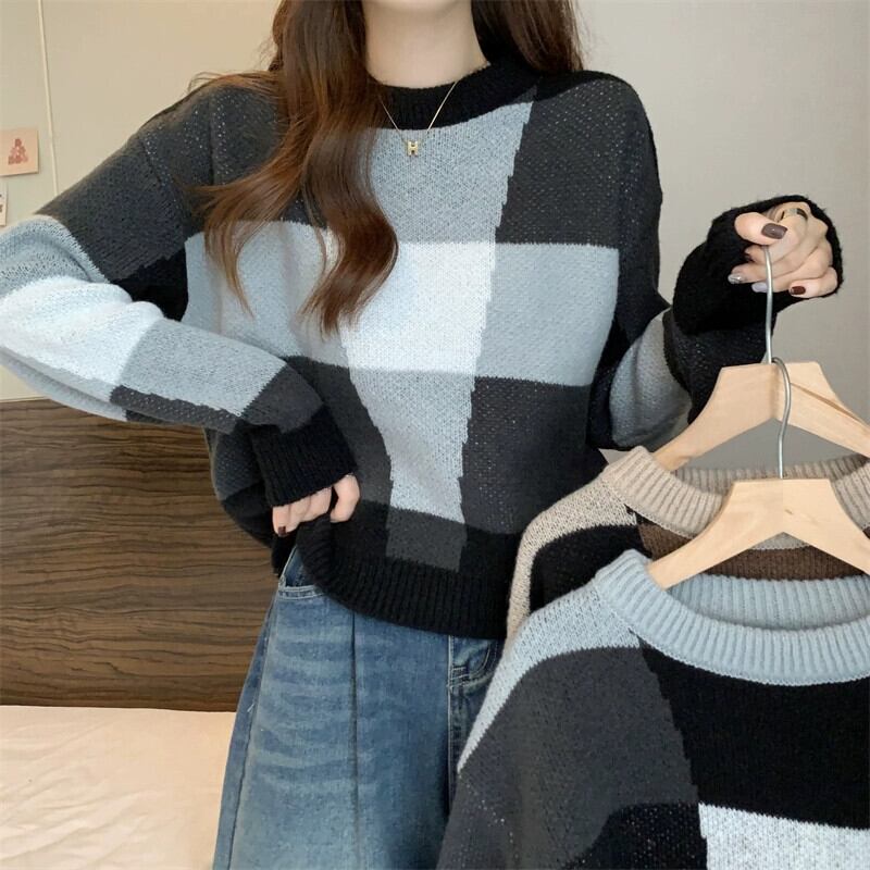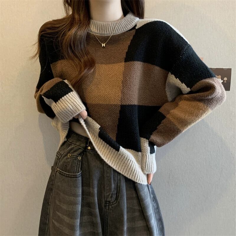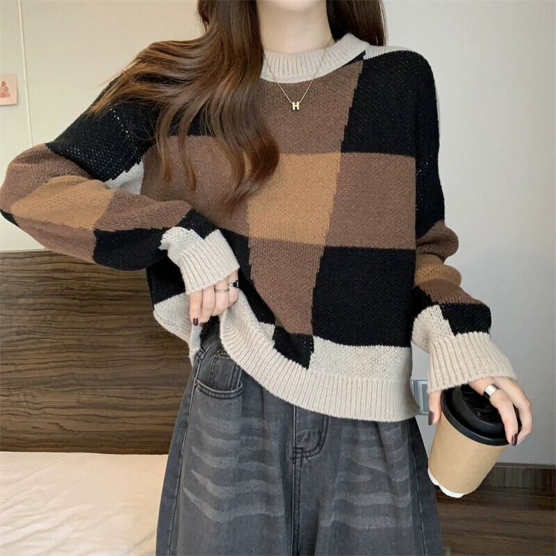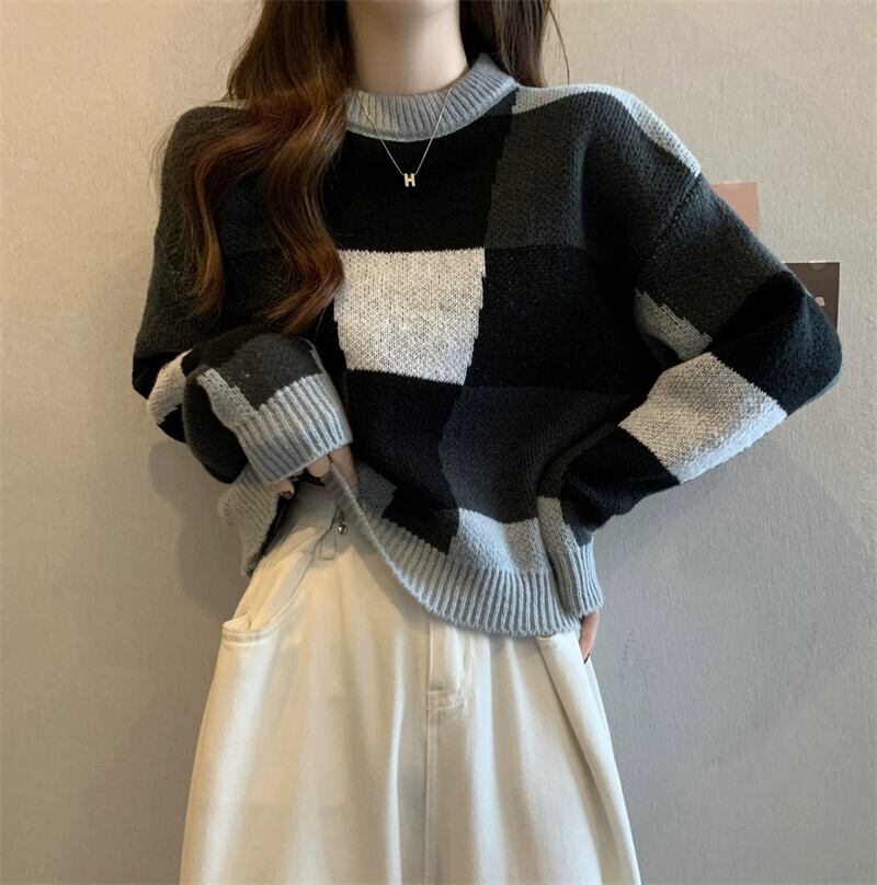ショートチェッカーボードチェック柄セーターレディース、秋と冬のレトロ、小さくてルーズなアウターウェア、怠惰なプルオーバー、長袖ニットトップ ロング オータム 秋物 ウィンター 冬物 746006176712605 | framboise21