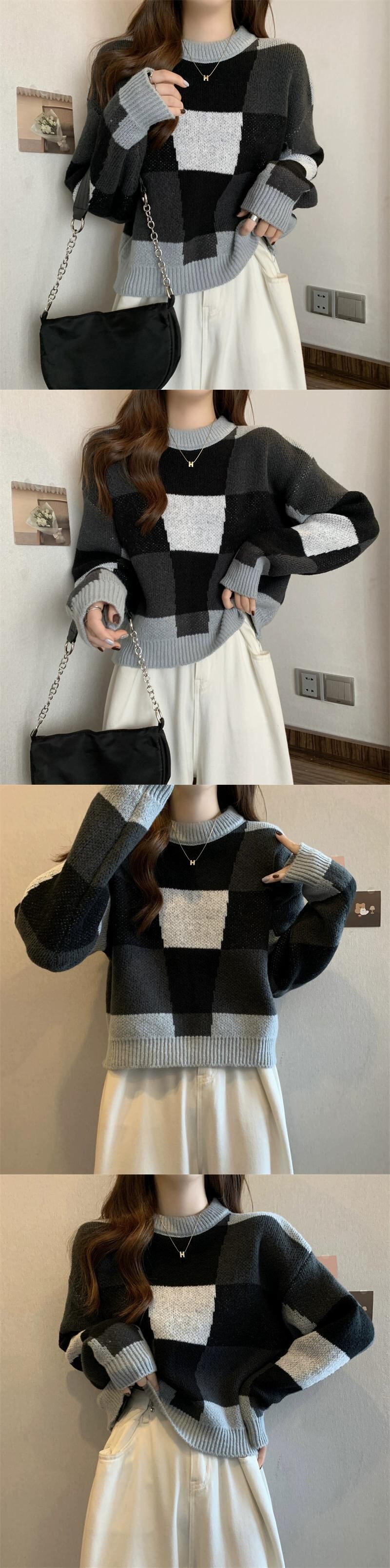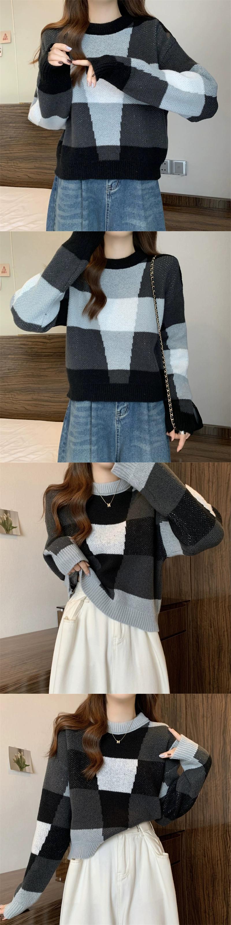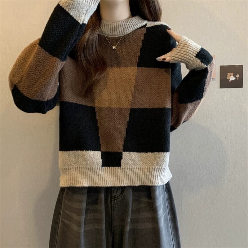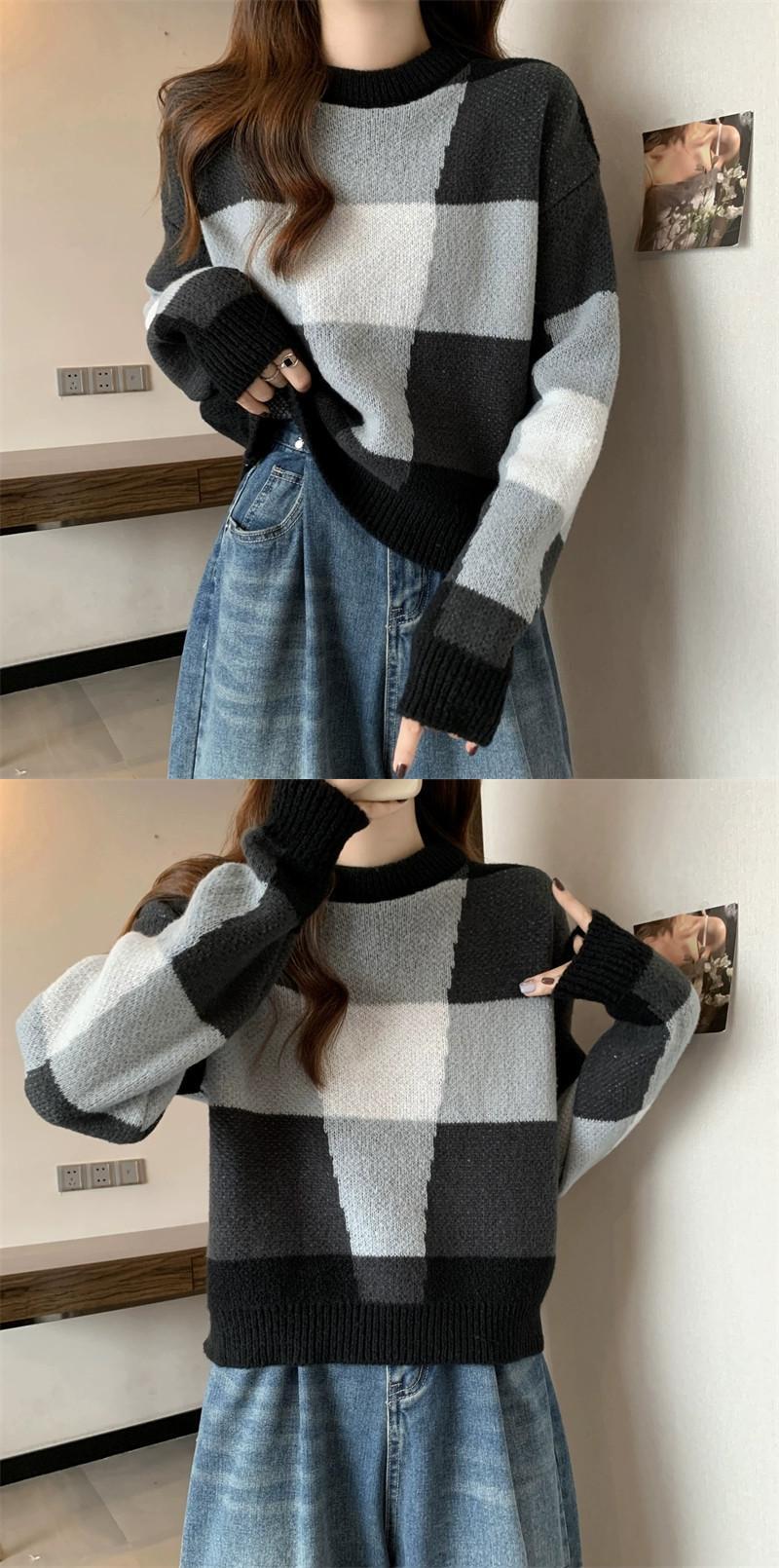 ショートチェッカーボードチェック柄セーターレディース、秋と冬のレトロ、小さくてルーズなアウターウェア、怠惰なプルオーバー、長袖ニットトップ ロング オータム 秋物 ウィンター 冬物 746006176712605 | framboise21