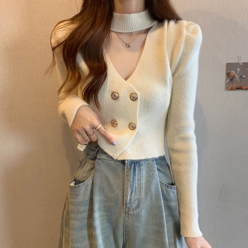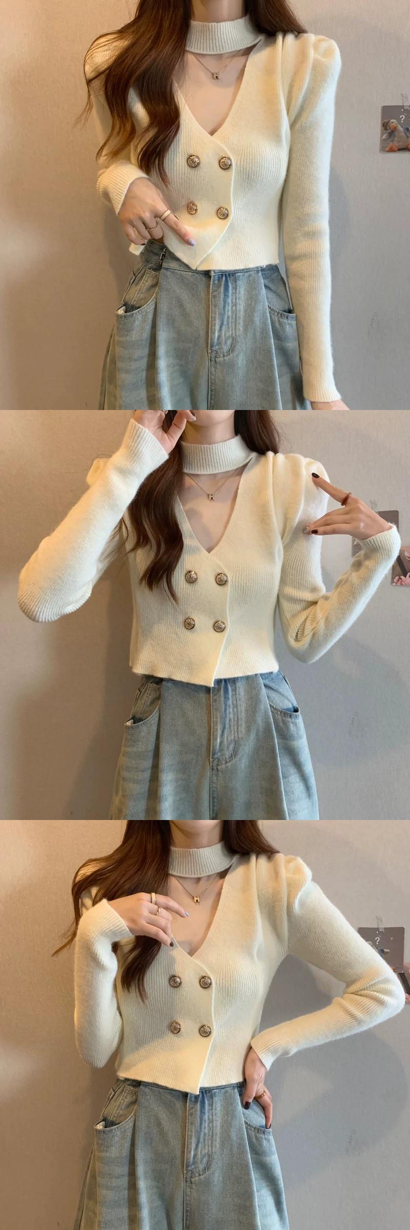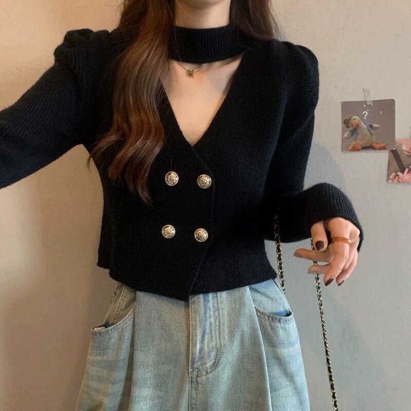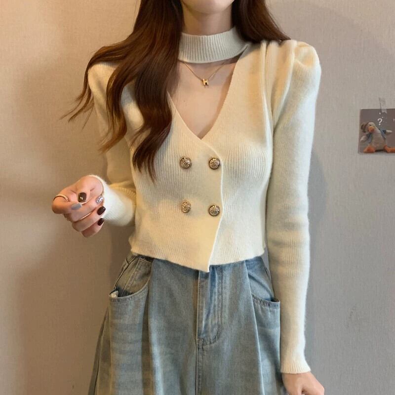 ホルターネックハーフタートルネックセーター女性秋と冬フレンチスタイルのシックなショートパフスリーブ V ネックニットカーディガントップ オータム 秋物 ウィンター 冬物 Vネック 7460083070894432 | framboise21