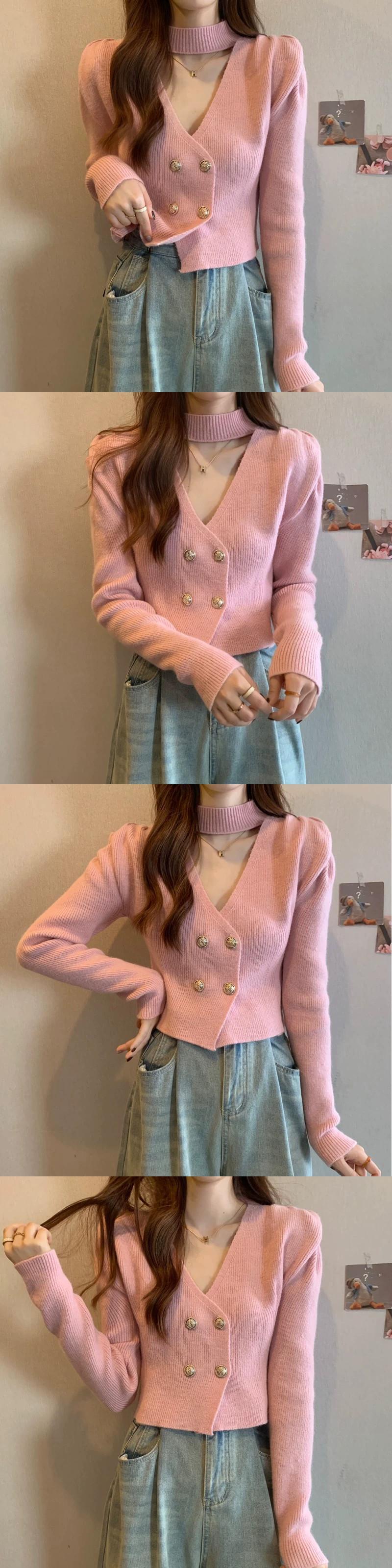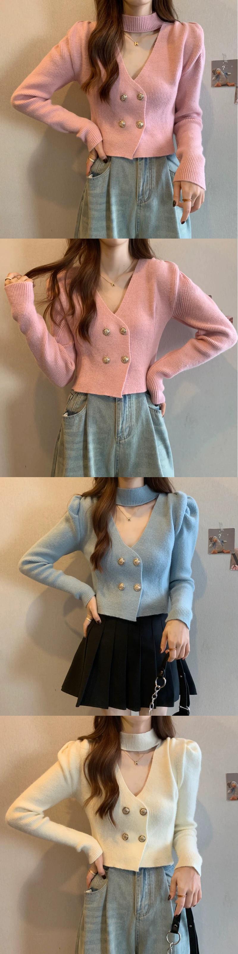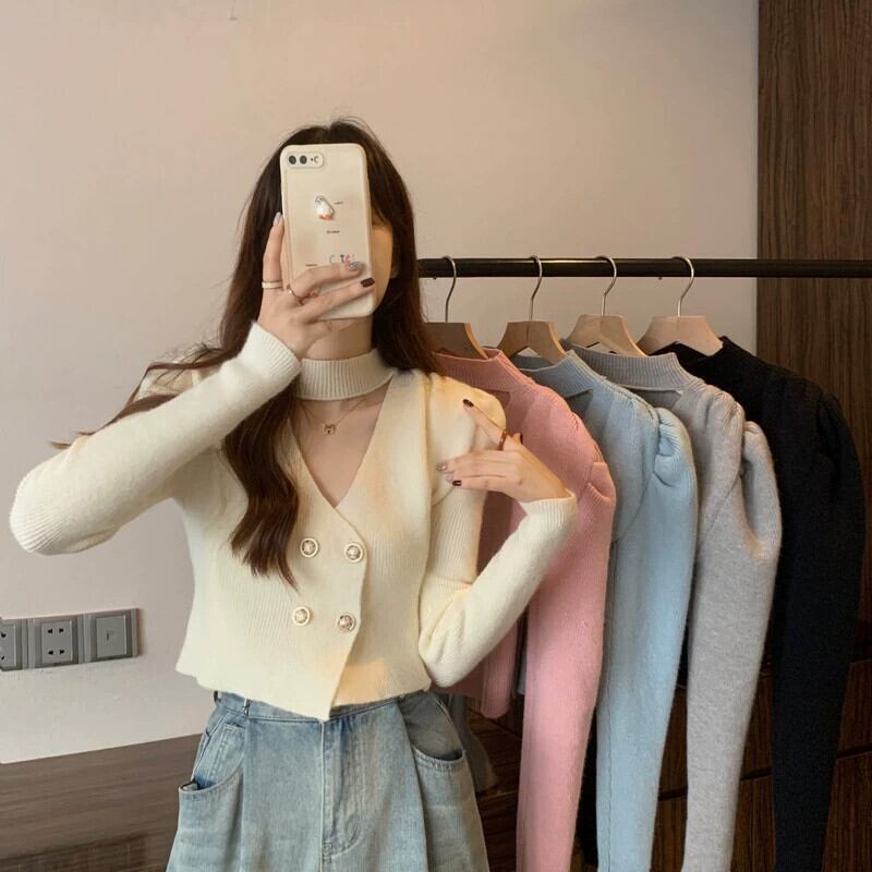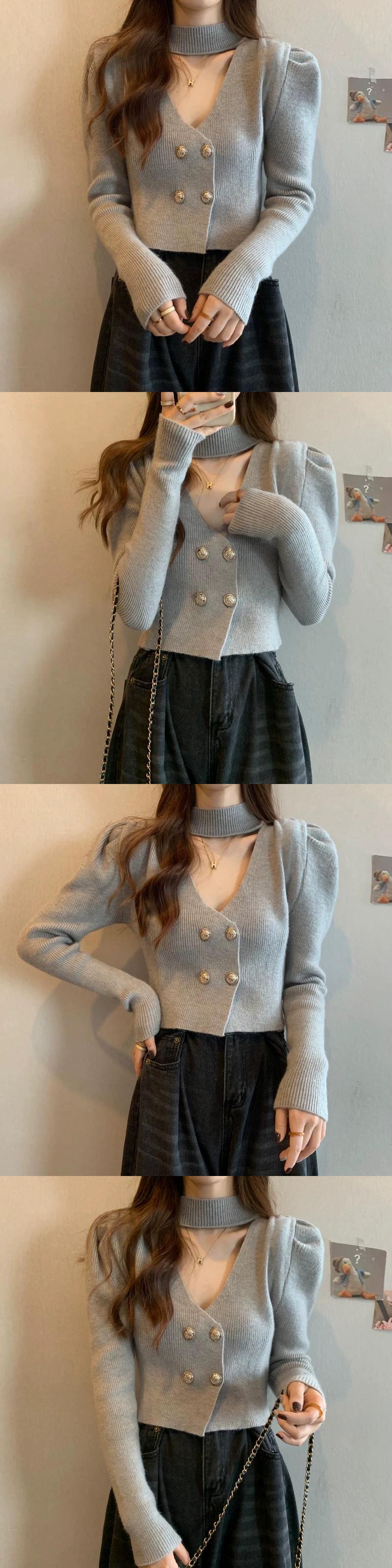 ホルターネックハーフタートルネックセーター女性秋と冬フレンチスタイルのシックなショートパフスリーブ V ネックニットカーディガントップ オータム 秋物 ウィンター 冬物 Vネック 7460083070894432 | framboise21