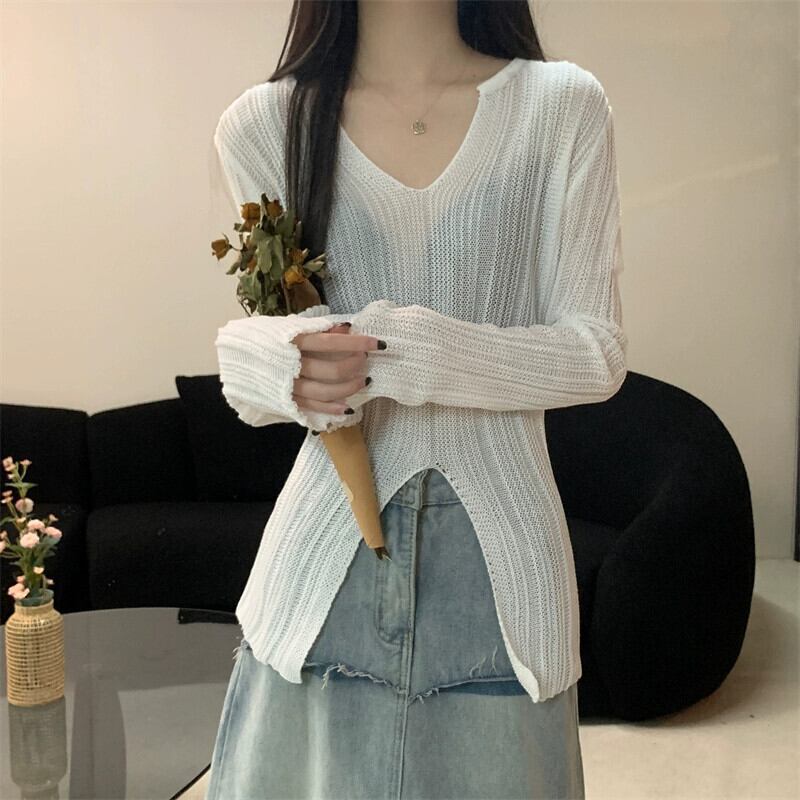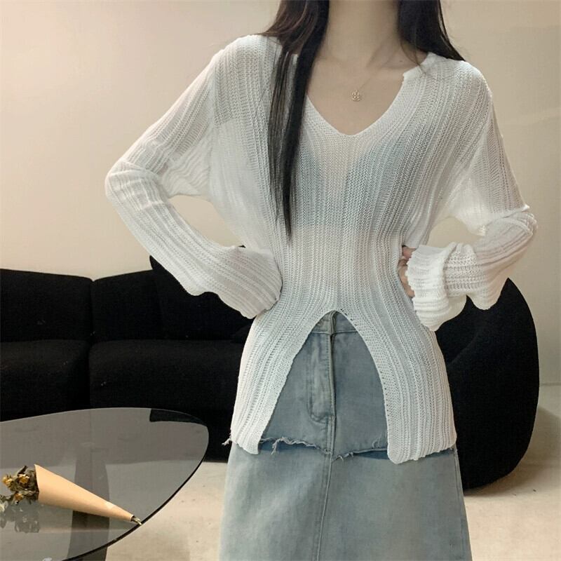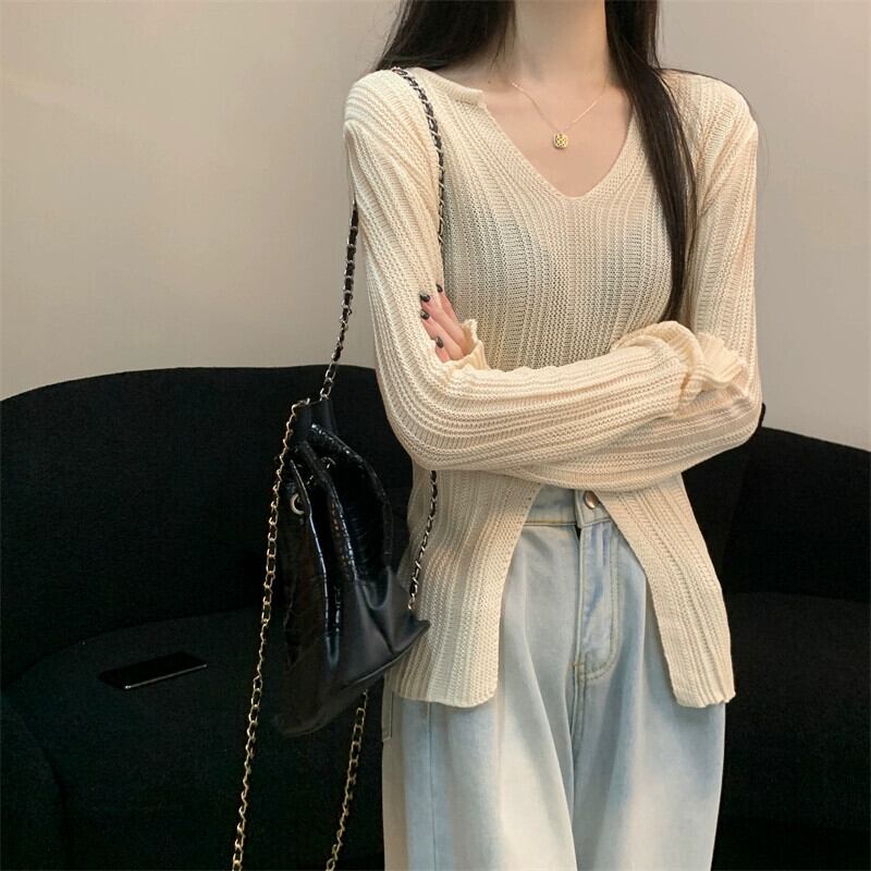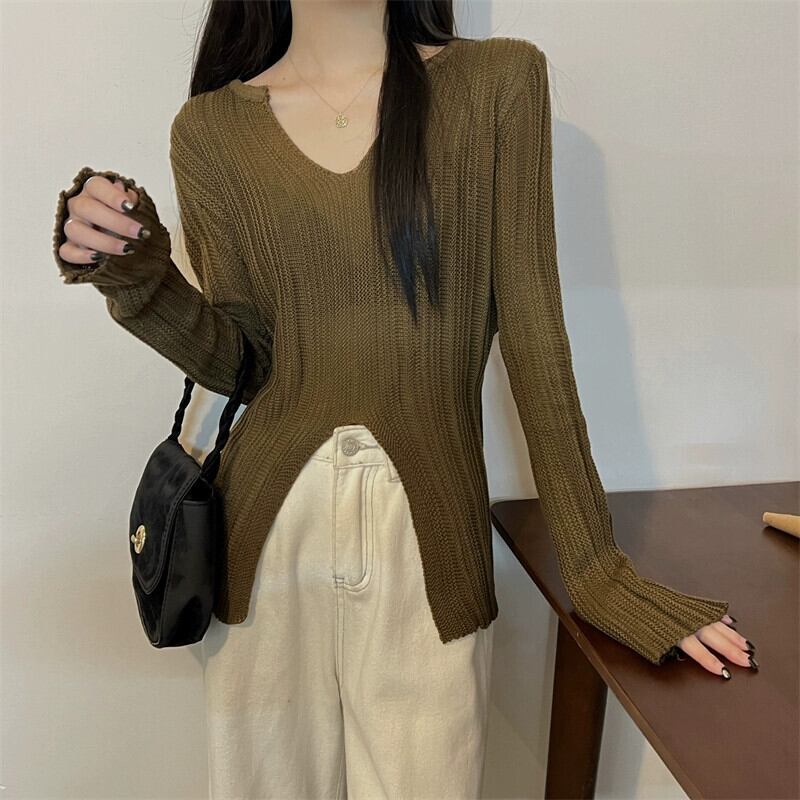 スリム V ネック長袖セーター女性 2023 秋の新作ファッションファッショナブルな裾スリット不規則なトップアプリコット ロング オータム 秋物 Vネック 7460040438885107 | framboise21