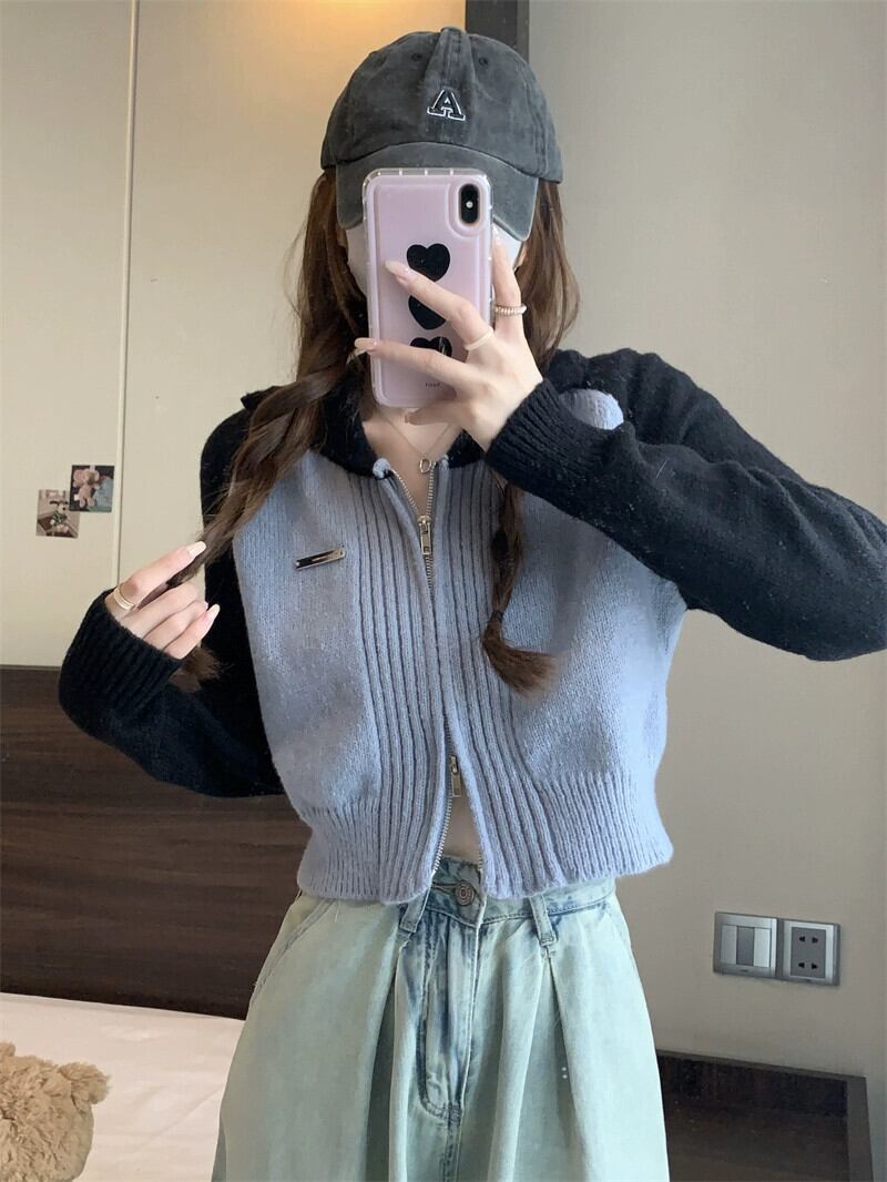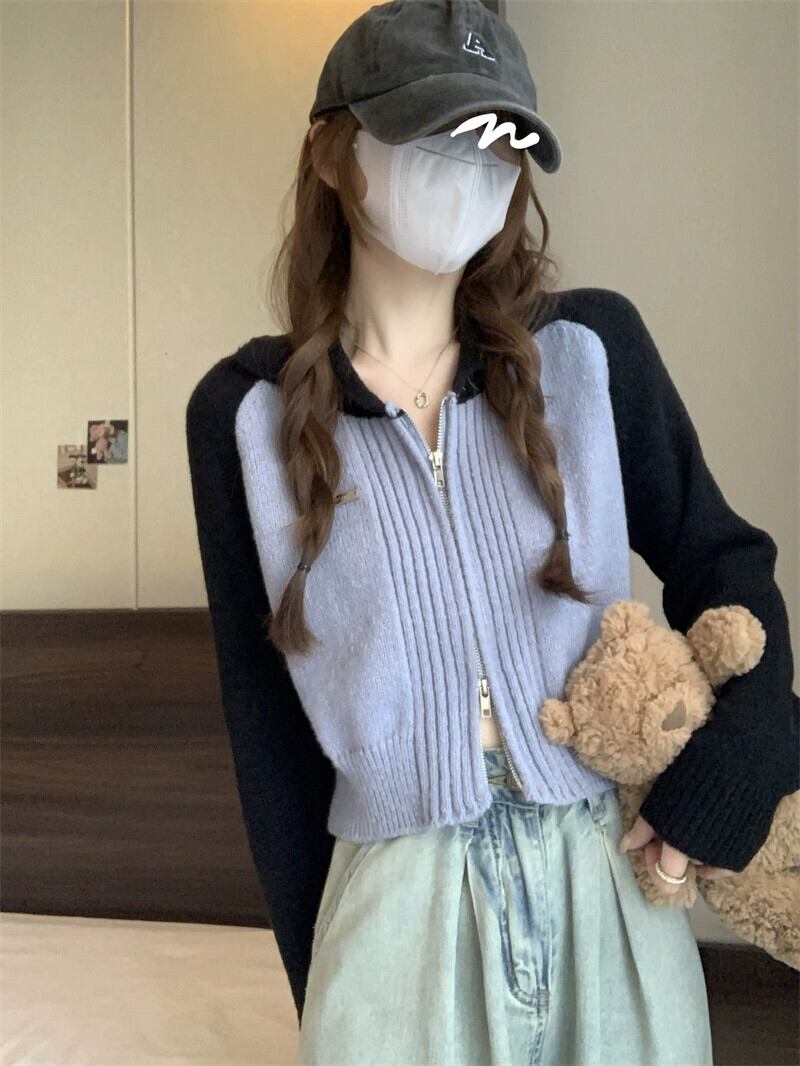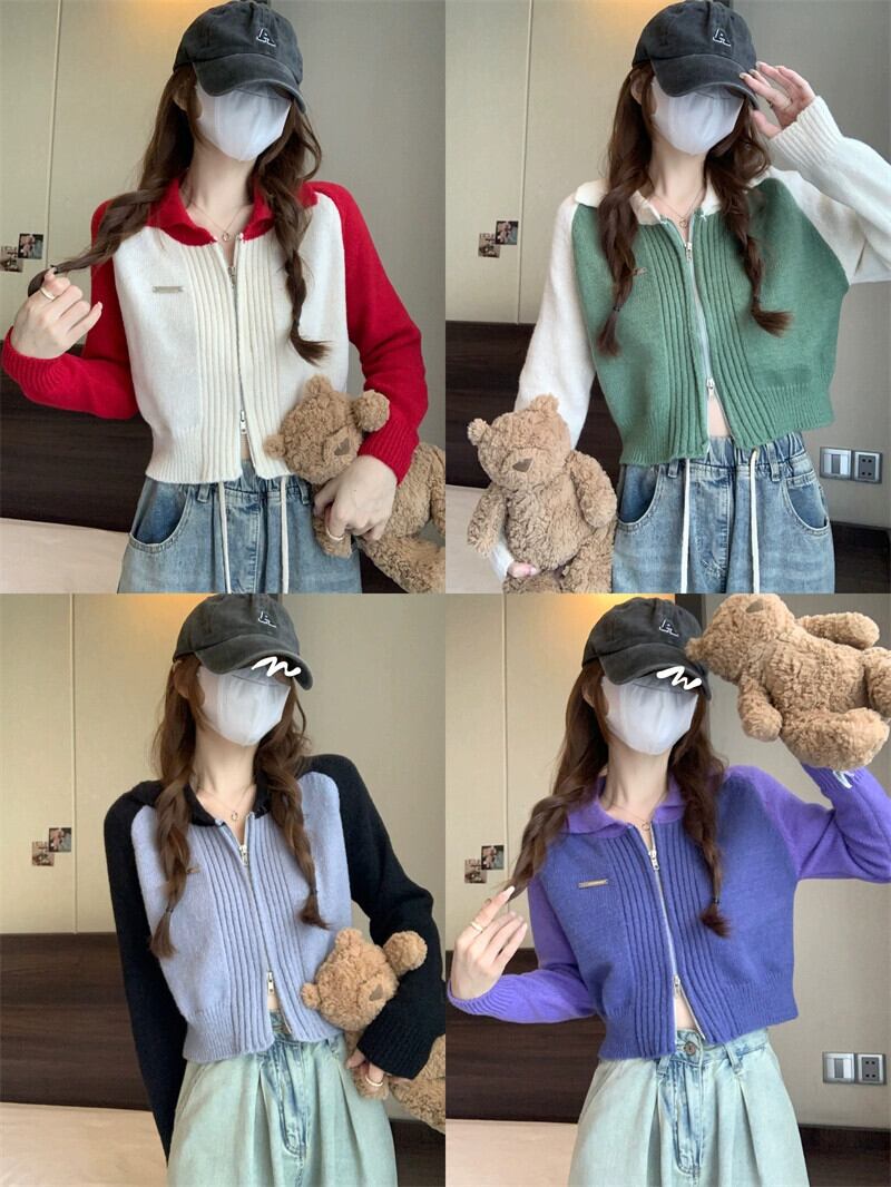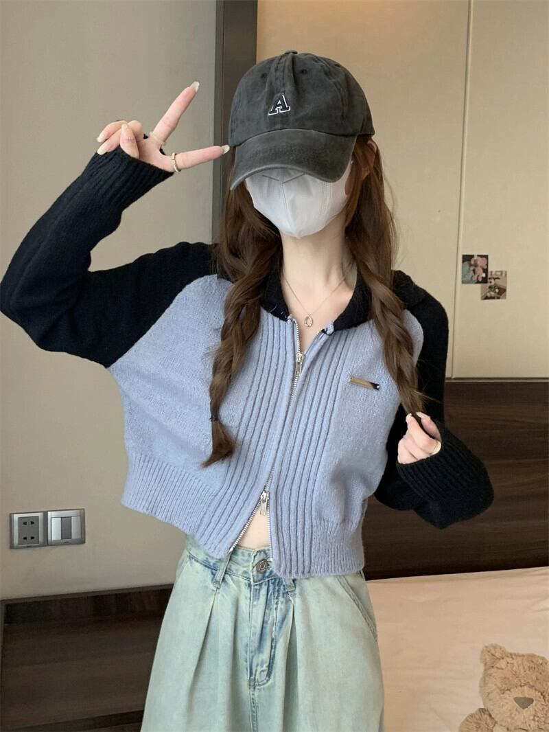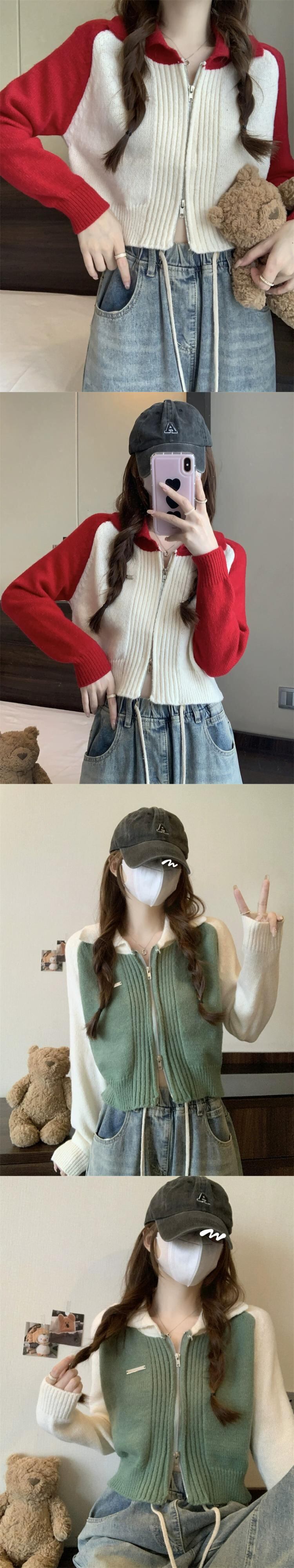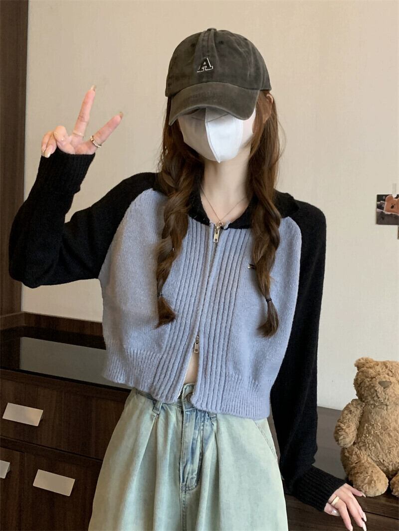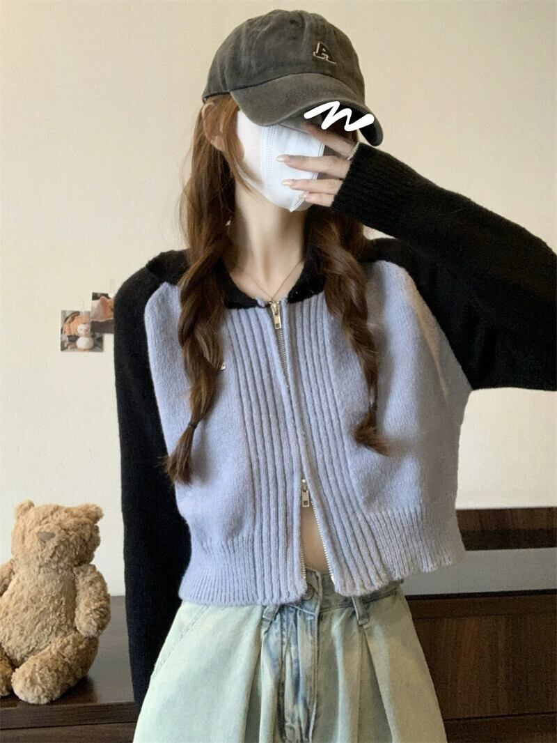 ダブルジッパーショートセータージャケット女性の秋と冬のアメリカンレトロルーズアウターウェアスリムコントラストカラー長袖ニットカーディガン ロング オータム 秋物 ウィンター 冬物 7460034546215281 | framboise21