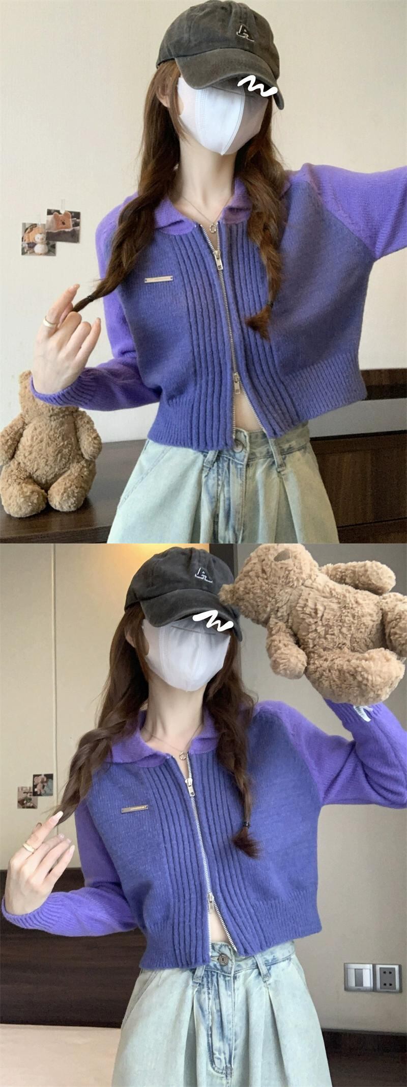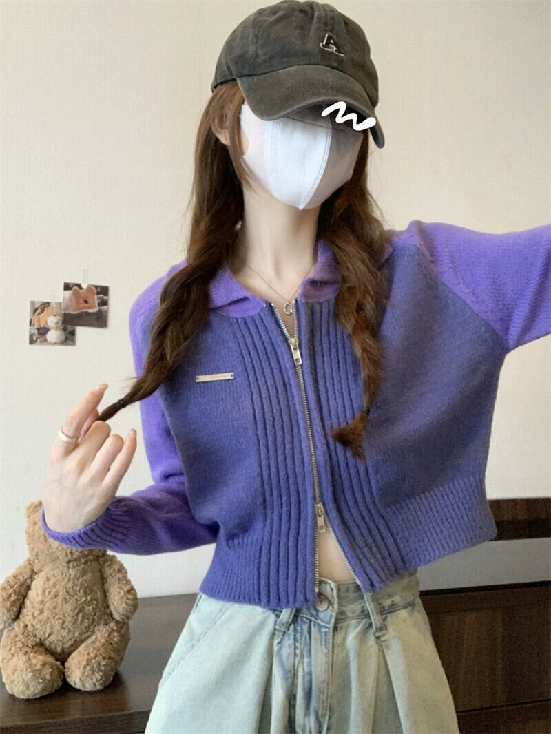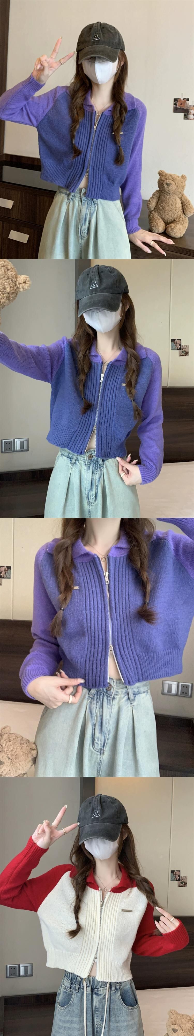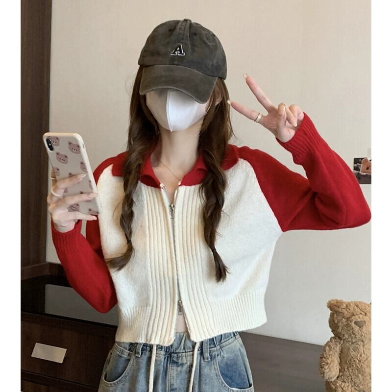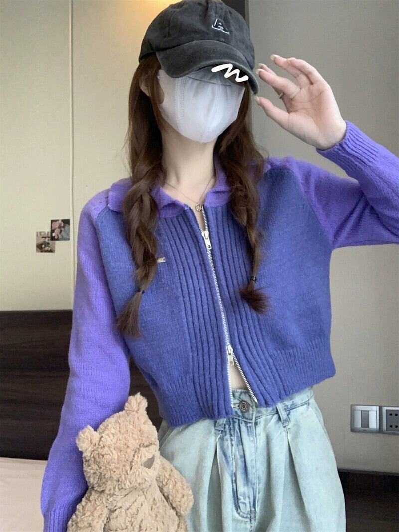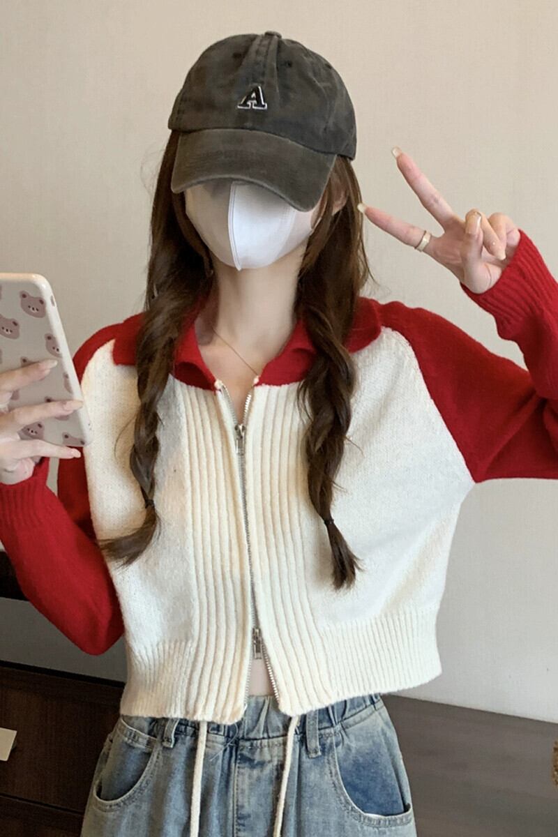 ダブルジッパーショートセータージャケット女性の秋と冬のアメリカンレトロルーズアウターウェアスリムコントラストカラー長袖ニットカーディガン ロング オータム 秋物 ウィンター 冬物 7460034546215281 | framboise21