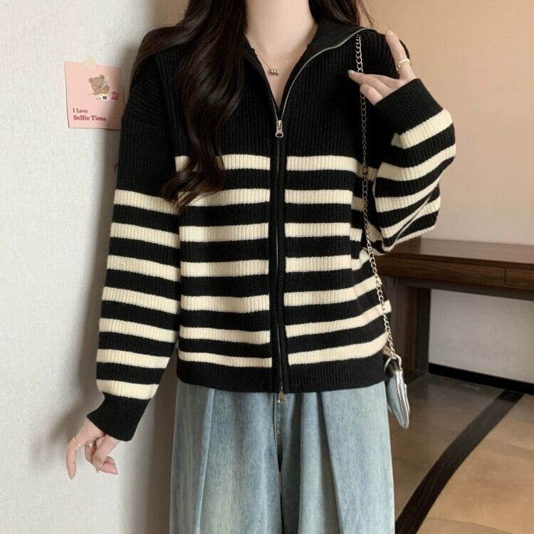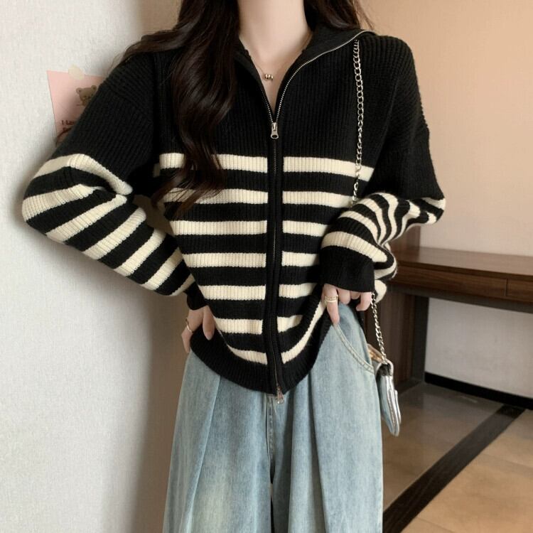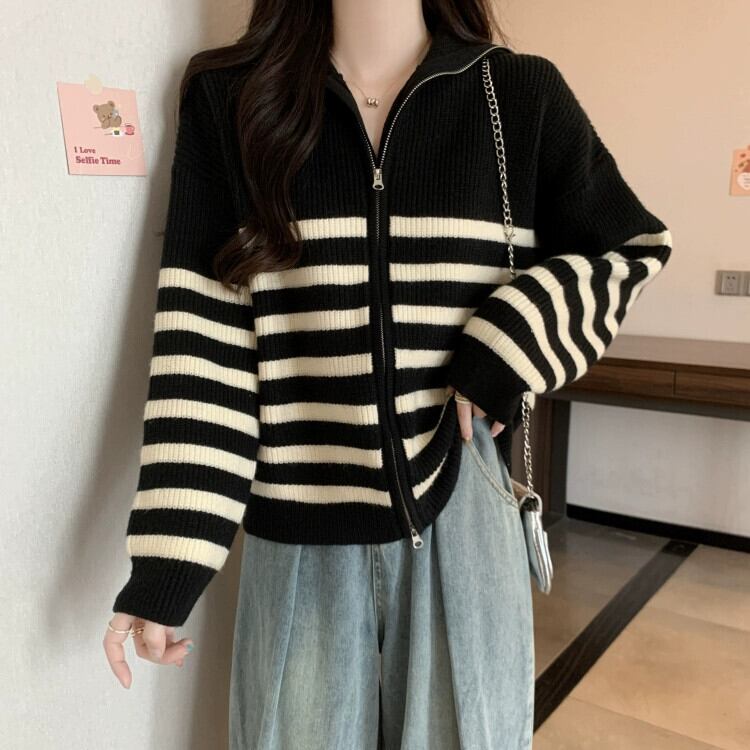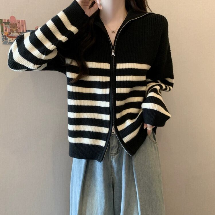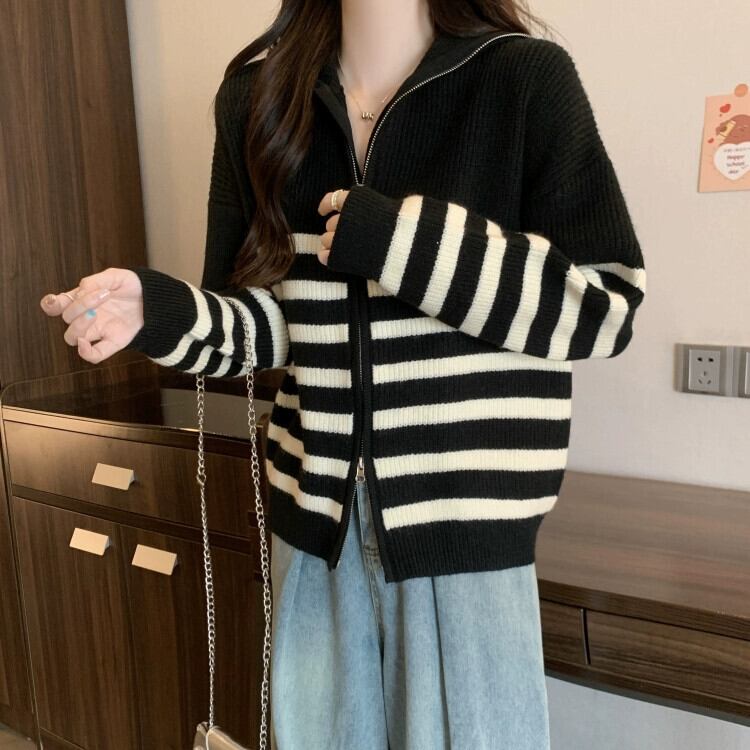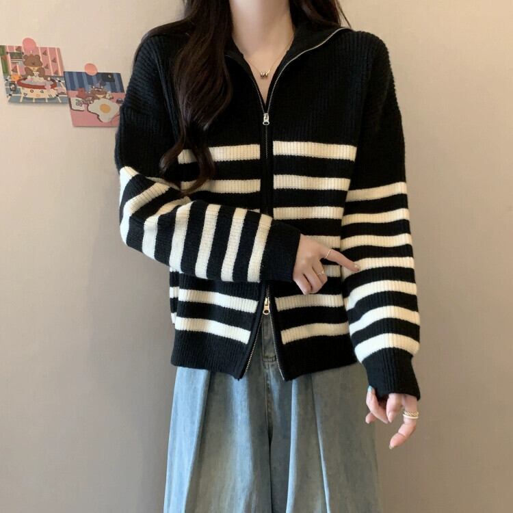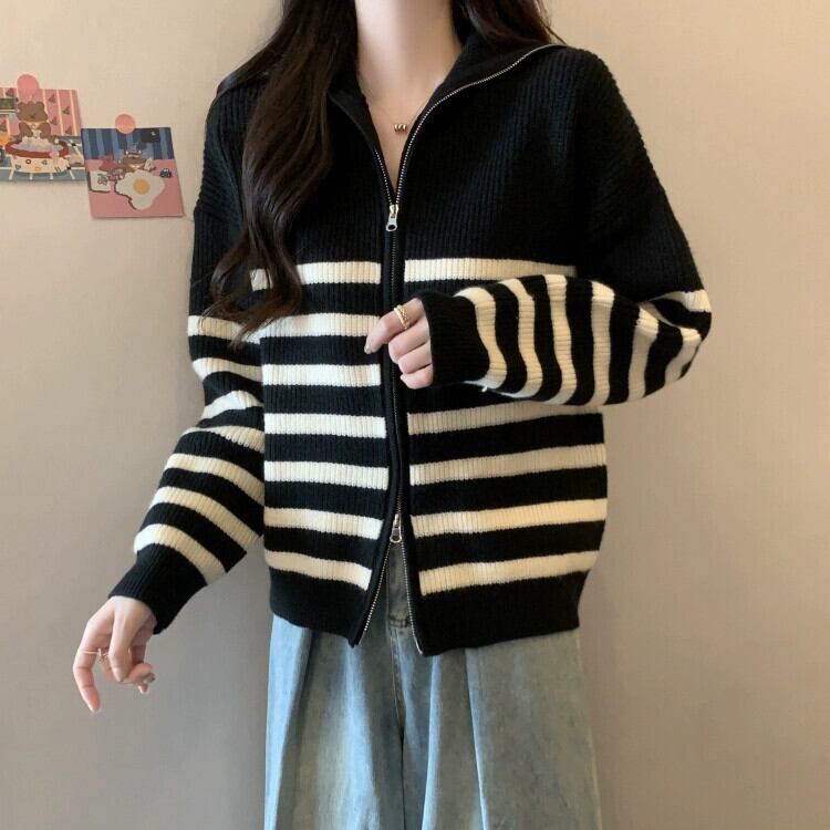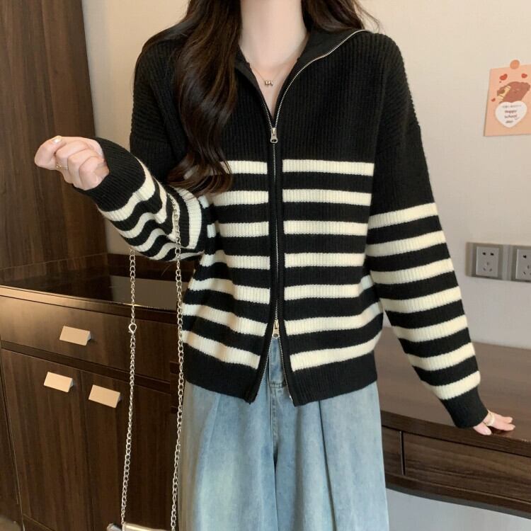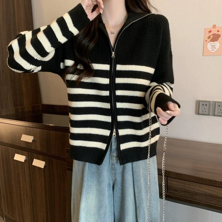 ダブルジッパーストライプセータージャケット女性秋と冬 2023 新しいスタイルルーズアウタースリム長袖ニットカーディガン ロング オータム 秋物 ウィンター 冬物 7460059553487535 | framboise21
