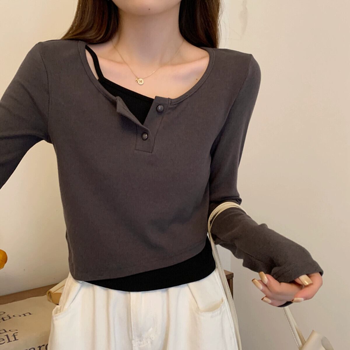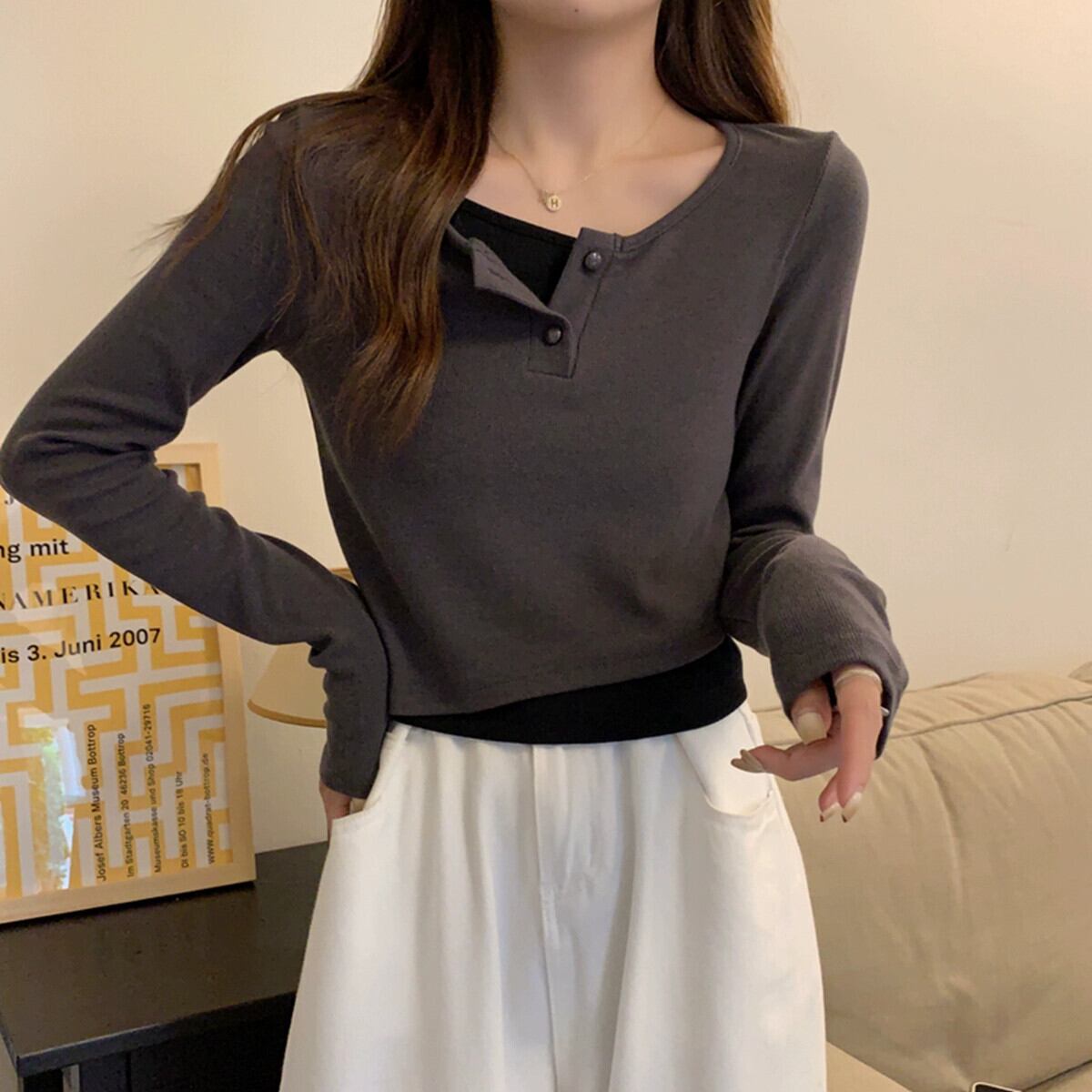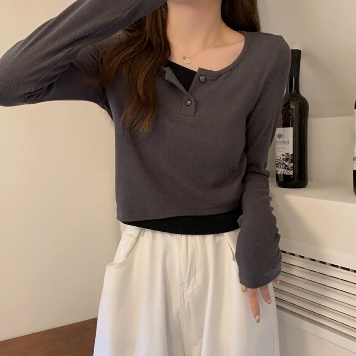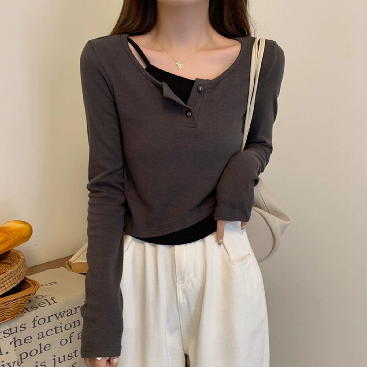 偽のツーピースの長袖トップスの女性、春と秋のデザイン、グレーのボトムシャツ、ゆったりと多用途、短いTシャツの小人 ショート ロング スプリング 春物 オータム 秋物 7460072531033968 | framboise21