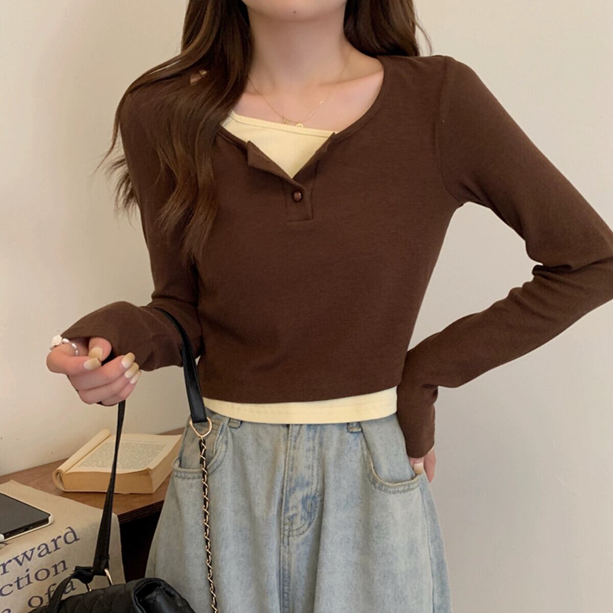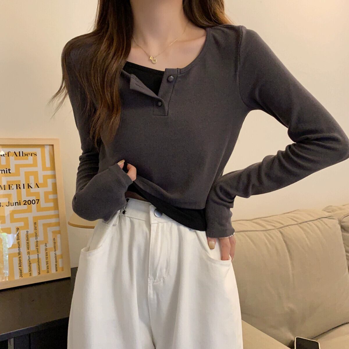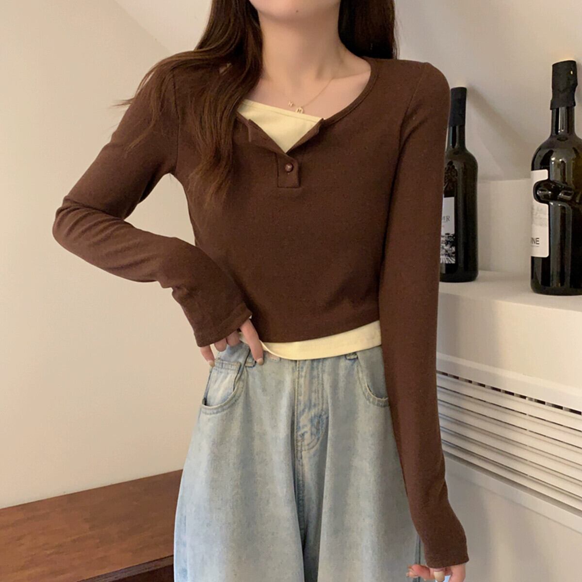 偽のツーピースの長袖トップスの女性、春と秋のデザイン、グレーのボトムシャツ、ゆったりと多用途、短いTシャツの小人 ショート ロング スプリング 春物 オータム 秋物 7460072531033968 | framboise21