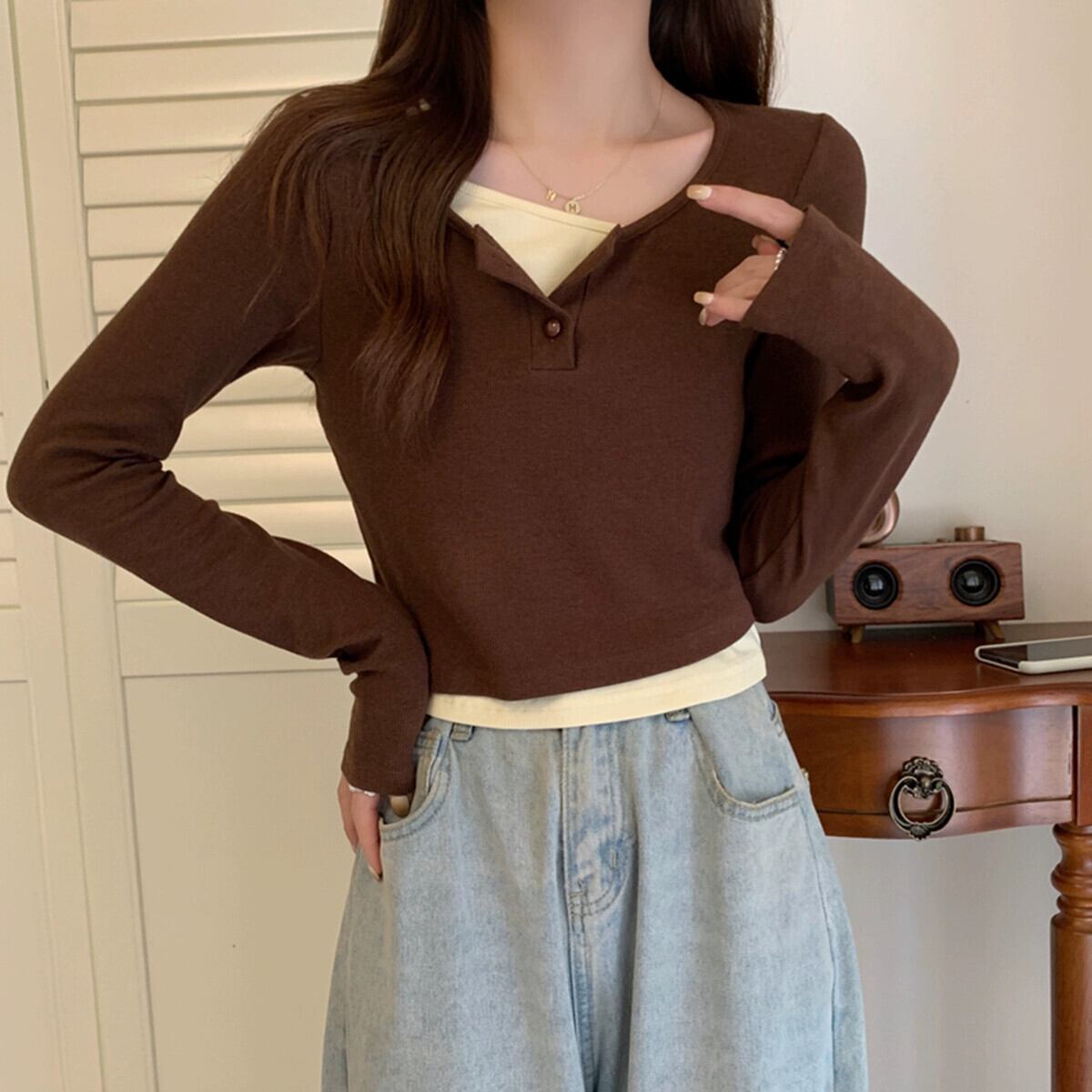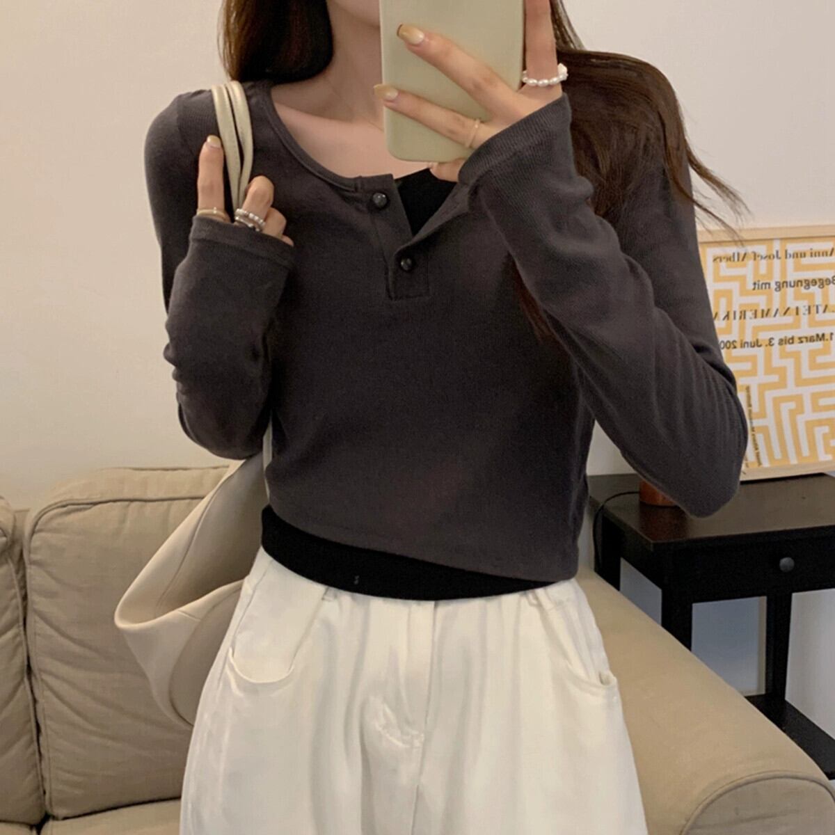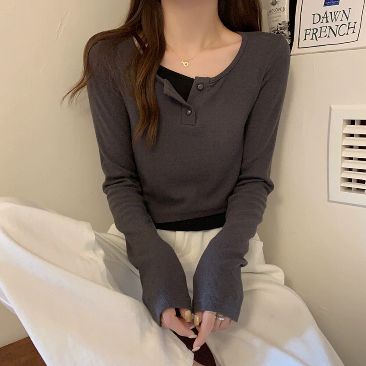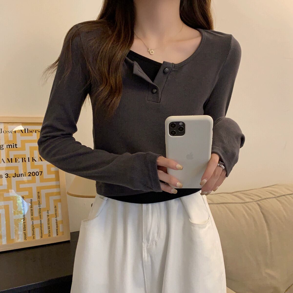 偽のツーピースの長袖トップスの女性、春と秋のデザイン、グレーのボトムシャツ、ゆったりと多用途、短いTシャツの小人 ショート ロング スプリング 春物 オータム 秋物 7460072531033968 | framboise21