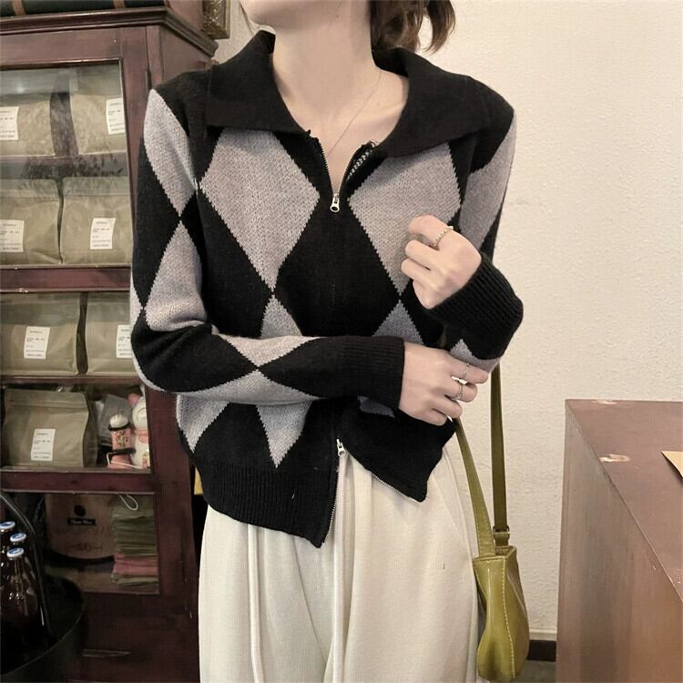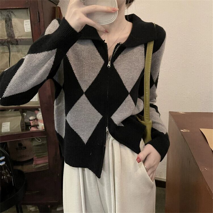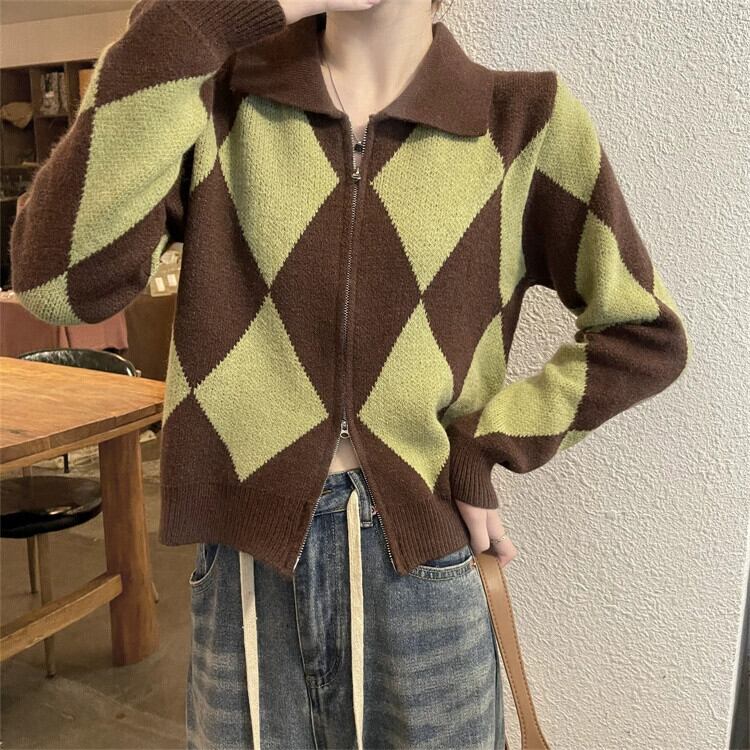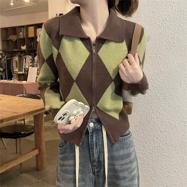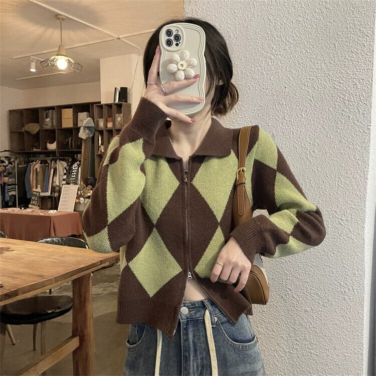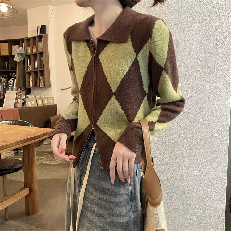 ポロ襟ニットカーディガンセーター女性秋と冬 2023 新しいレトロなルーズアウターウェア対照的な色のショートジッパージャケット オータム 秋物 ウィンター 冬物 7460095344855510 | framboise21