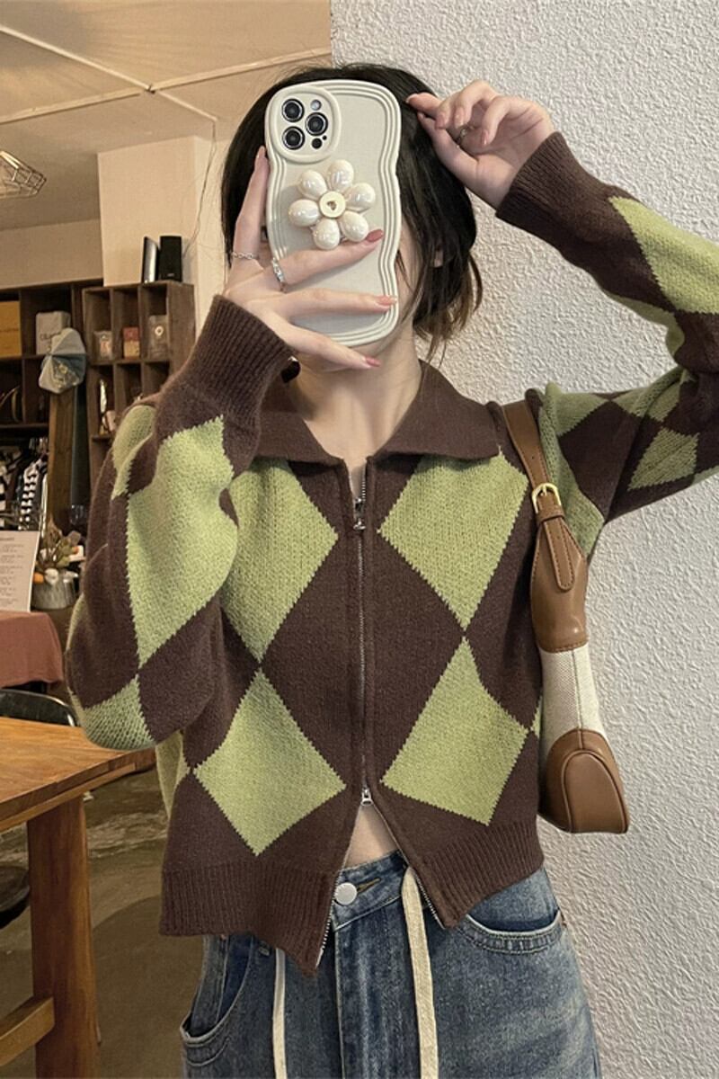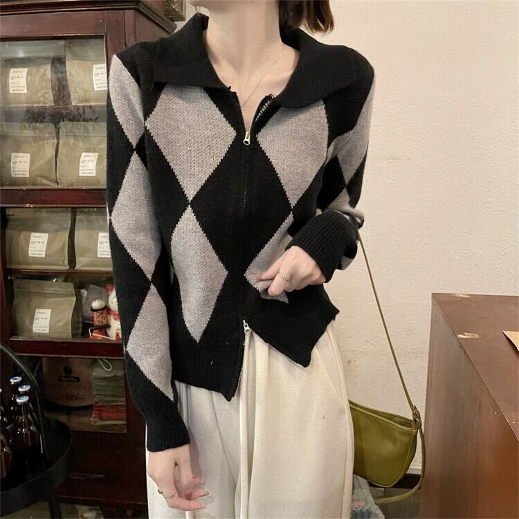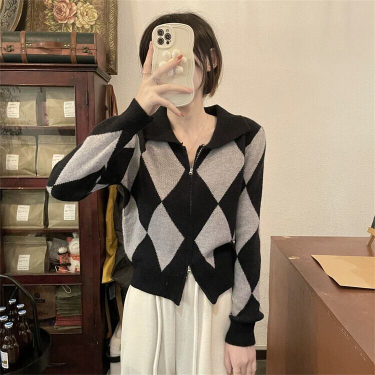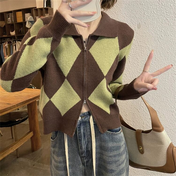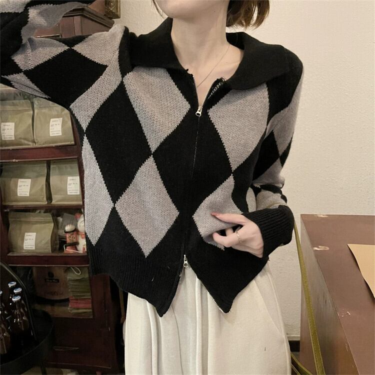 ポロ襟ニットカーディガンセーター女性秋と冬 2023 新しいレトロなルーズアウターウェア対照的な色のショートジッパージャケット オータム 秋物 ウィンター 冬物 7460095344855510 | framboise21