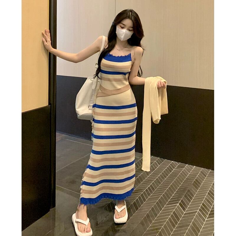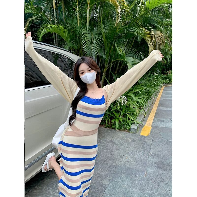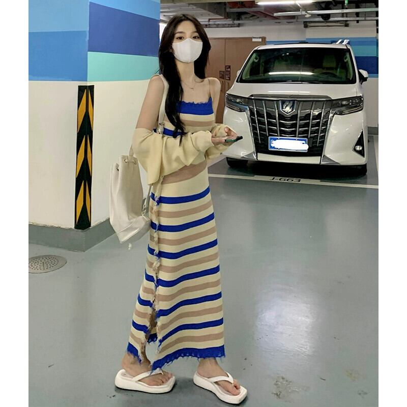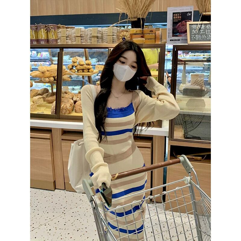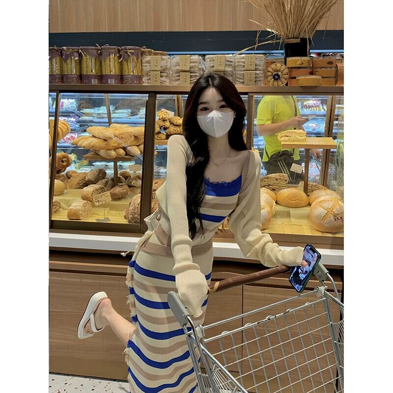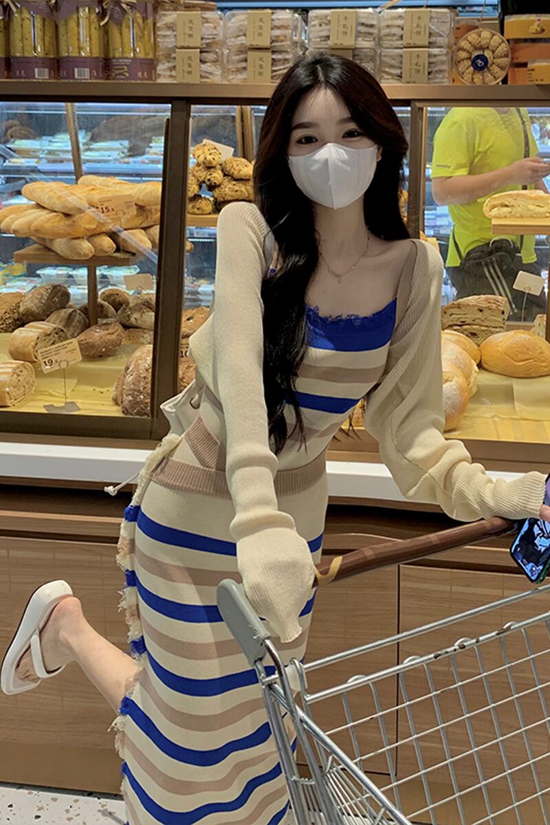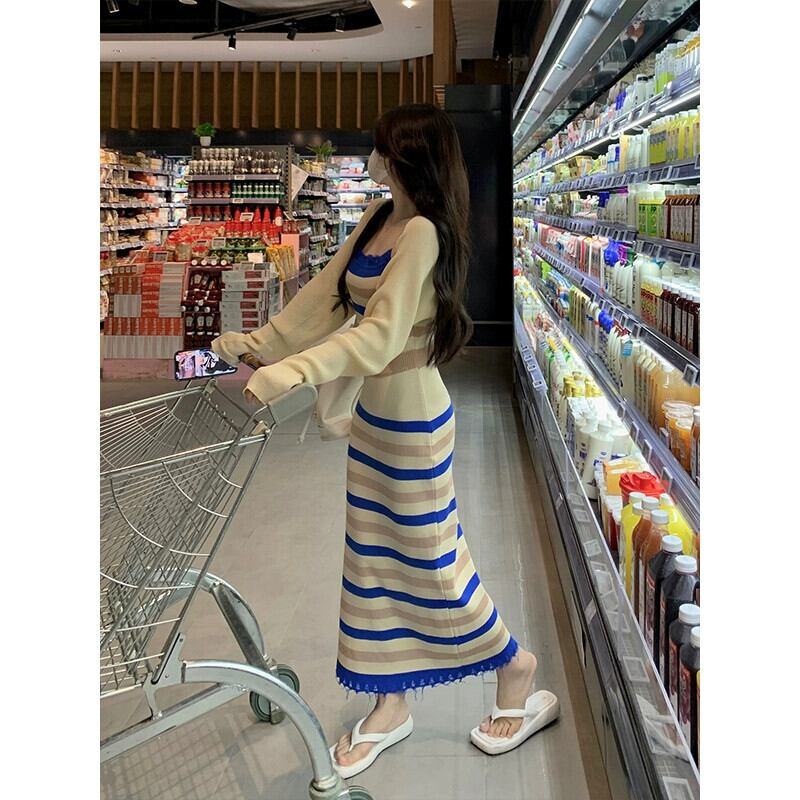 秋冬のストライプニットサスペンダードレスレディース、腰にかかるロングスカート、着痩せショートカーディガンとスカートの2点セット オータム 秋物 ウィンター 冬物 7460098965326817 | framboise21