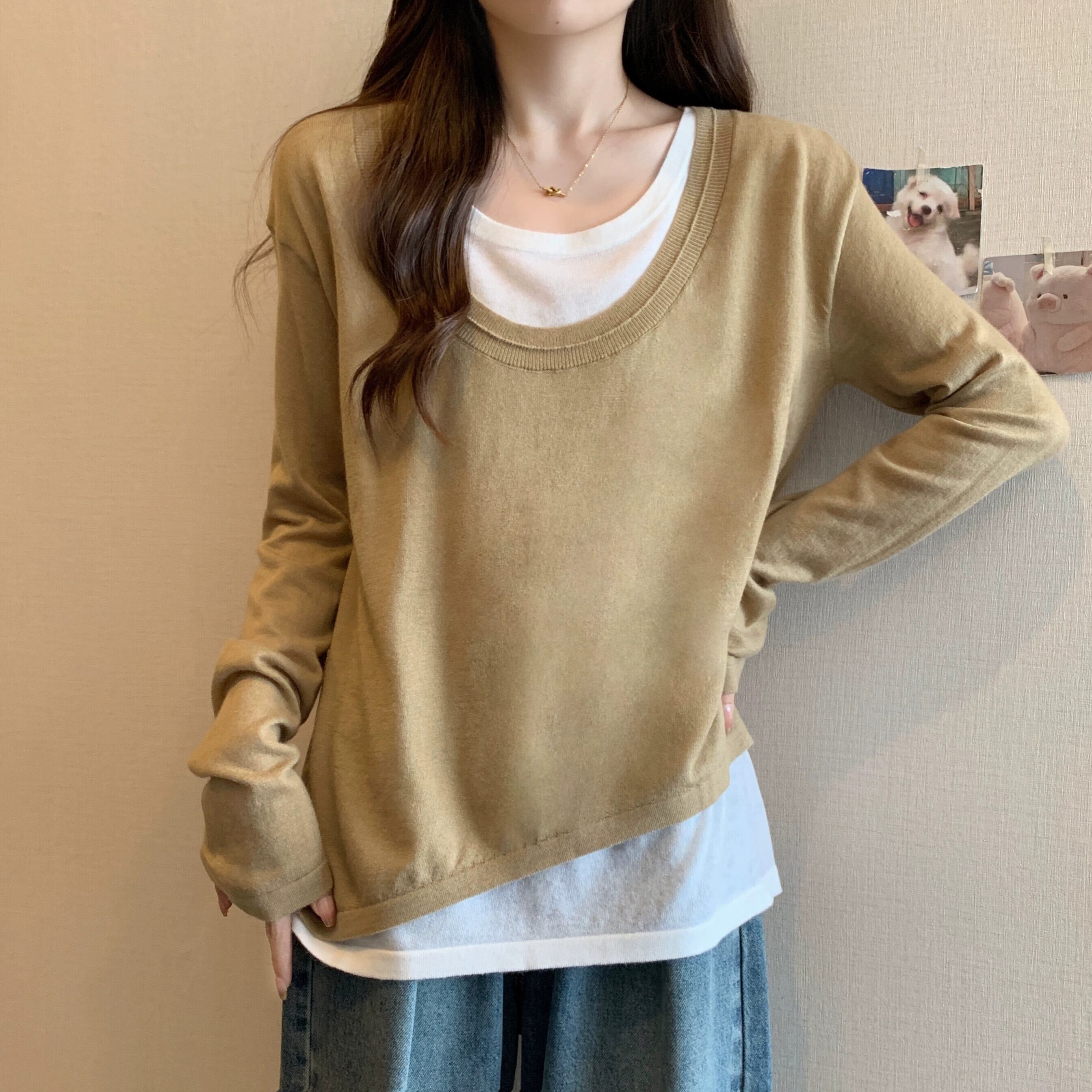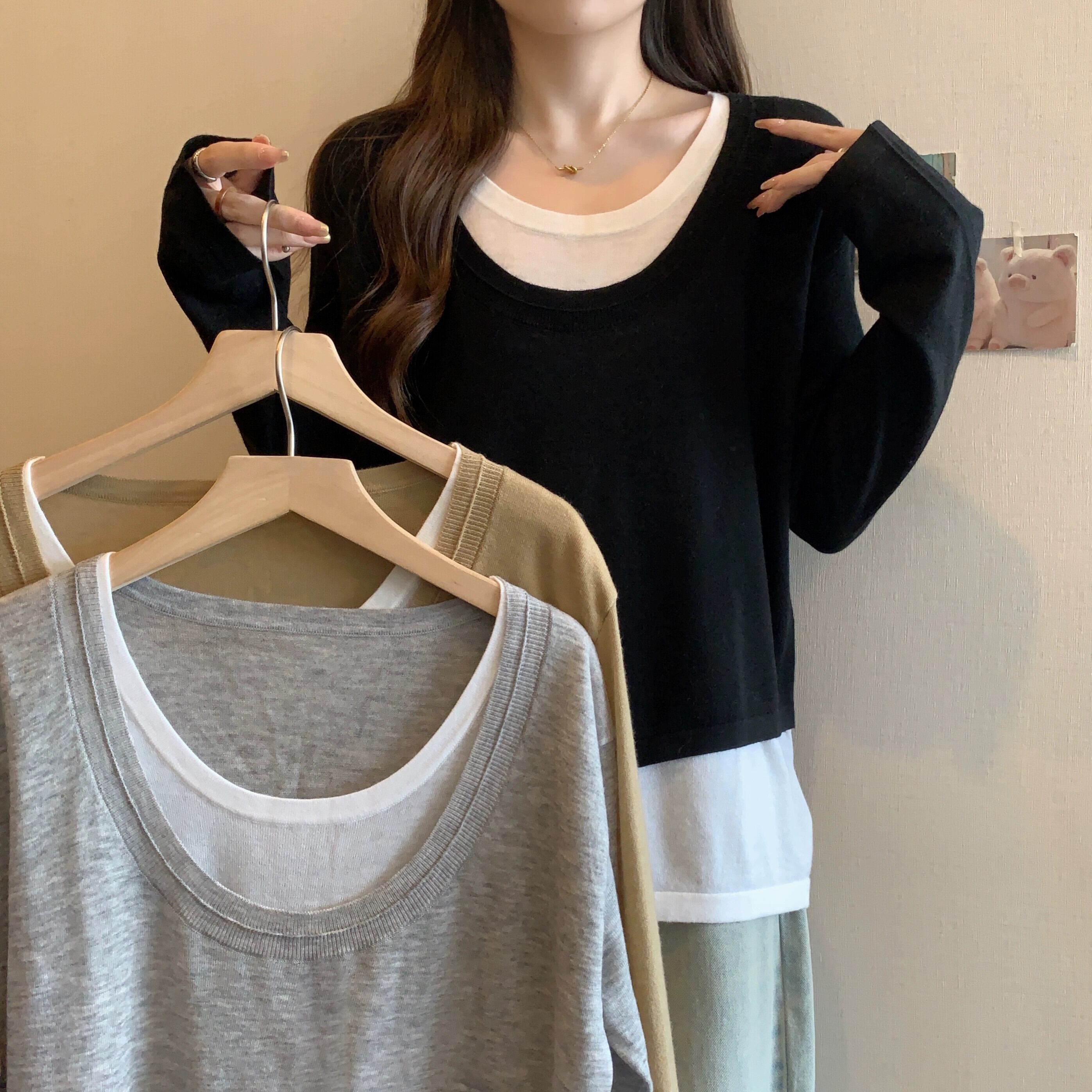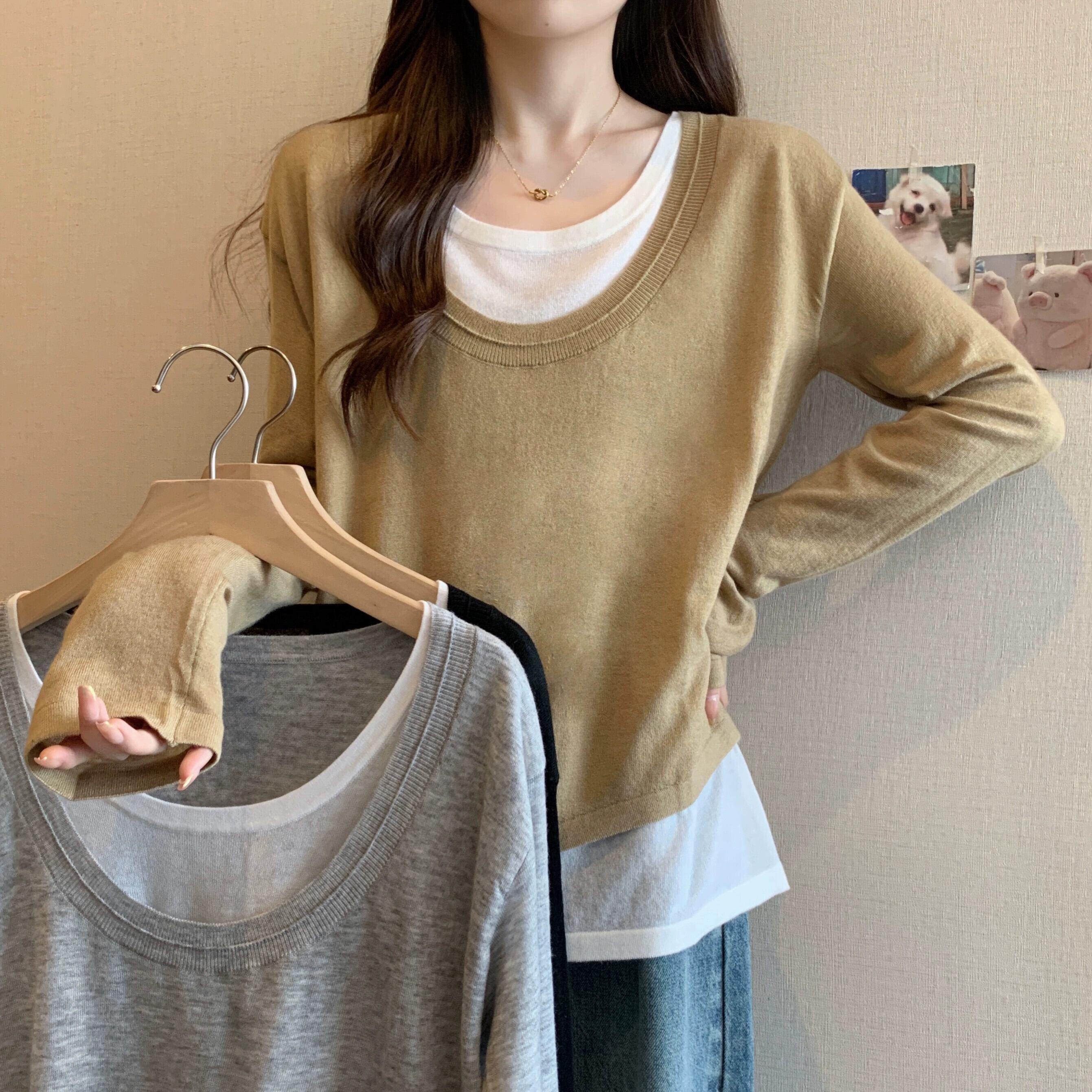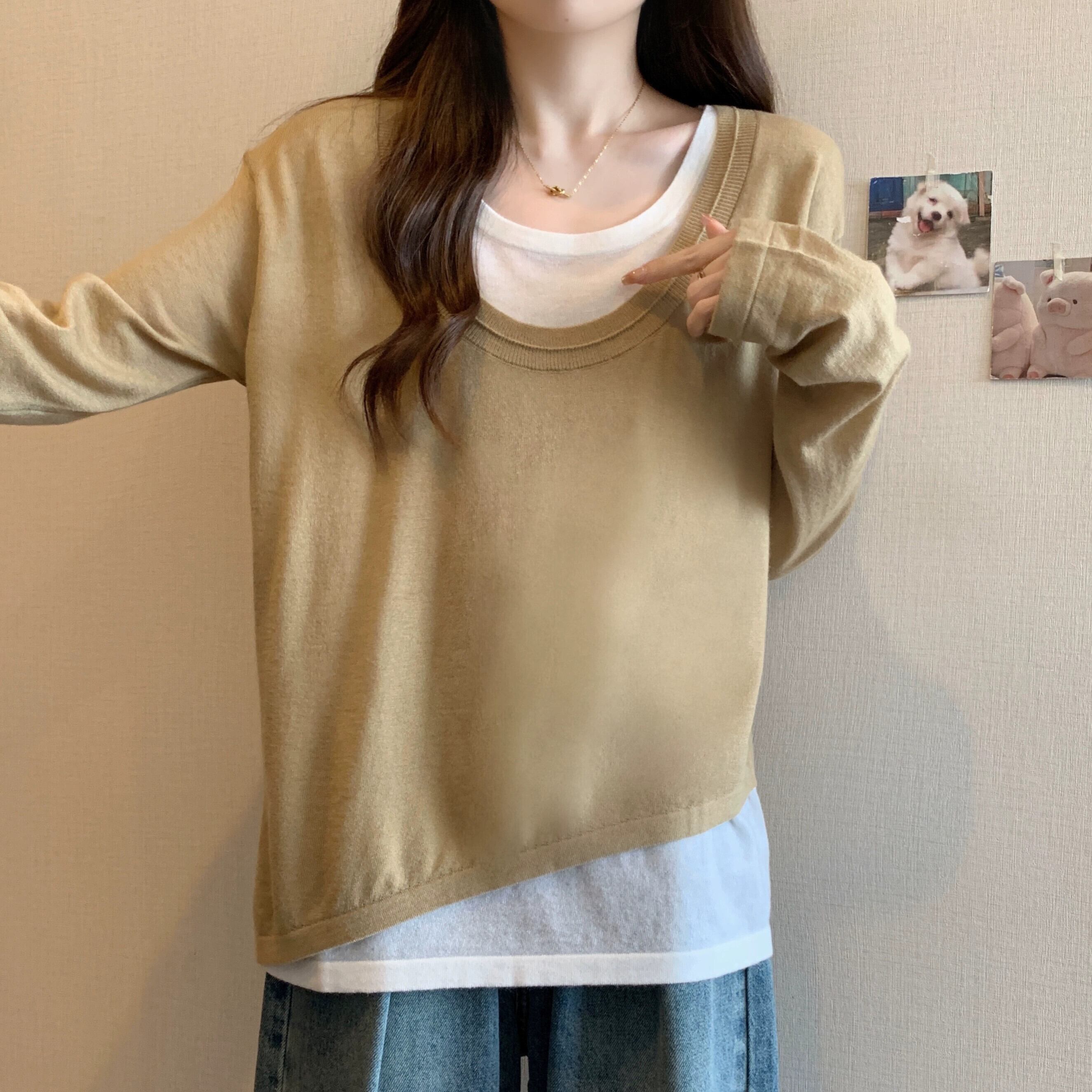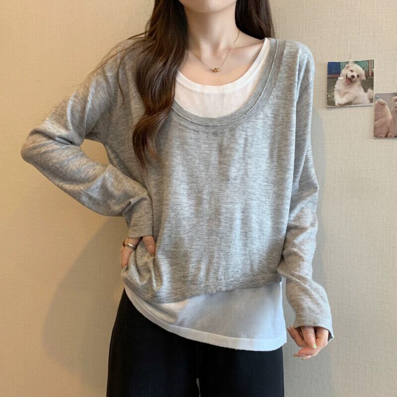 グレーのフェイクツーピースボトリングシャツレディース、春と秋のファッションデザイン、ルーズインナー、不規則なニット長袖トップ ロング スプリング 春物 オータム 秋物 7460019207810378 | framboise21