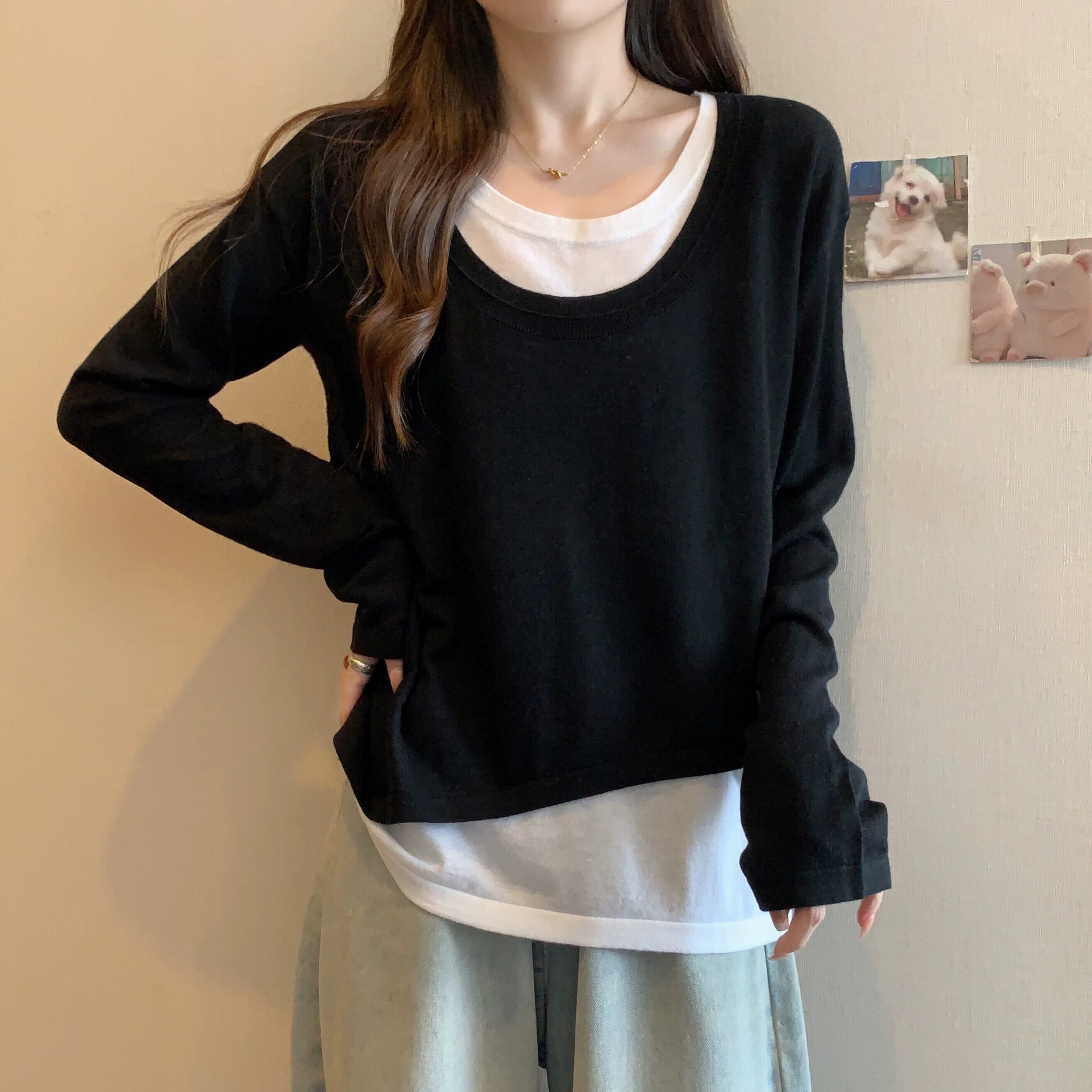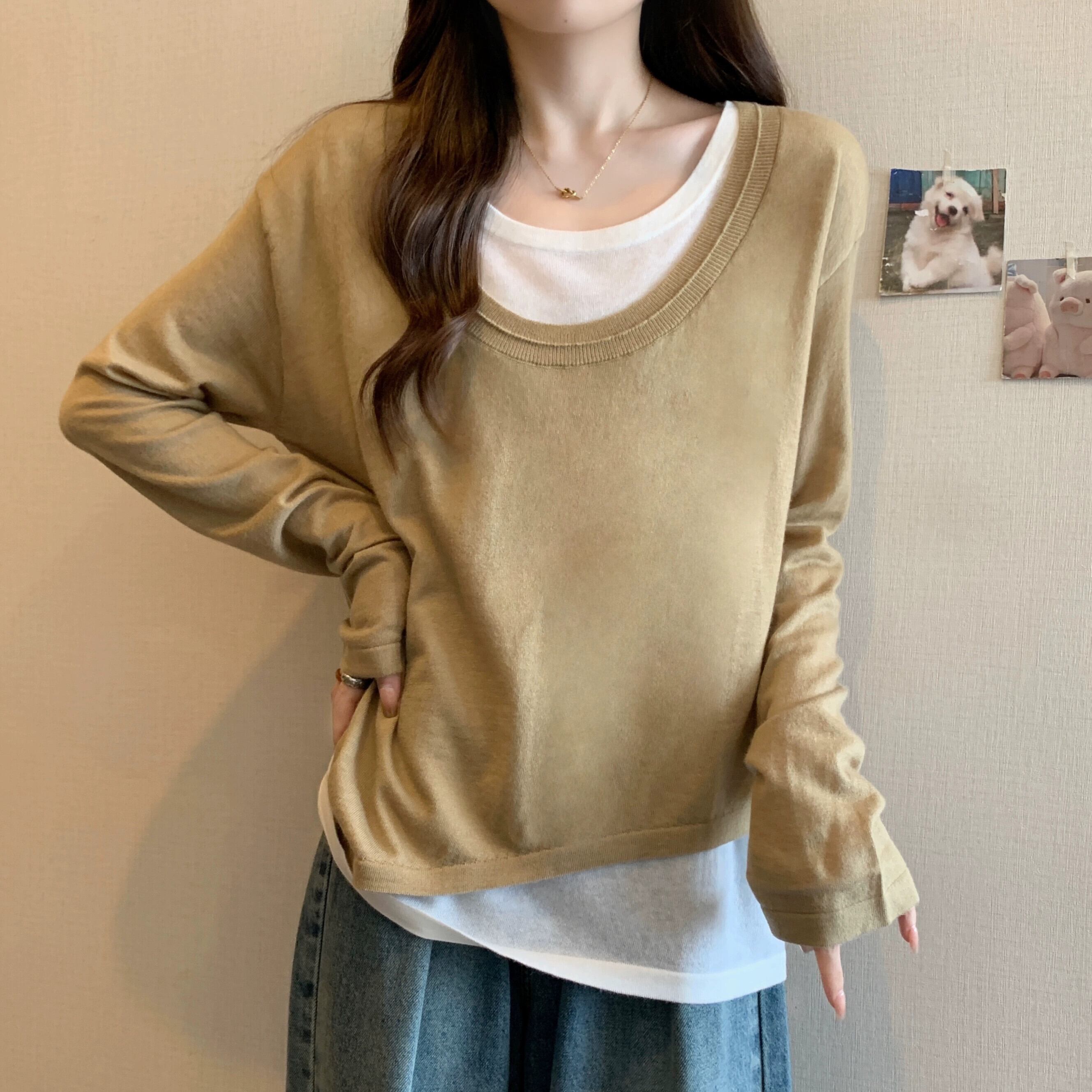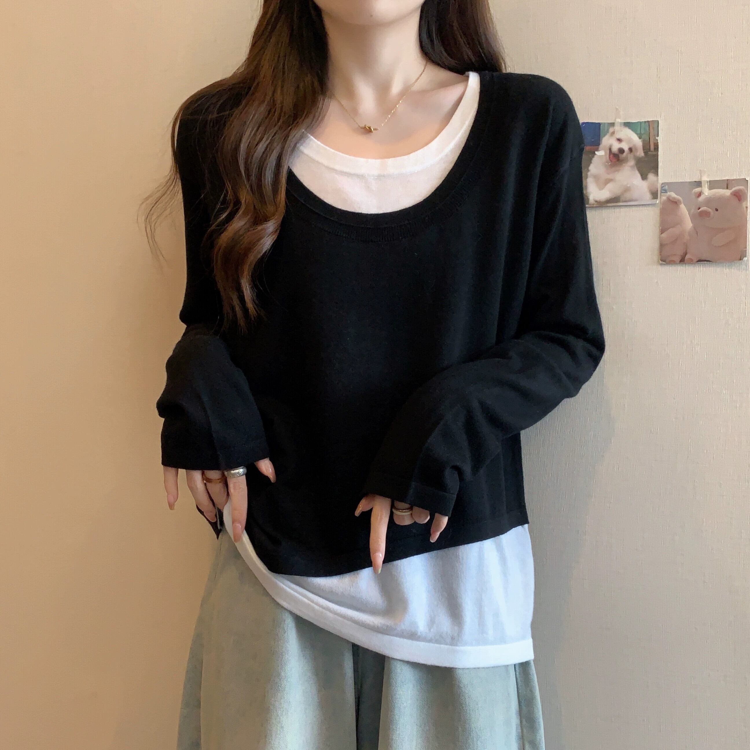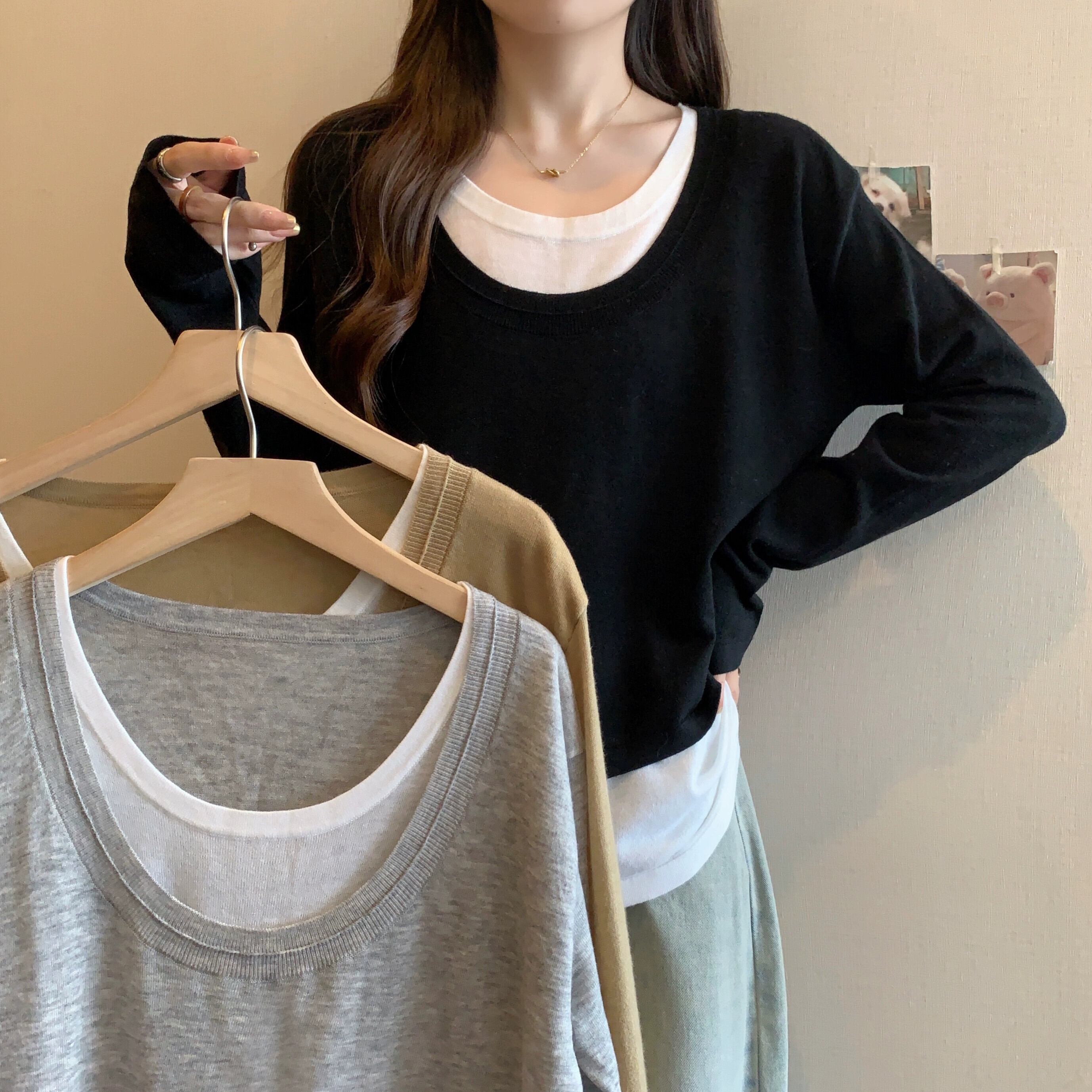 グレーのフェイクツーピースボトリングシャツレディース、春と秋のファッションデザイン、ルーズインナー、不規則なニット長袖トップ ロング スプリング 春物 オータム 秋物 7460019207810378 | framboise21