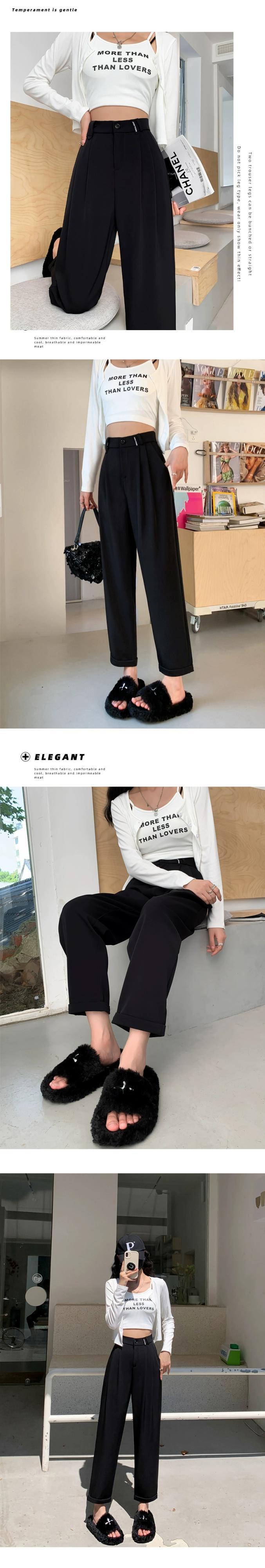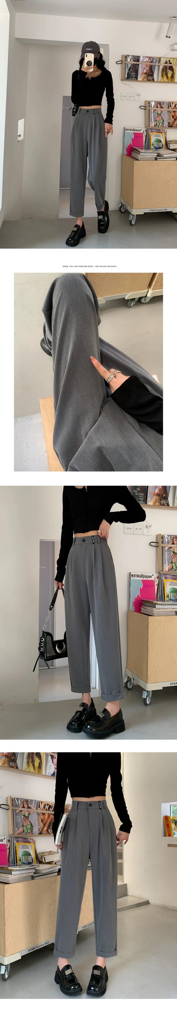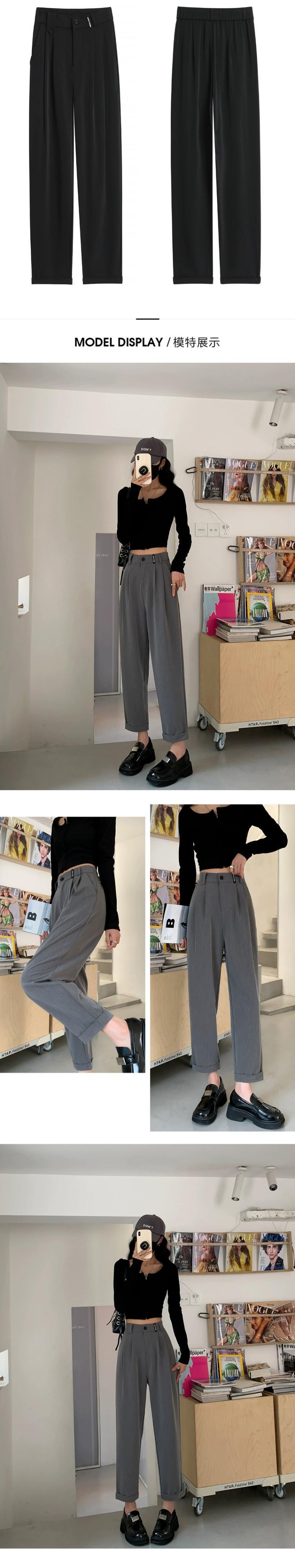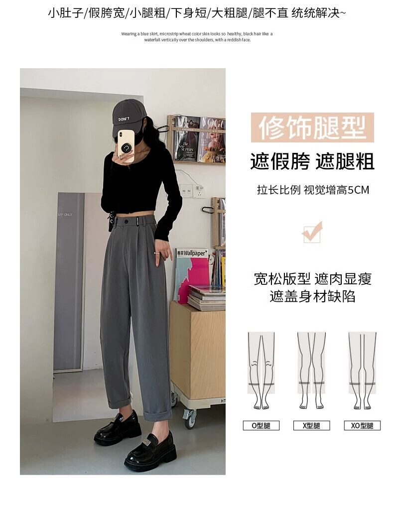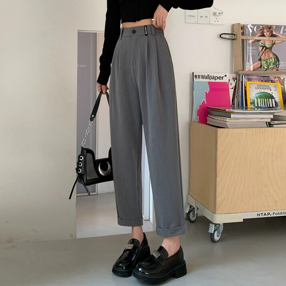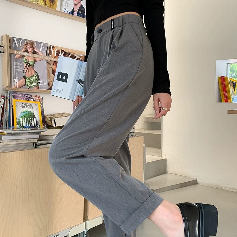 春と秋のグレーの狭い9点スーツパンツの女性、ストレートワイドレッグパンツ、小柄な人、スリム、ハイウエスト、ドレープのあるカジュアルパンツ スプリング 春物 オータム 秋物 7460098874497422 | framboise21