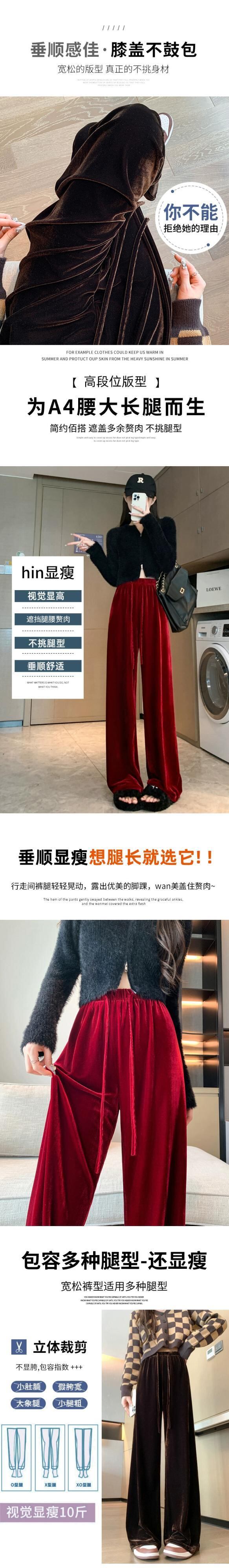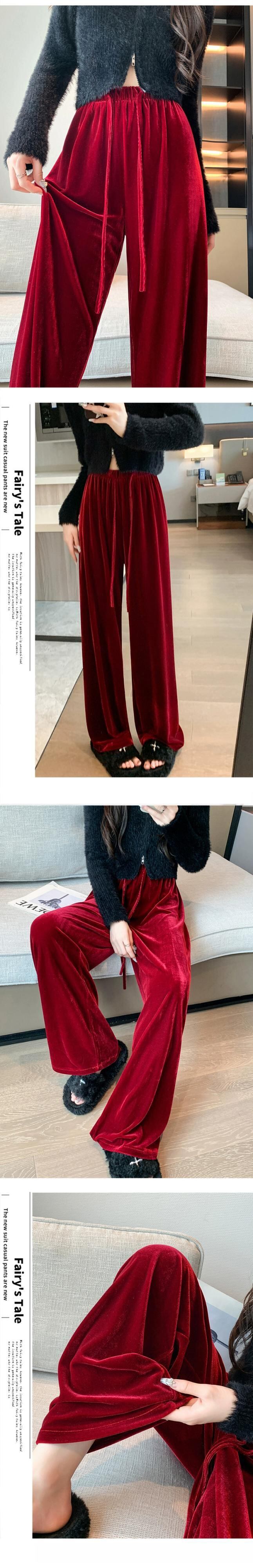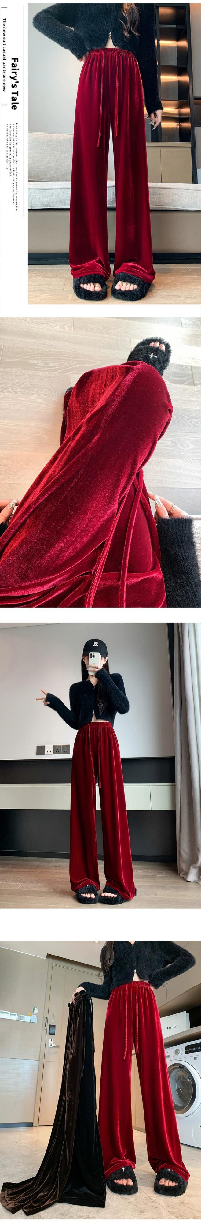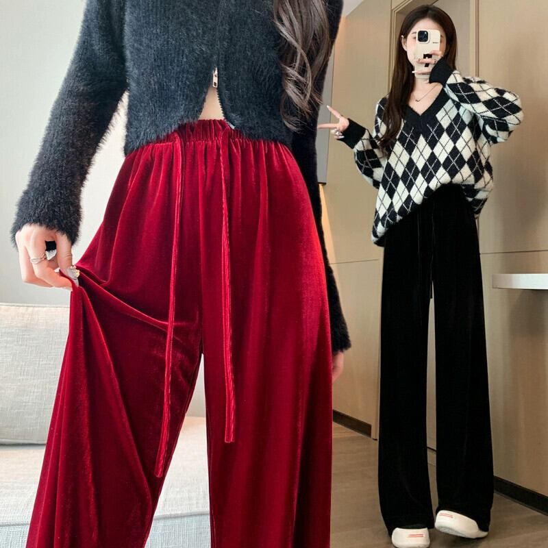 秋冬の厚みのあるゴールドベルベットのワイドレッグパンツの女性、怠惰なスタイルのハイウエストドレープストレートカジュアルフロアレングスバーガンディパンツ オータム 秋物 ウィンター 冬物 7460080094639494 | framboise21