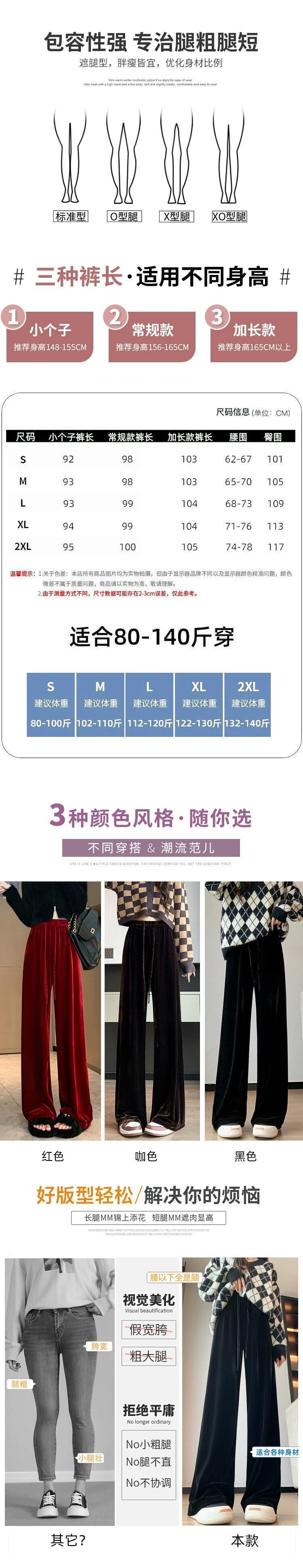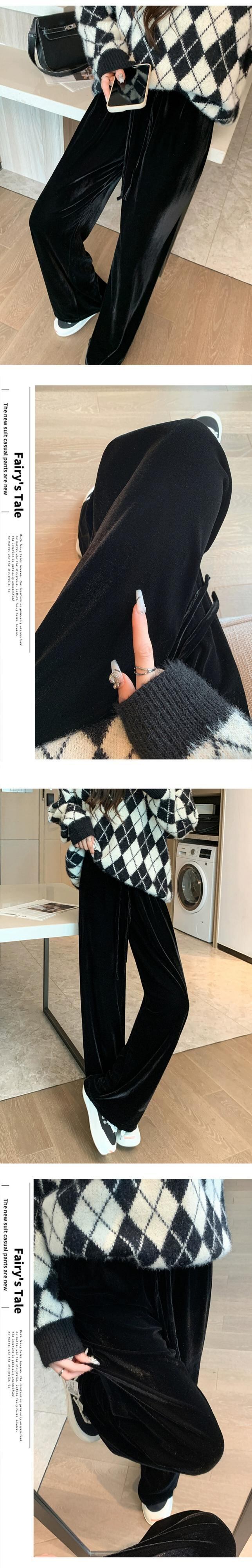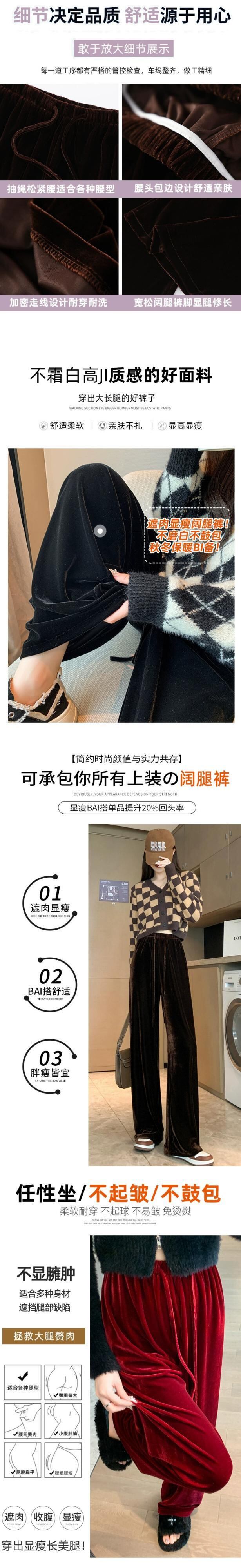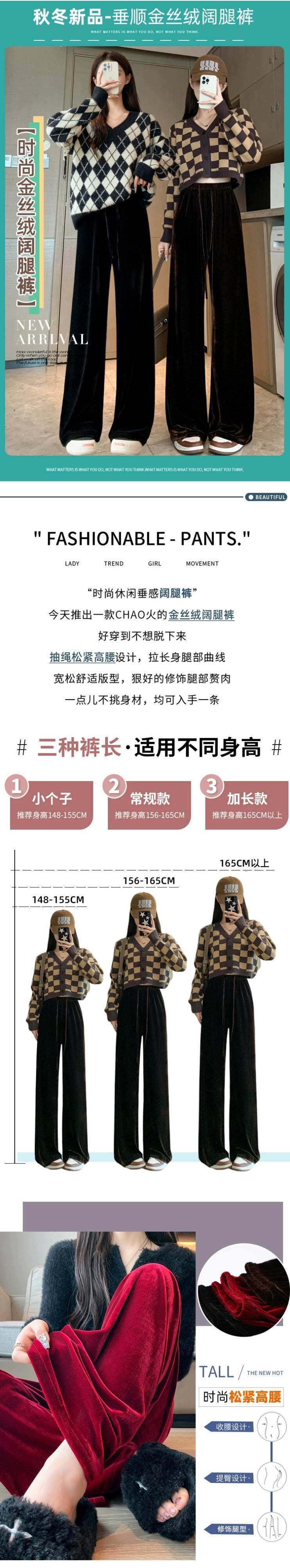 秋冬の厚みのあるゴールドベルベットのワイドレッグパンツの女性、怠惰なスタイルのハイウエストドレープストレートカジュアルフロアレングスバーガンディパンツ オータム 秋物 ウィンター 冬物 7460080094639494 | framboise21