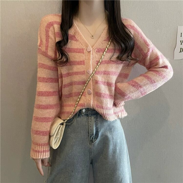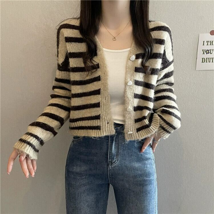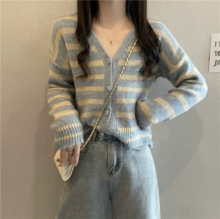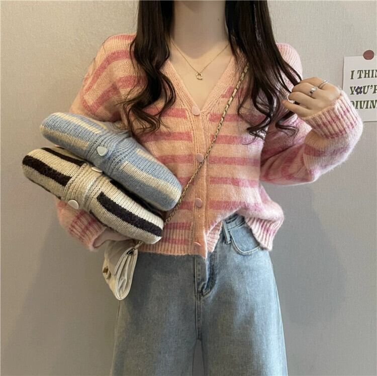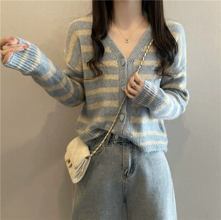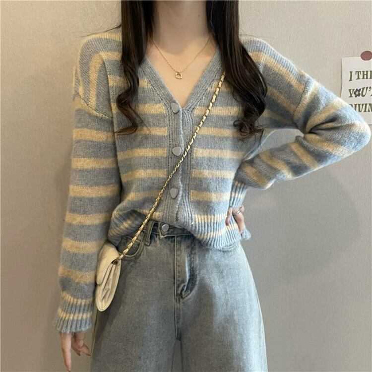 ストライプカーディガンセータージャケット女性 2023 春と秋の新作ルーズアウターウェア小さなショート V ネックセーター スプリング 春物 オータム 秋物 Vネック 7460043736722159 | framboise21
