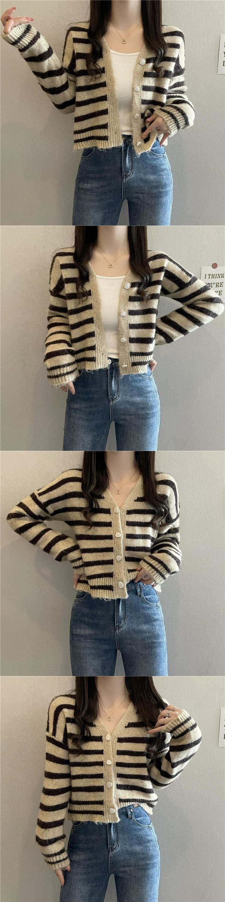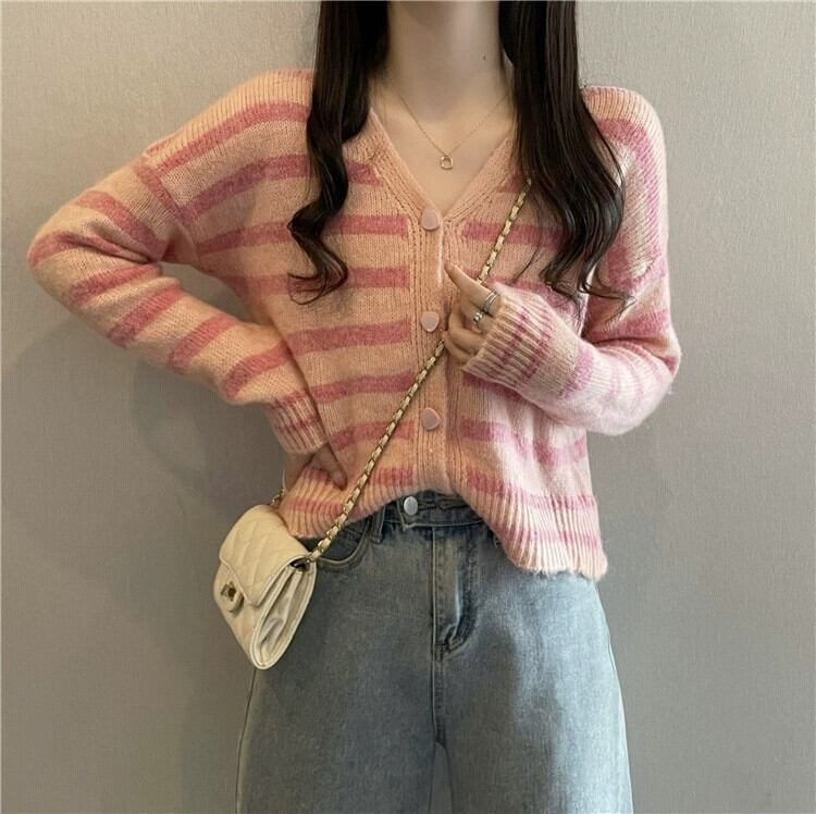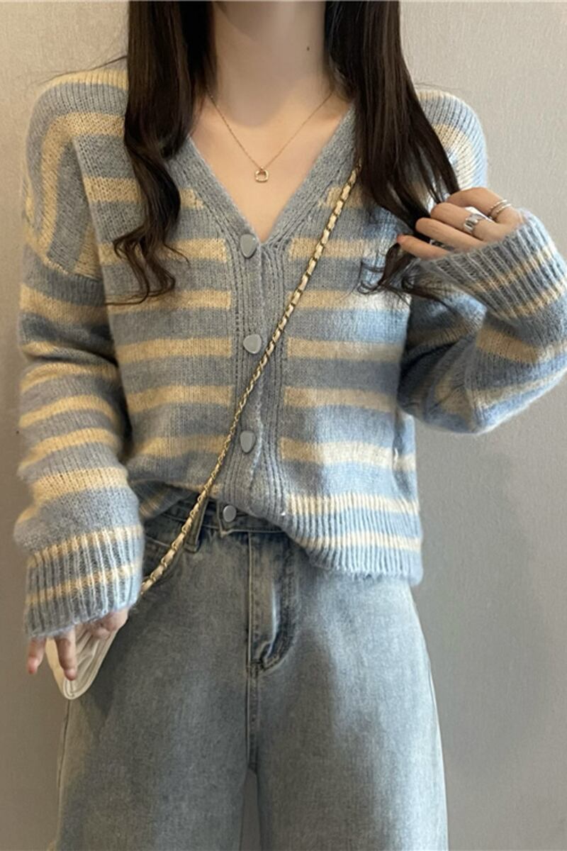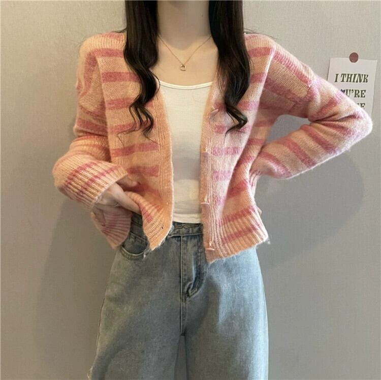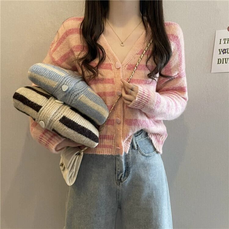 ストライプカーディガンセータージャケット女性 2023 春と秋の新作ルーズアウターウェア小さなショート V ネックセーター スプリング 春物 オータム 秋物 Vネック 7460043736722159 | framboise21