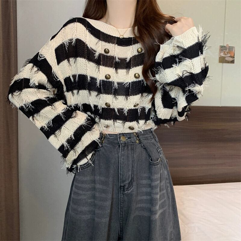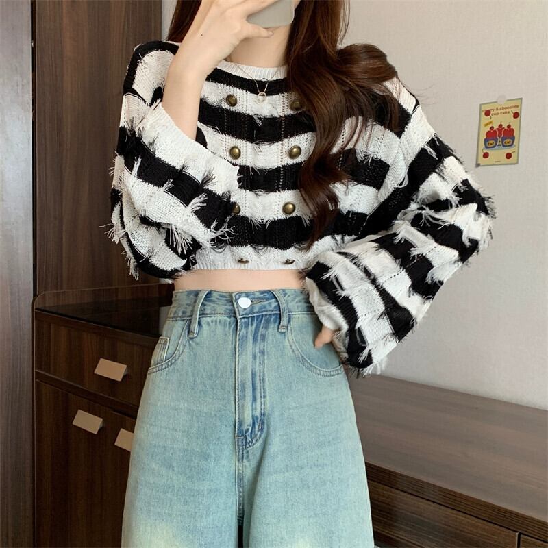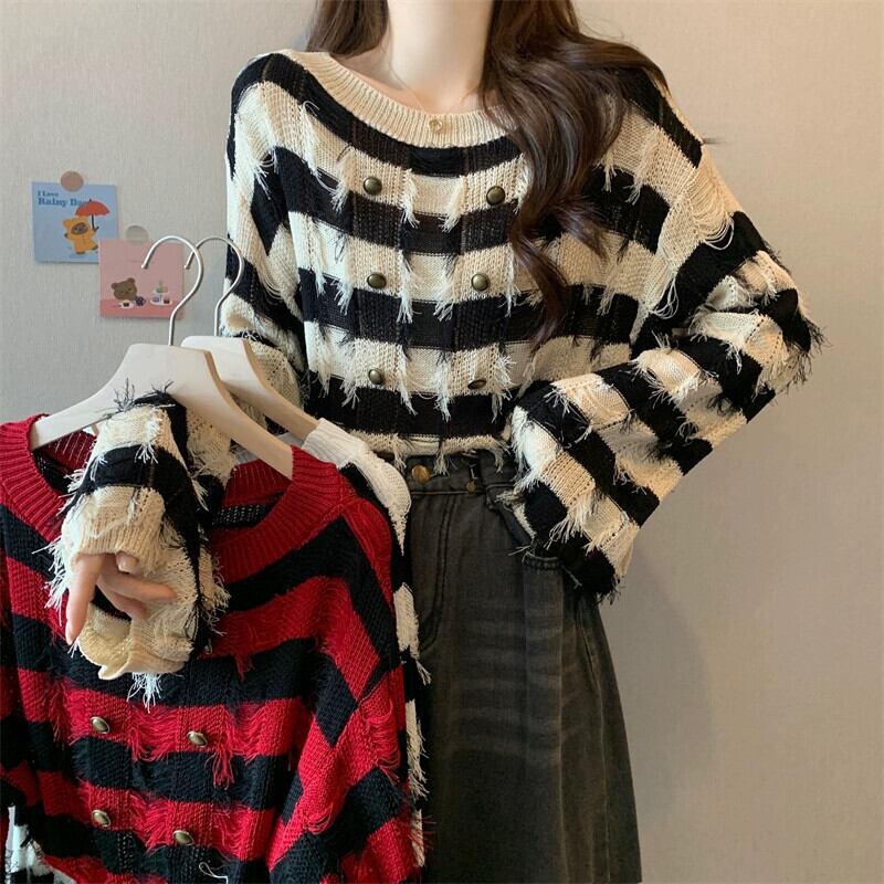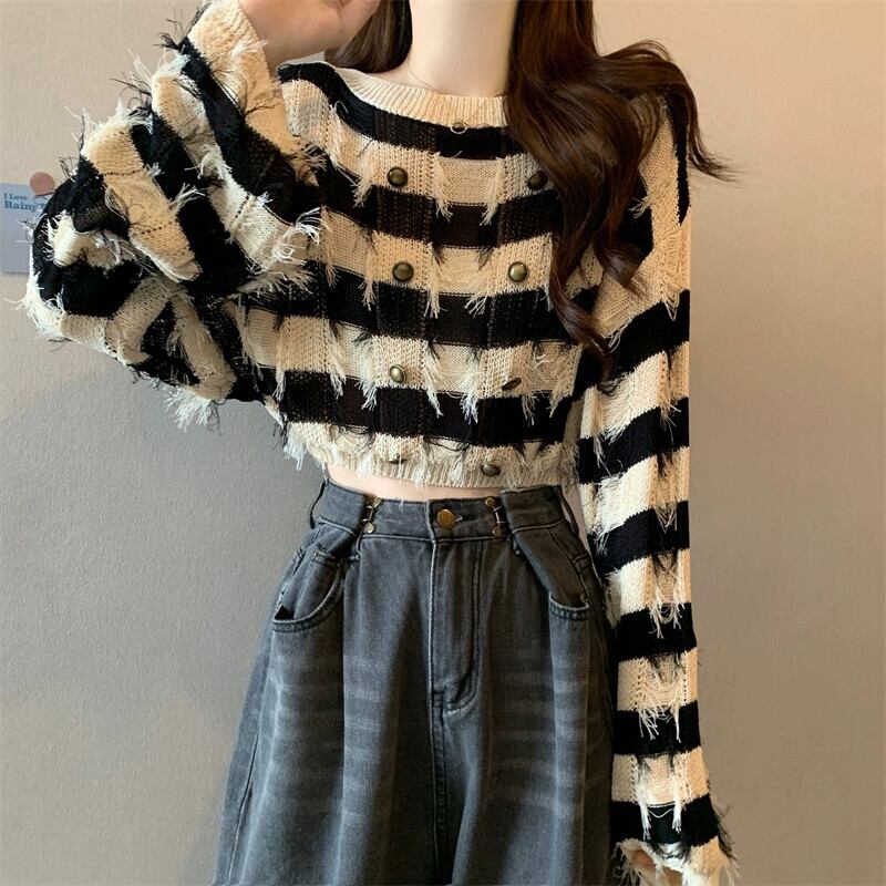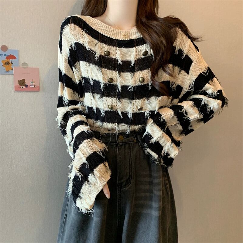 ショートフリンジストライプセーター女性の秋と冬の 2023 新しいデザインルーズアウターウェアトランペット長袖セーター ロング オータム 秋物 ウィンター 冬物 7460021332112846 | framboise21