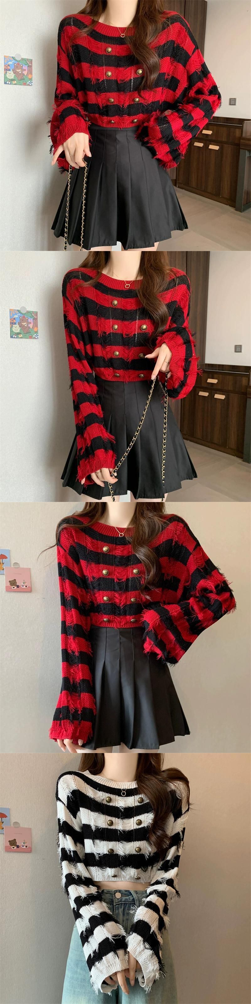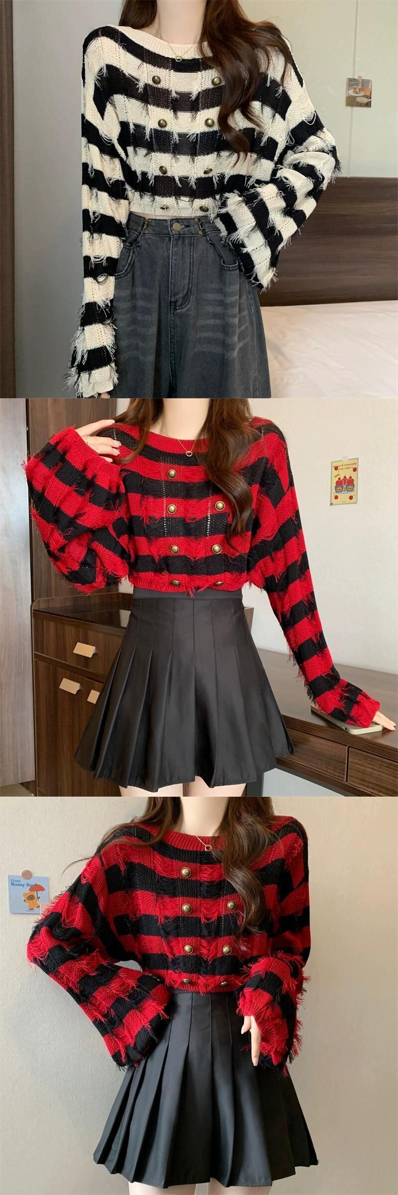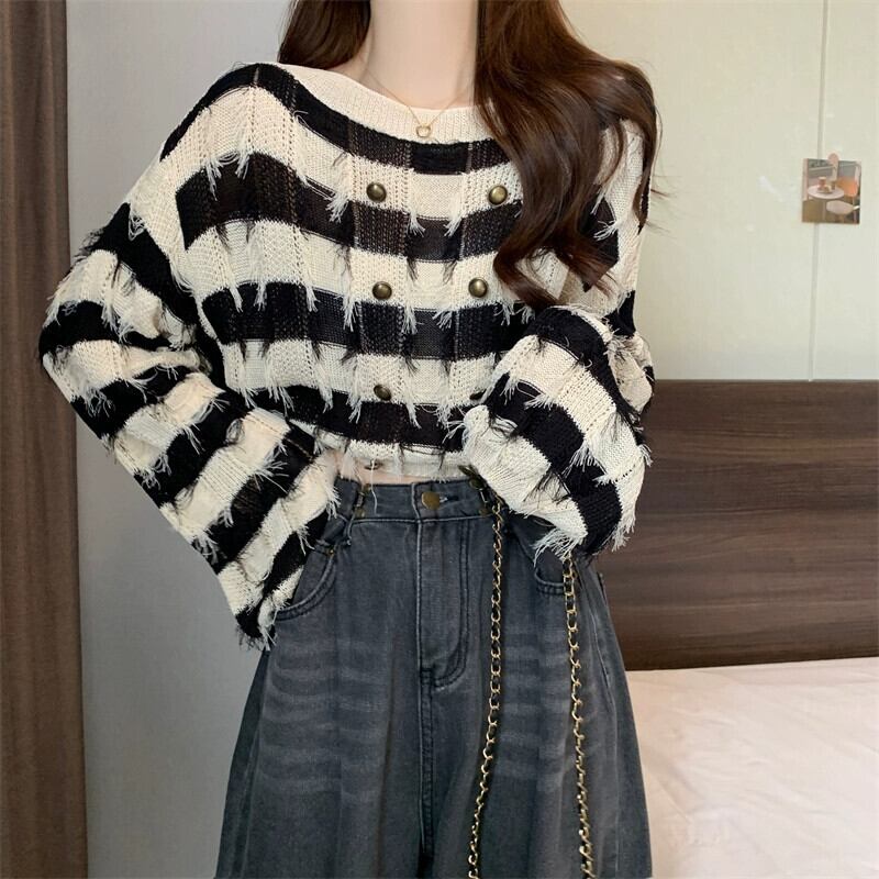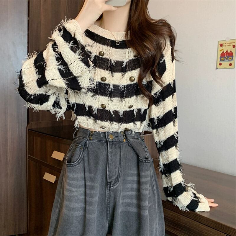 ショートフリンジストライプセーター女性の秋と冬の 2023 新しいデザインルーズアウターウェアトランペット長袖セーター ロング オータム 秋物 ウィンター 冬物 7460021332112846 | framboise21