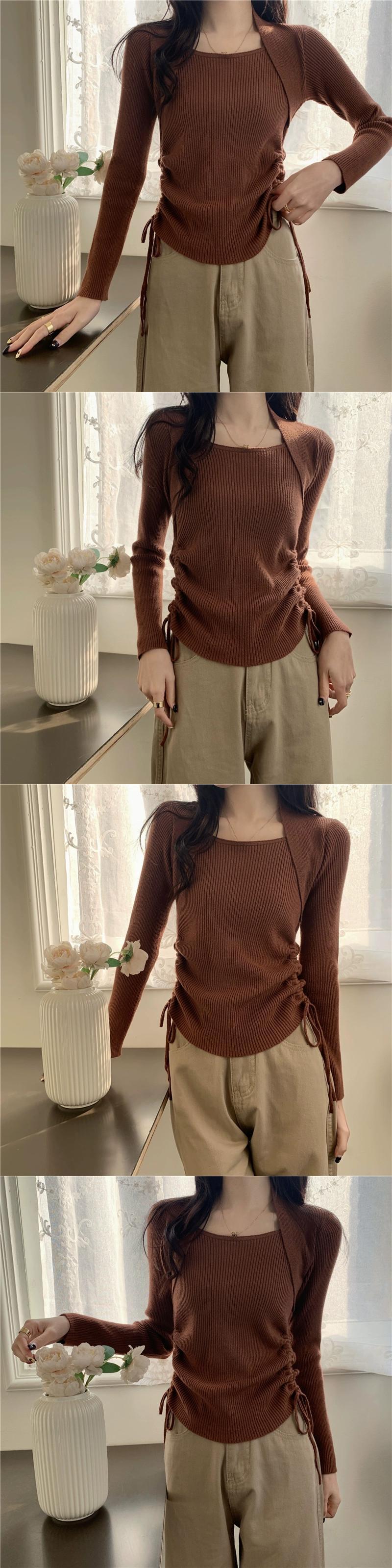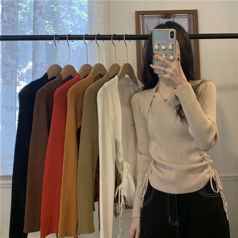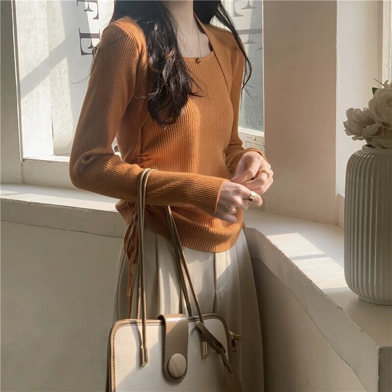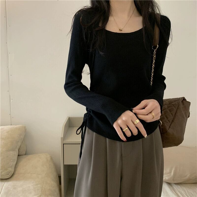 鎖骨スクエアネックニットボトムシャツ女性の秋と冬のウエスタンスタイルとスリムフィットの内側に不規則な巾着ショートセーターが付いています オータム 秋物 ウィンター 冬物 スクウェア 7460040350548590 | framboise21