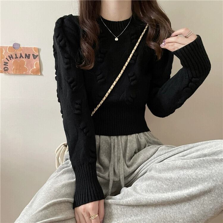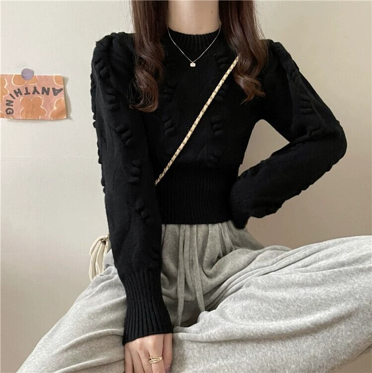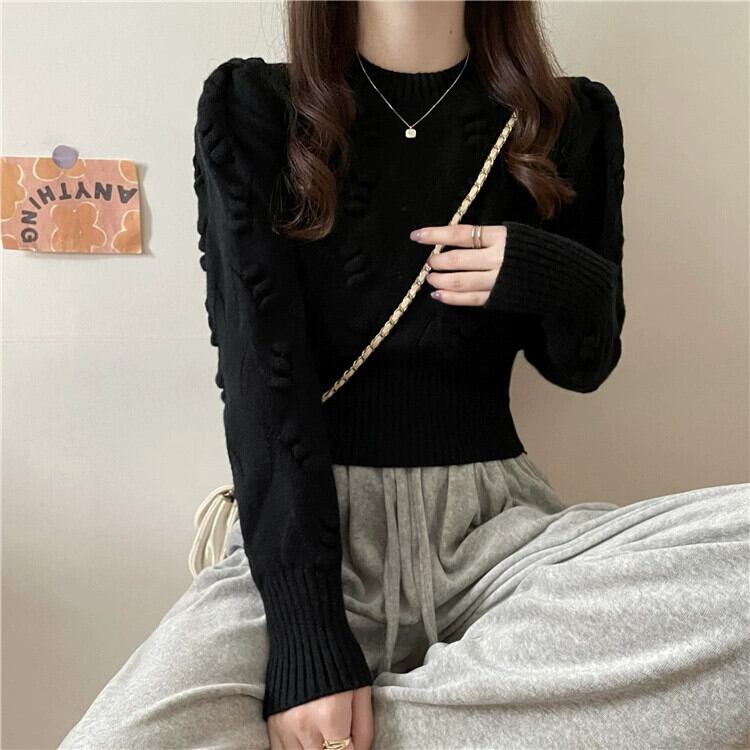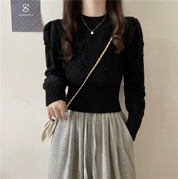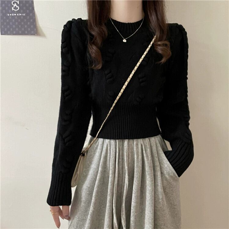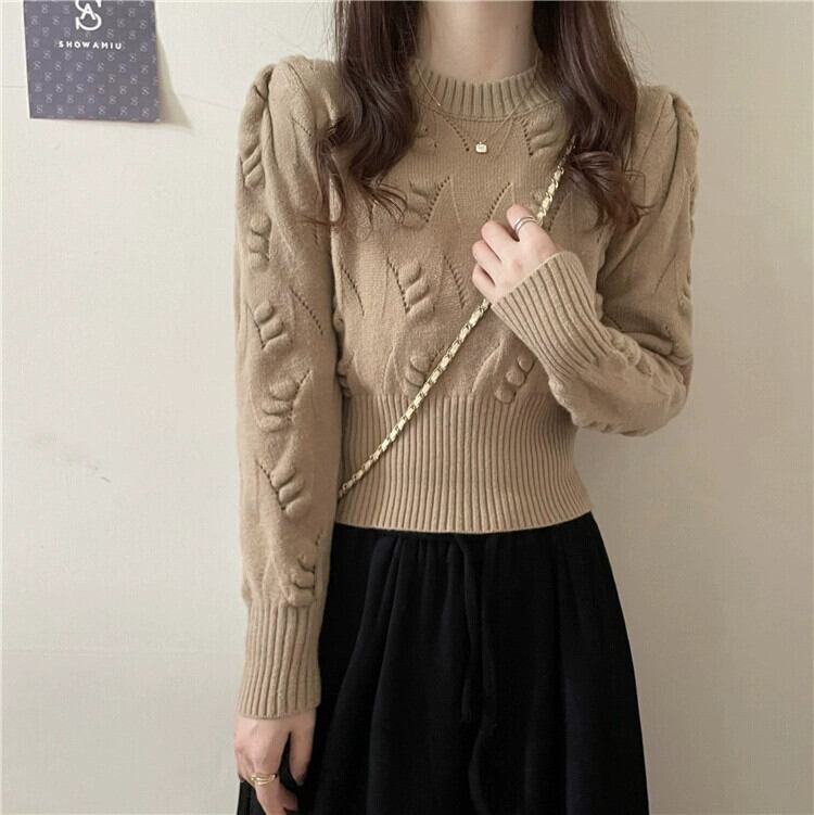 カーキショートセーターレディース秋と冬のレトロなデザインの小さなスリムフィットパフ長袖ニットトップ ロング オータム 秋物 ウィンター 冬物 7460041109760111 | framboise21