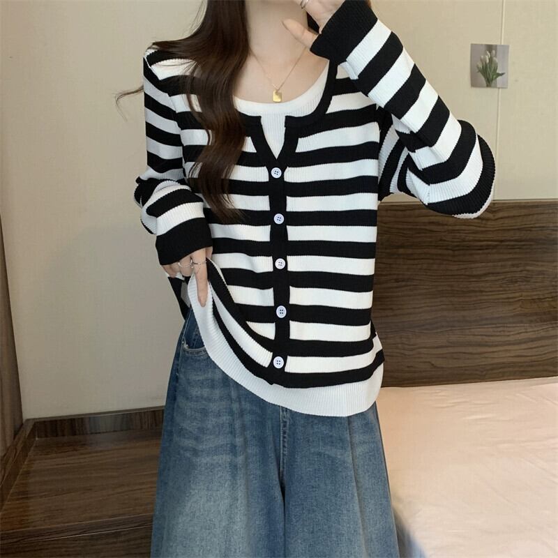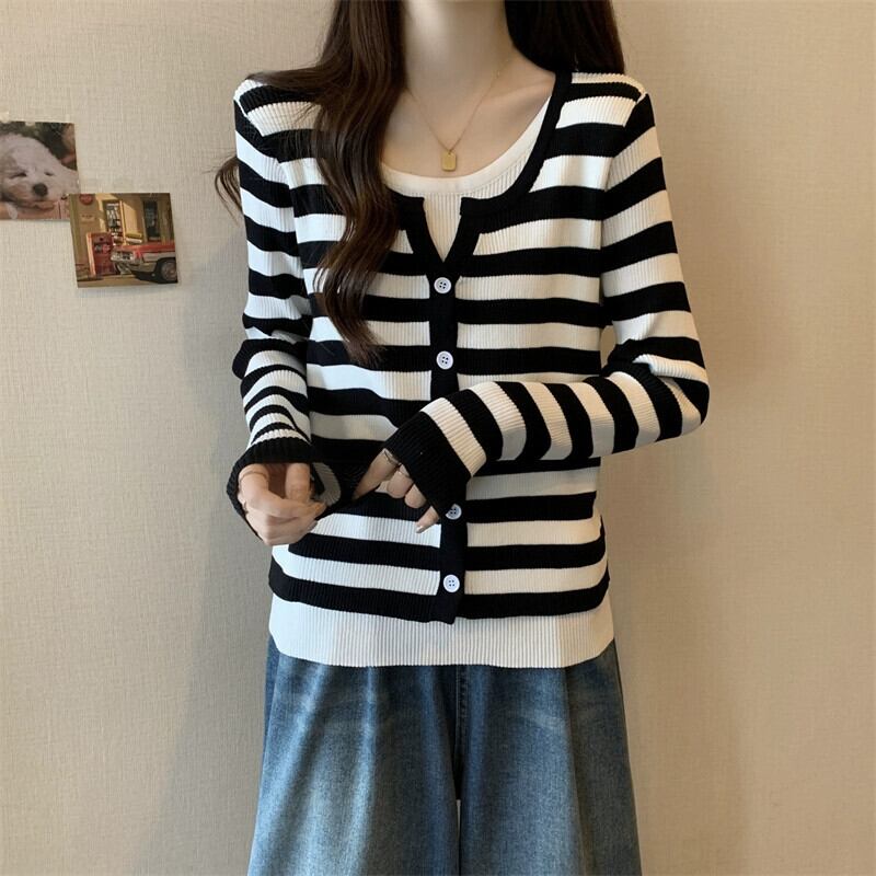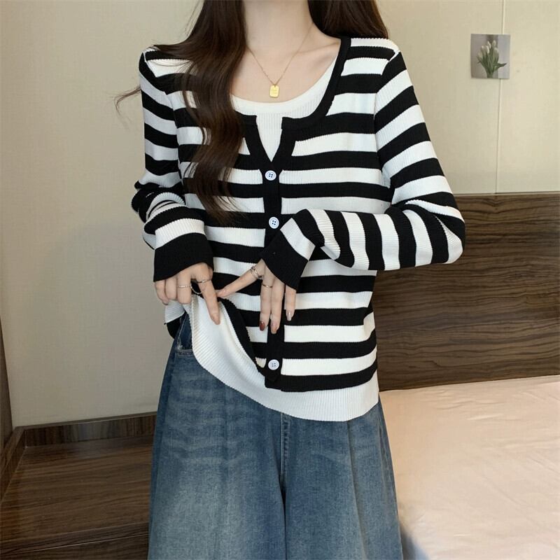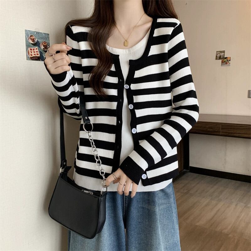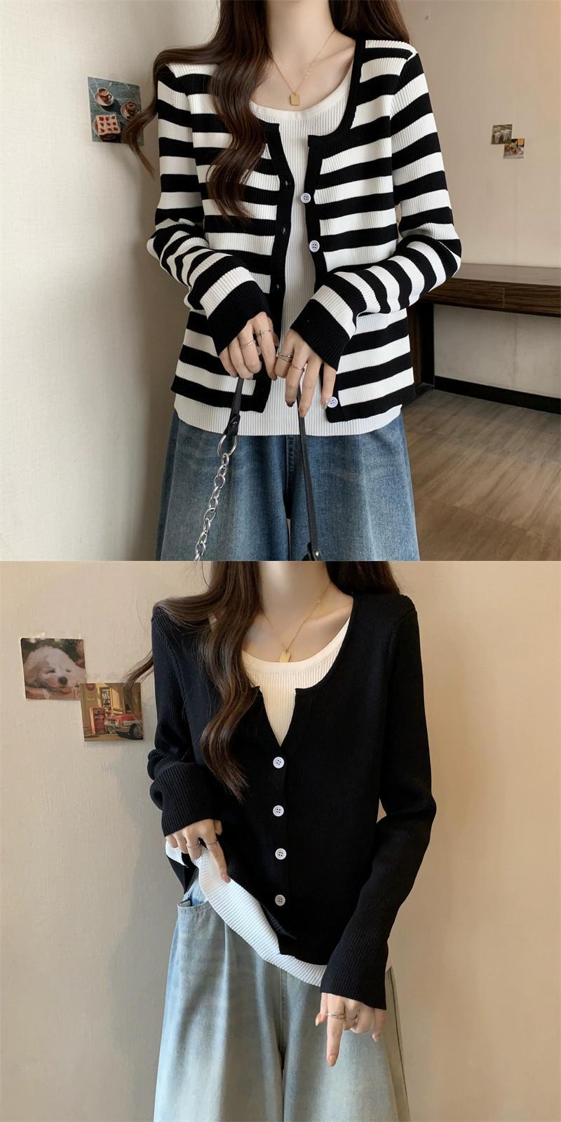 秋冬のフェイクツーピースストライプニットカーディガンジャケットレディース、ファッショナブルでスリム、多用途の長袖セーターアウター ロング オータム 秋物 ウィンター 冬物 7460073160248931 | framboise21