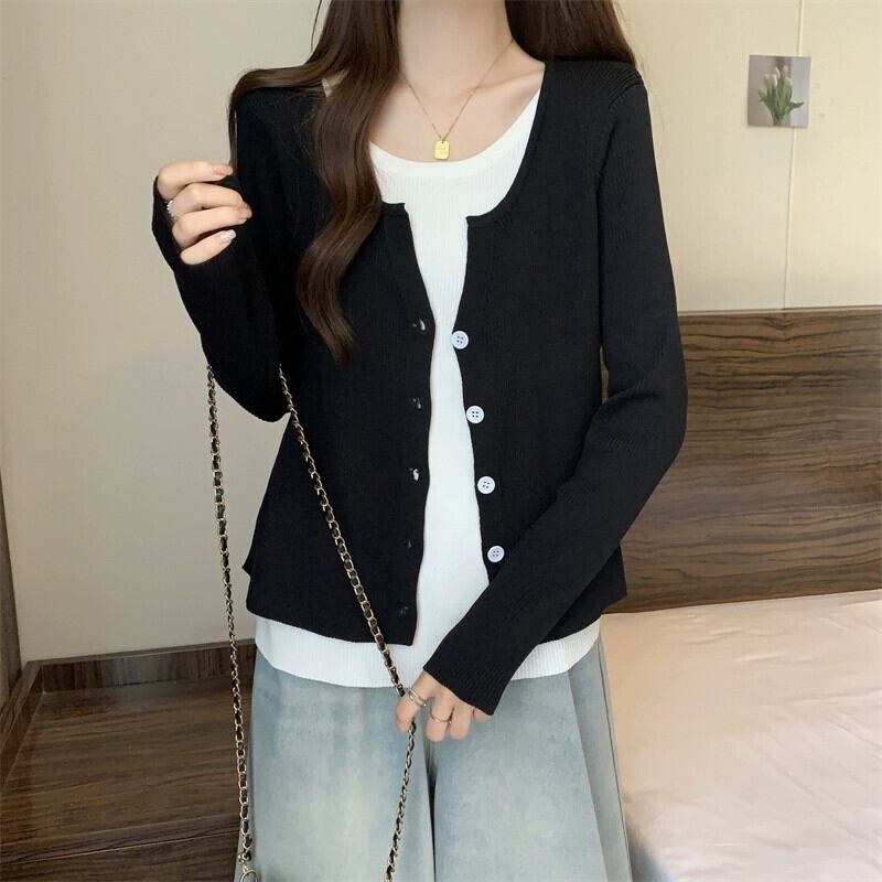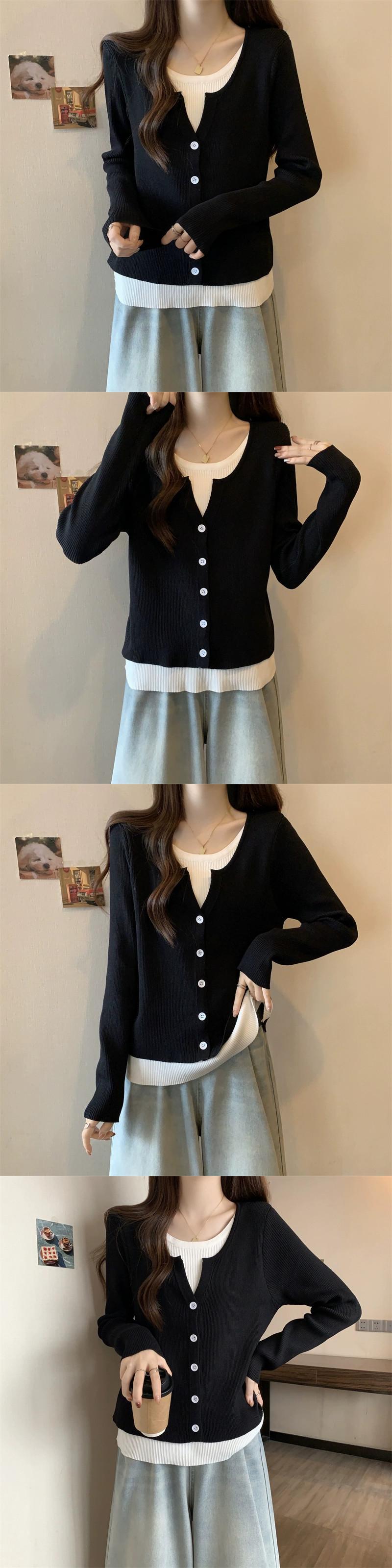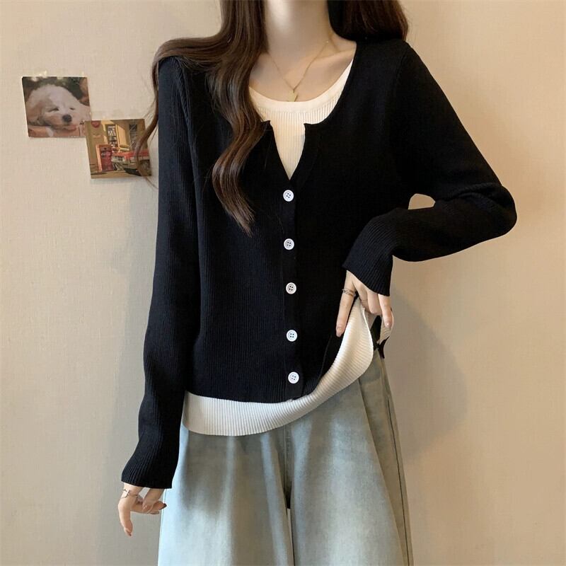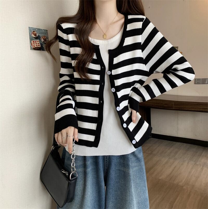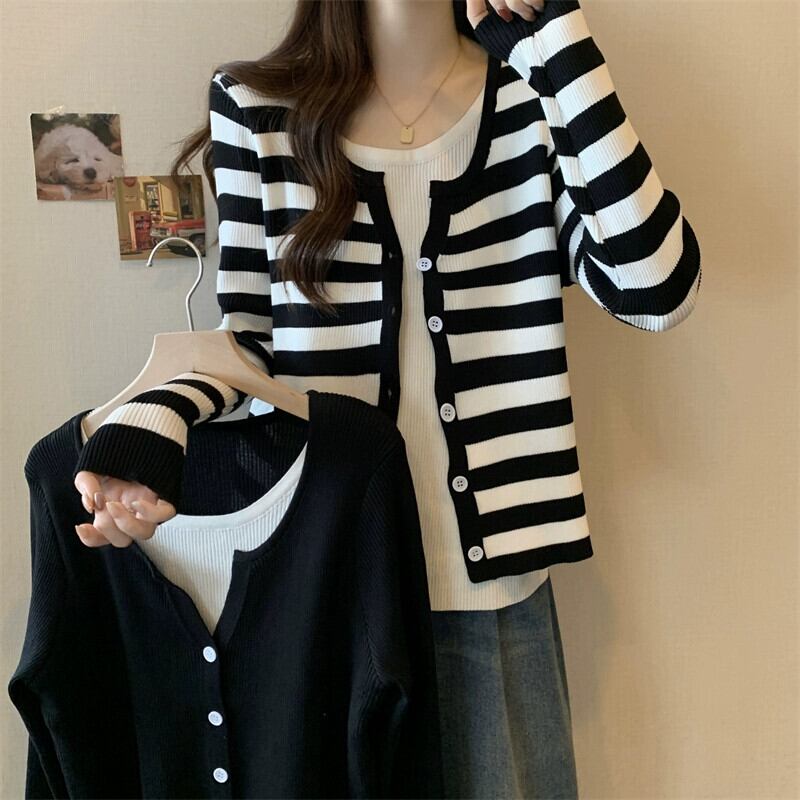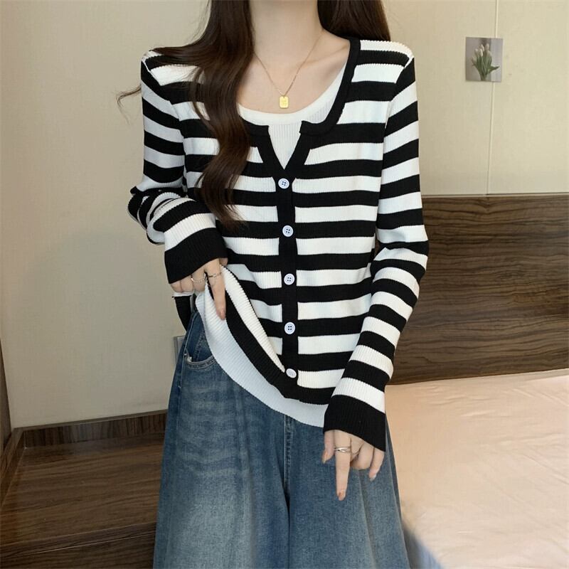 秋冬のフェイクツーピースストライプニットカーディガンジャケットレディース、ファッショナブルでスリム、多用途の長袖セーターアウター ロング オータム 秋物 ウィンター 冬物 7460073160248931 | framboise21