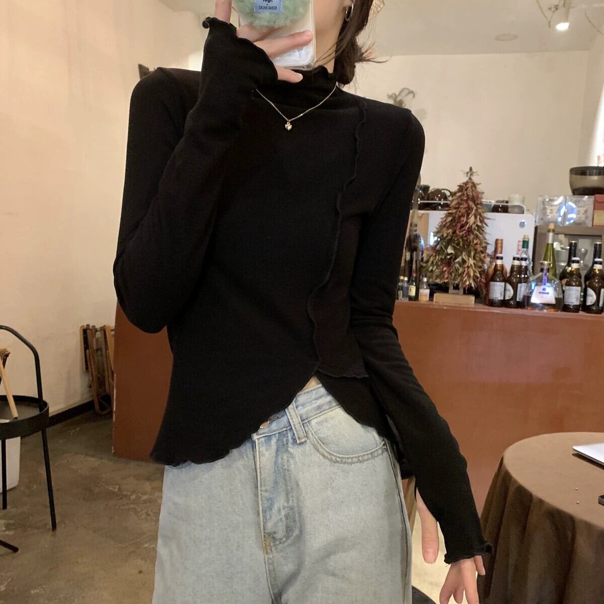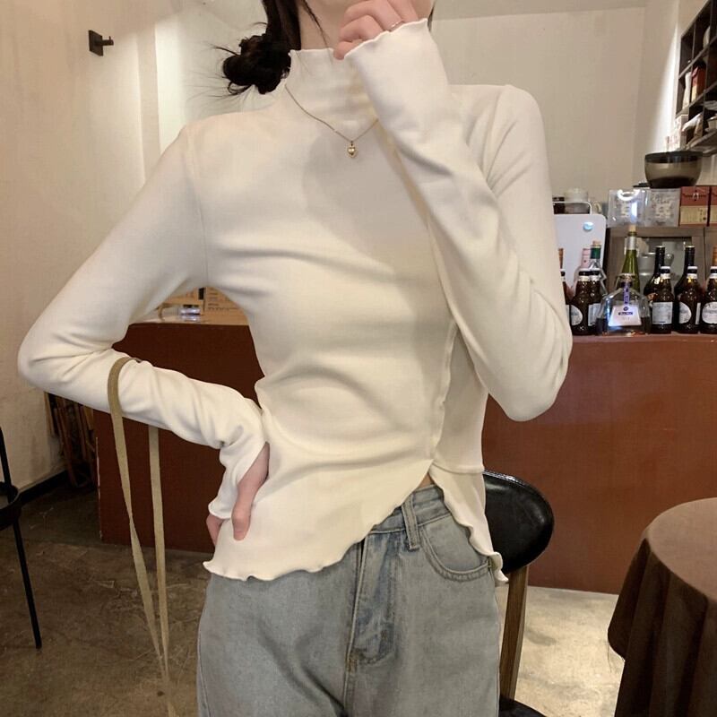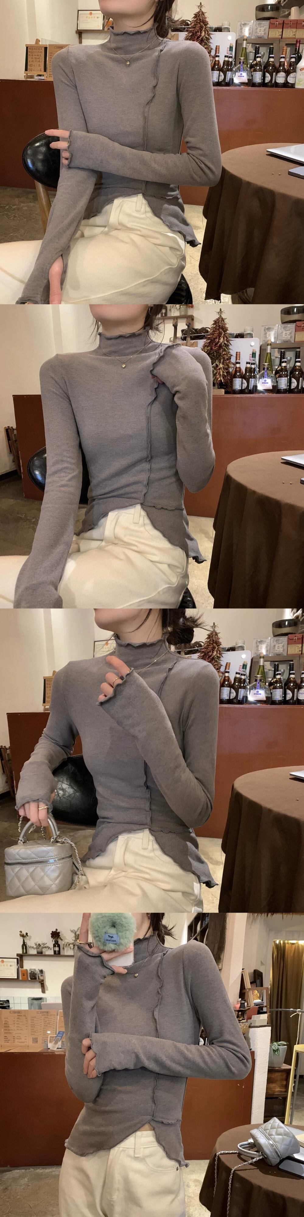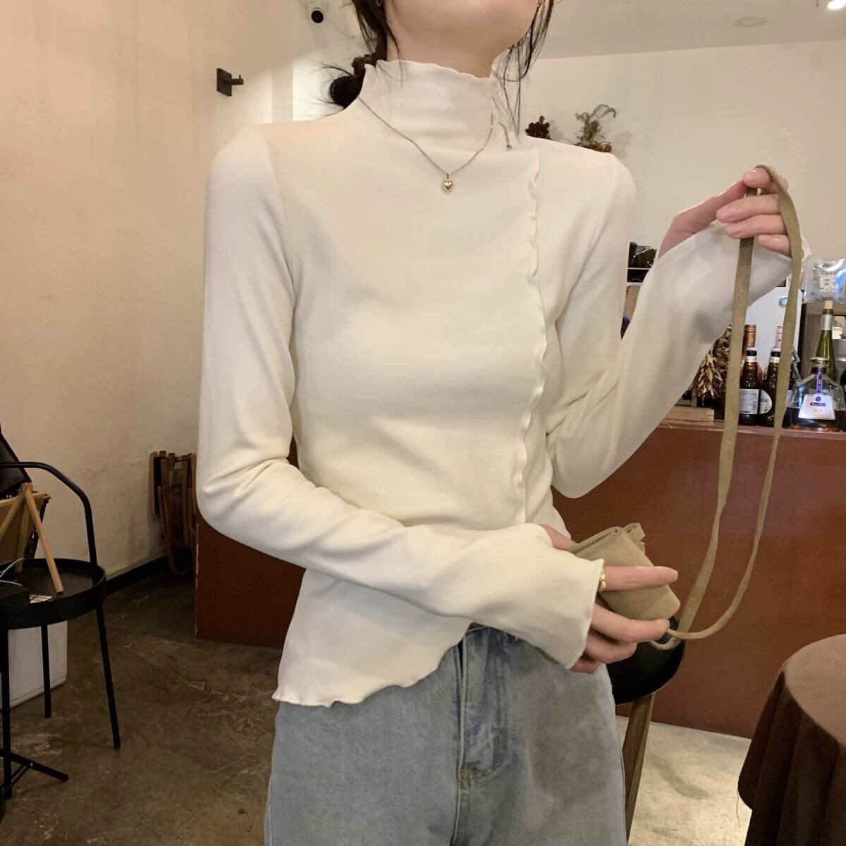 女性の秋と冬のファッショナブルな、スリムで不規則な長袖 T シャツ、内側にドイツ製ベルベットの耳裾ハイカラー ボトム シャツが付いています。 ロング オータム 秋物 ウィンター 冬物 Tシャツ 7460010255416191 | framboise21