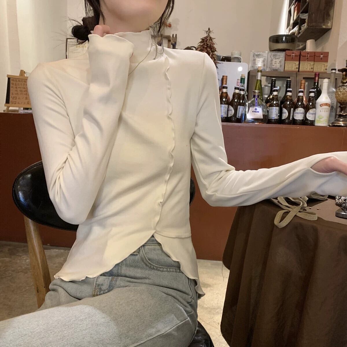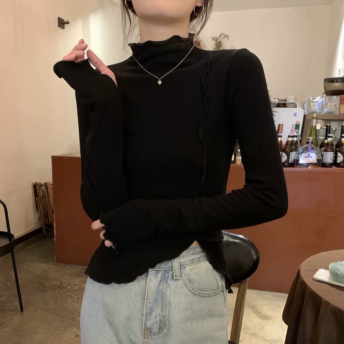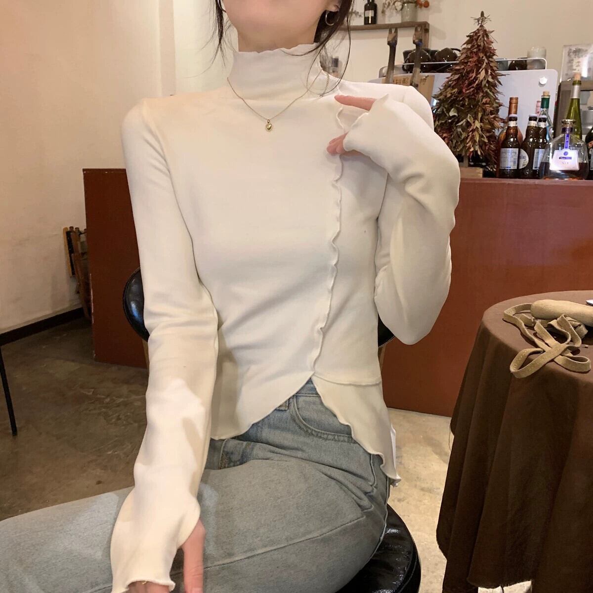 女性の秋と冬のファッショナブルな、スリムで不規則な長袖 T シャツ、内側にドイツ製ベルベットの耳裾ハイカラー ボトム シャツが付いています。 ロング オータム 秋物 ウィンター 冬物 Tシャツ 7460010255416191 | framboise21