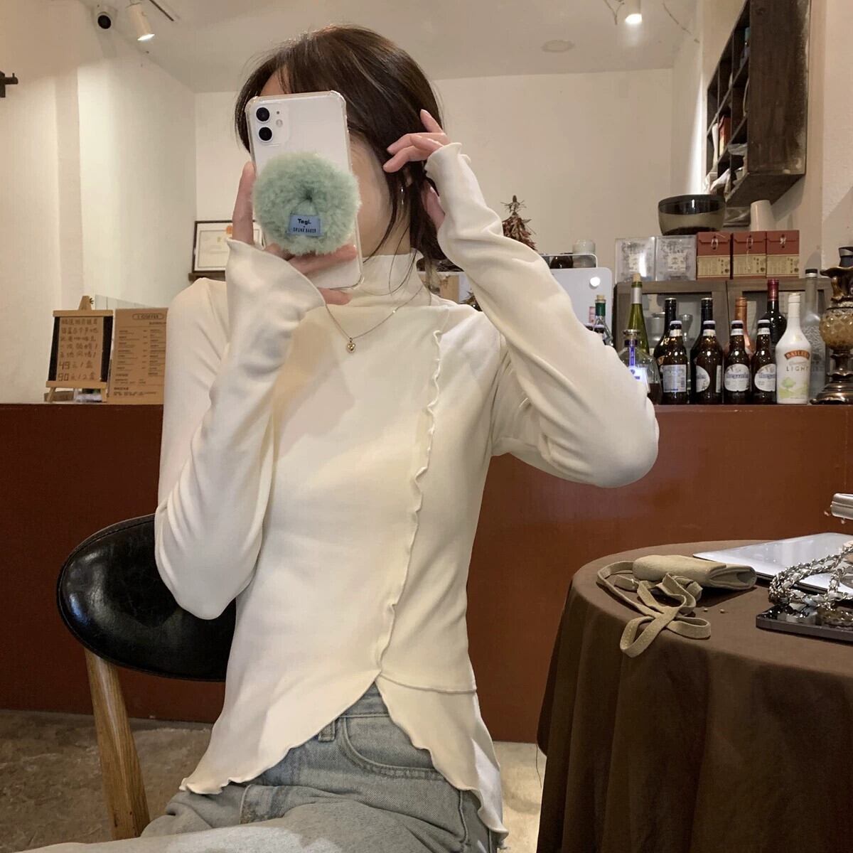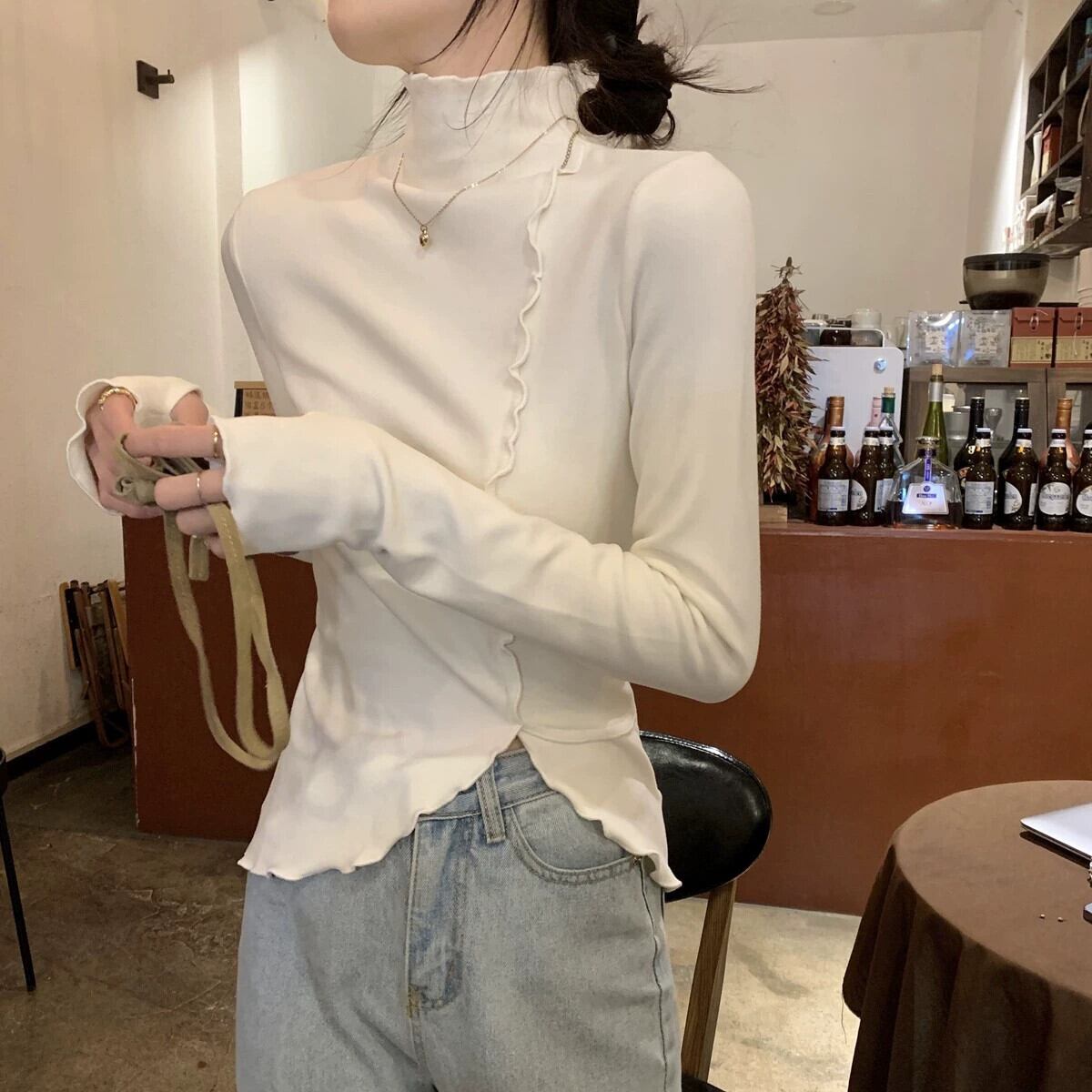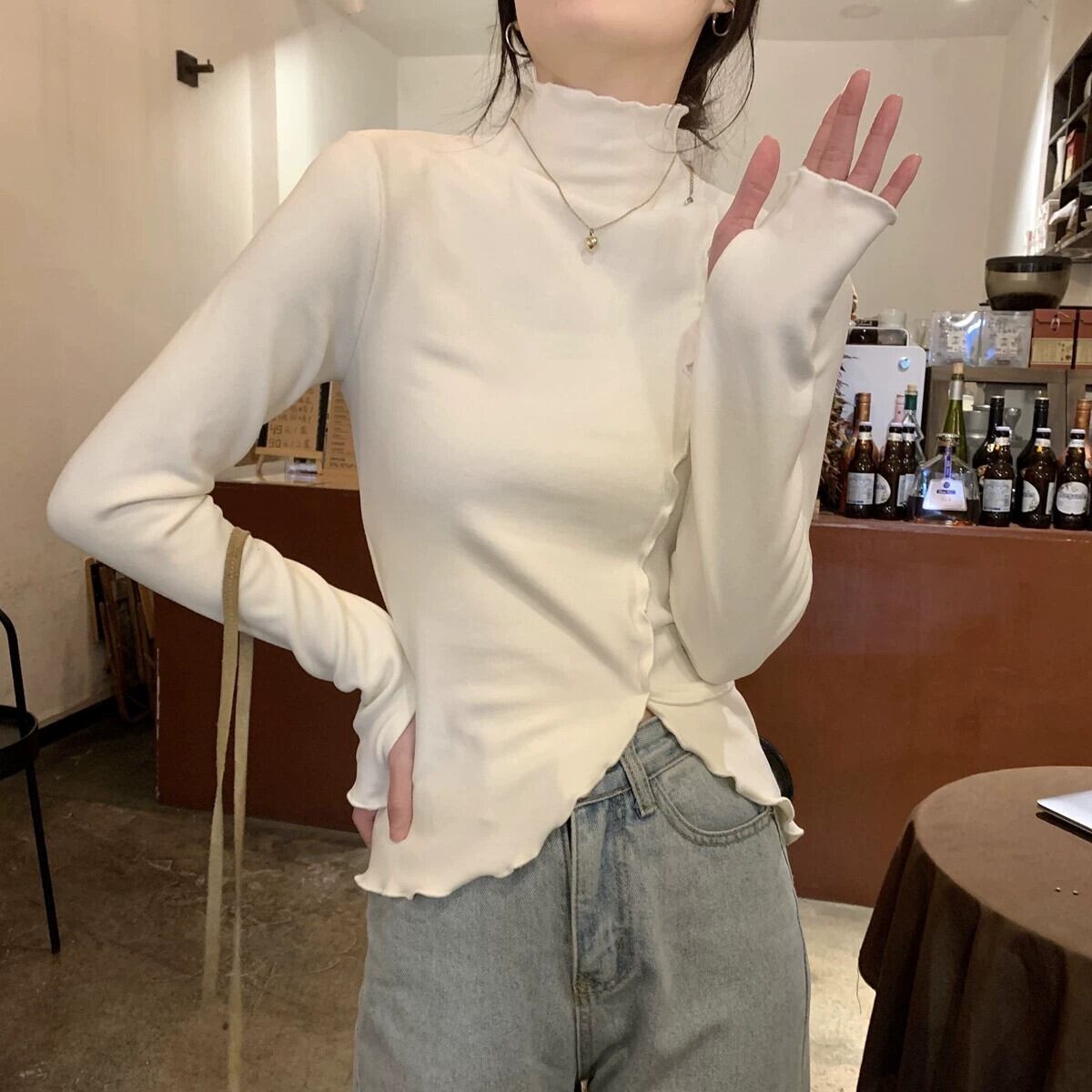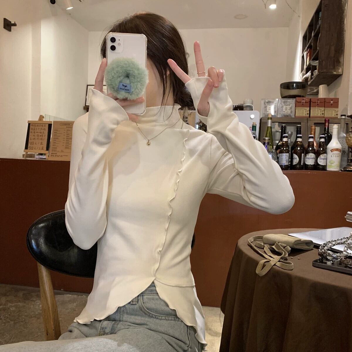 女性の秋と冬のファッショナブルな、スリムで不規則な長袖 T シャツ、内側にドイツ製ベルベットの耳裾ハイカラー ボトム シャツが付いています。 ロング オータム 秋物 ウィンター 冬物 Tシャツ 7460010255416191 | framboise21